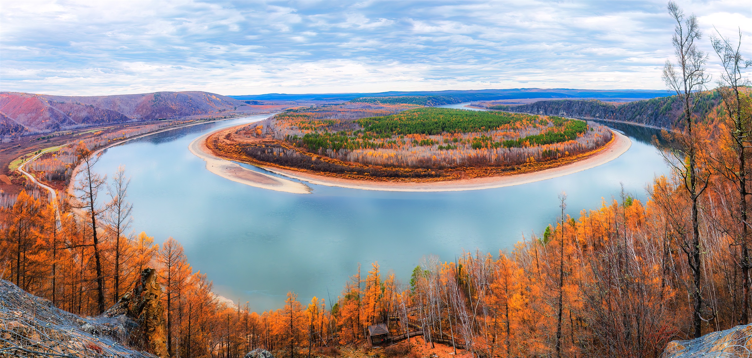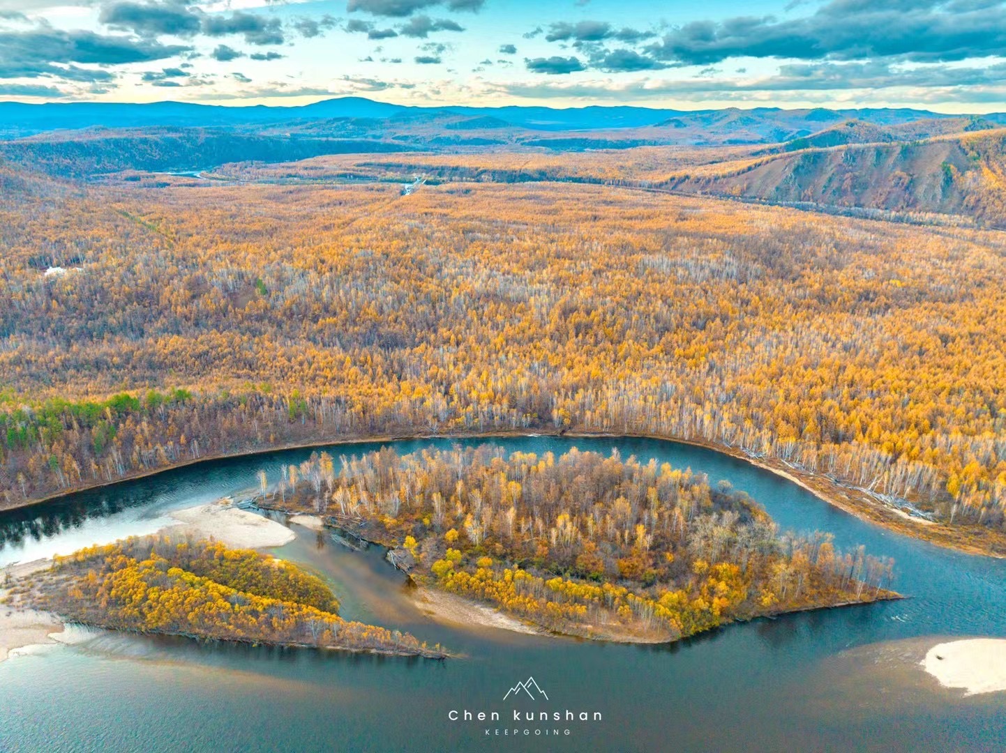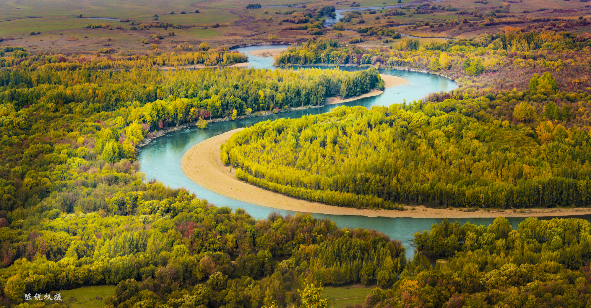 7.龙江第一湾:黑龙江绕岛形成的 Ω 形弯道,山水相依,秋日色彩层次丰富。