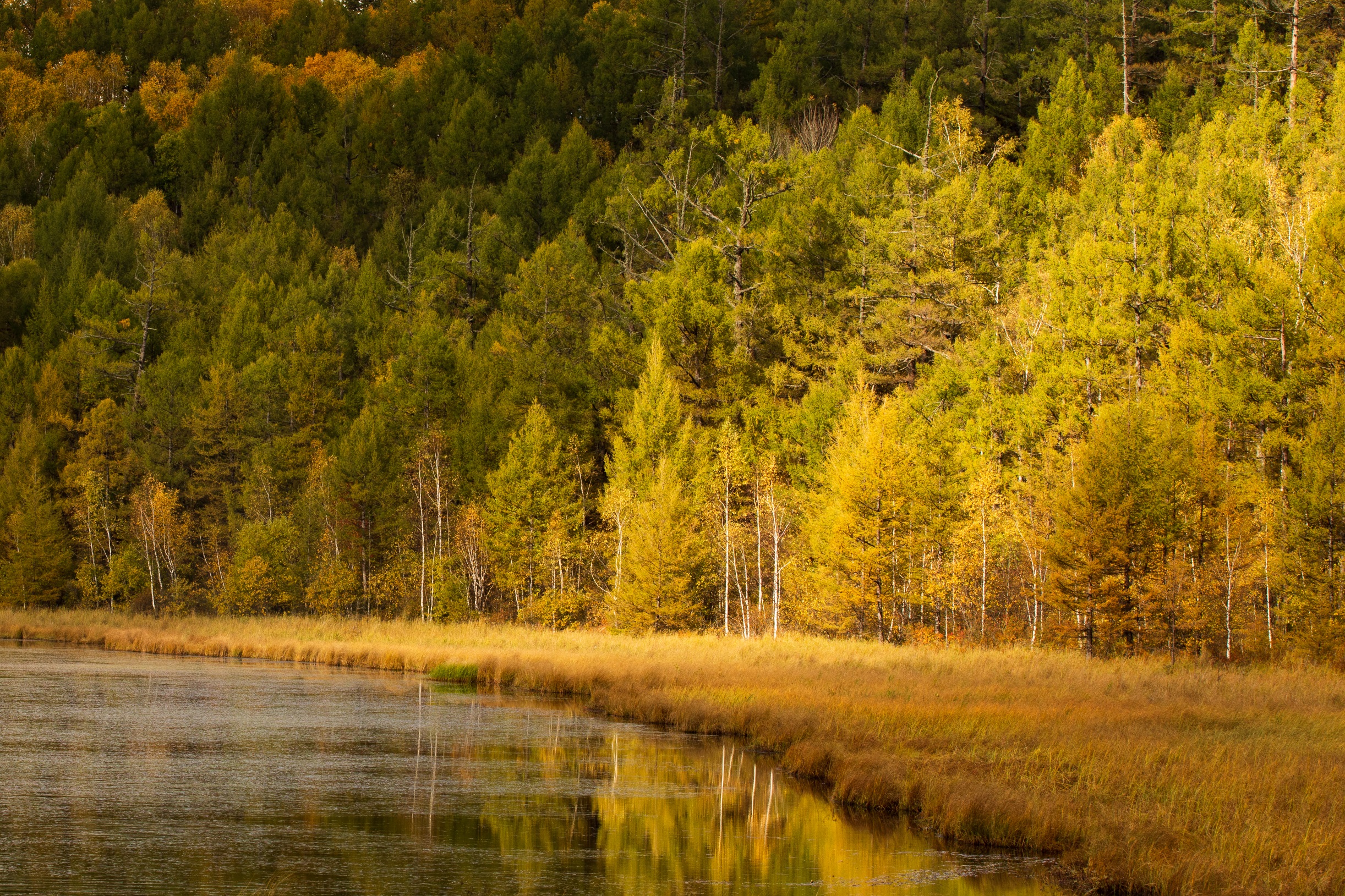 9 月的大兴安岭,是上帝打翻的调色盘 —— 白桦披金、松林叠翠,湿地映着绚烂晚霞;