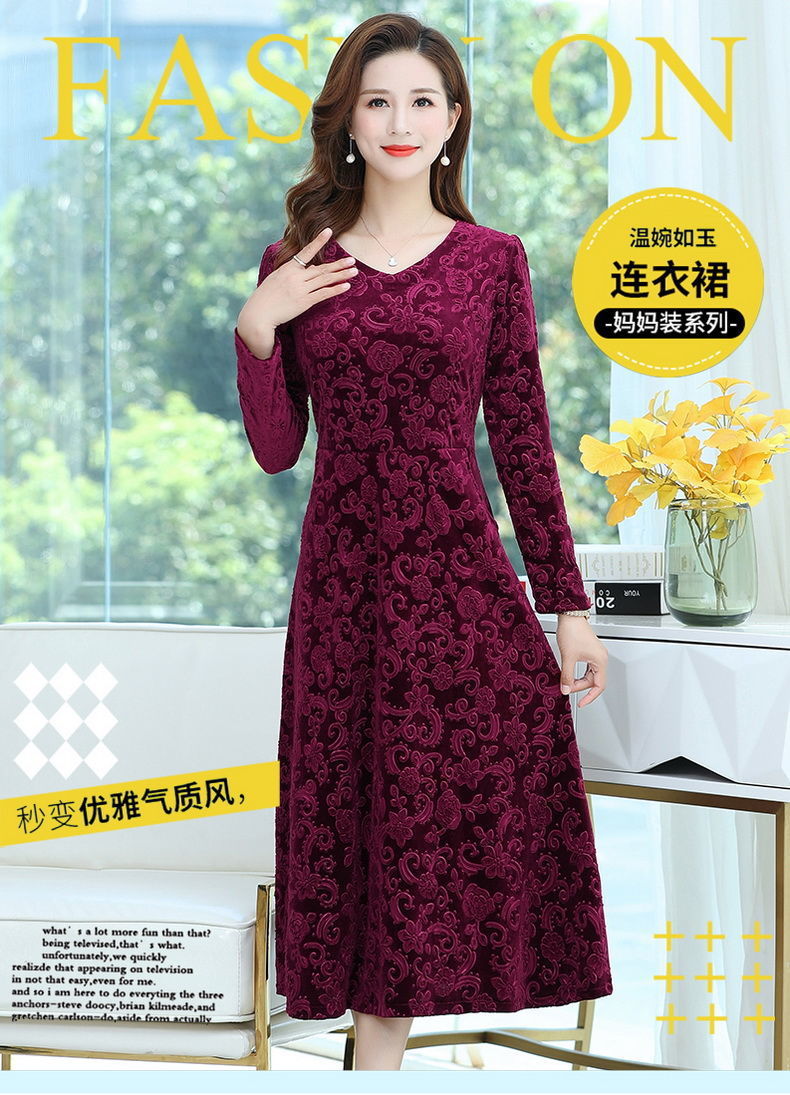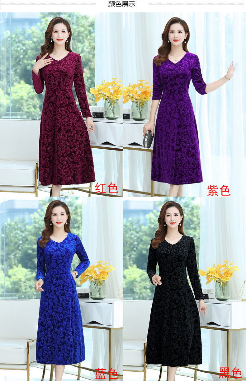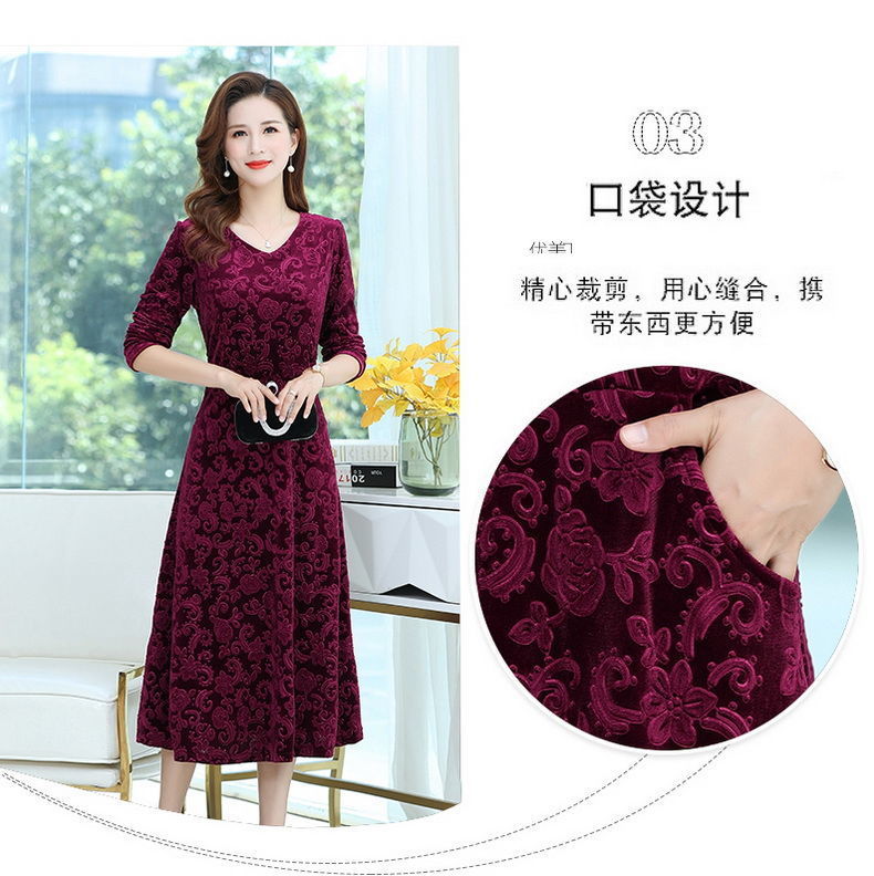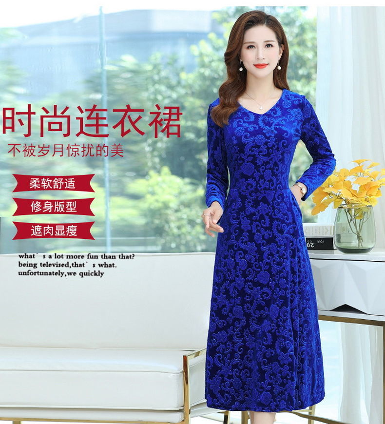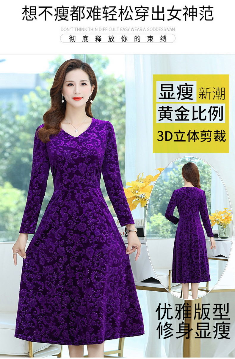 大码宽松遮肉显瘦裙中年妈妈春秋冬季金丝绒连衣裙长款过膝 ZQ9918