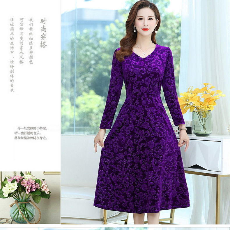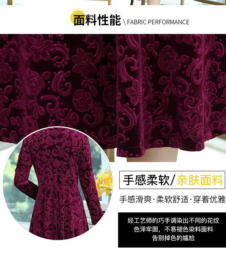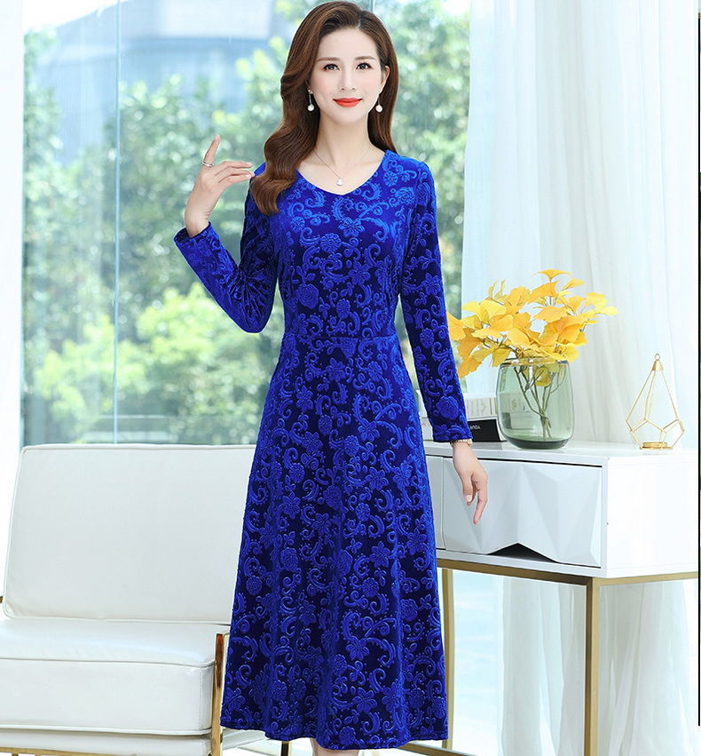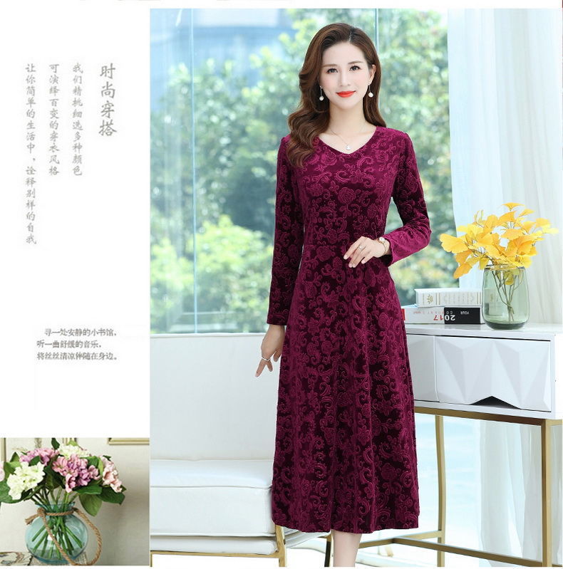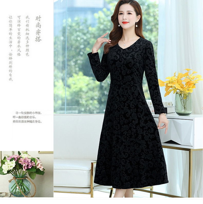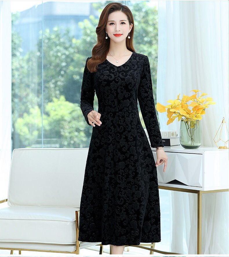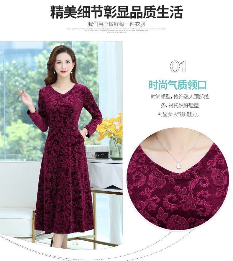 大码宽松遮肉显瘦裙中年妈妈春秋冬季金丝绒连衣裙长款过膝 ZQ9918