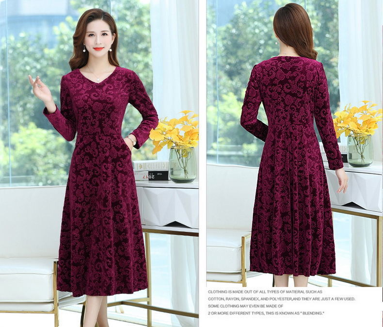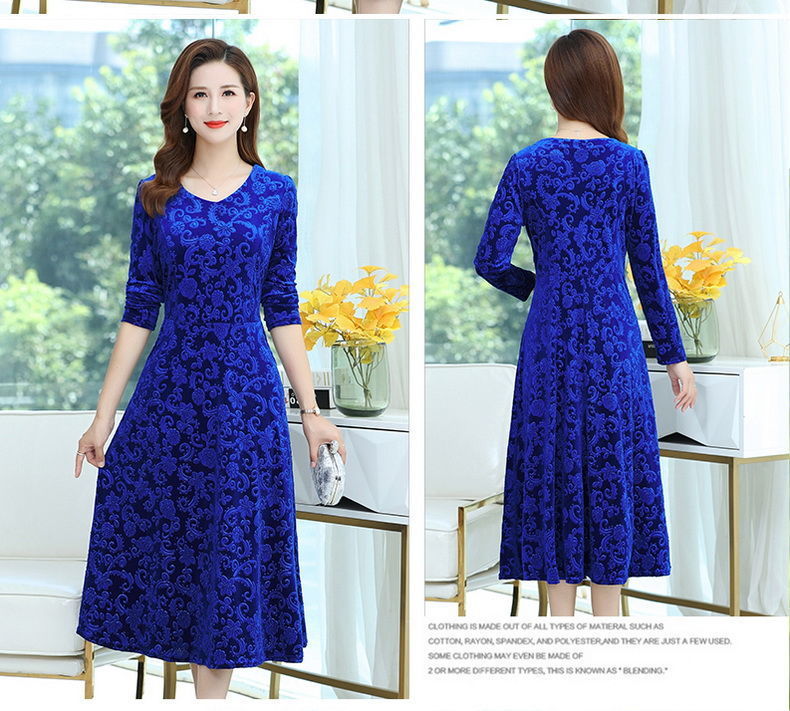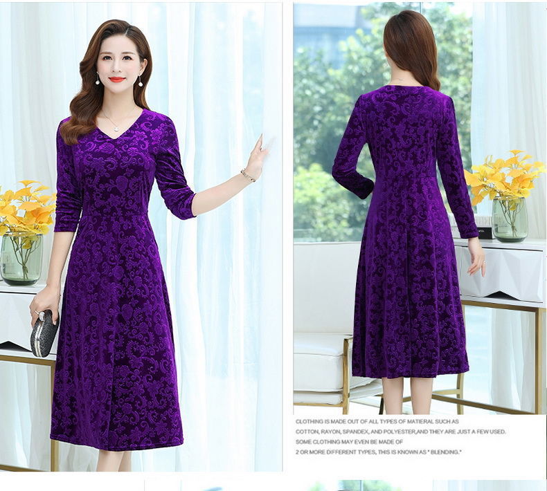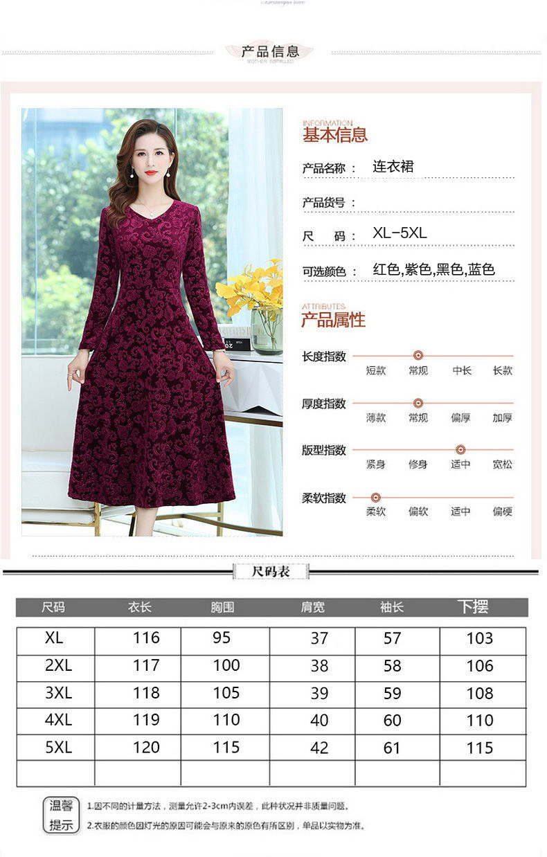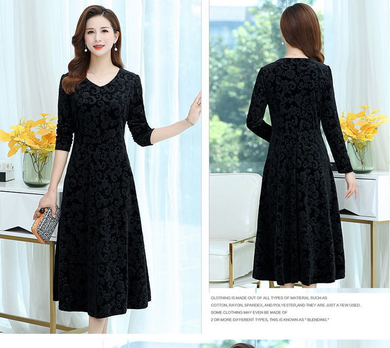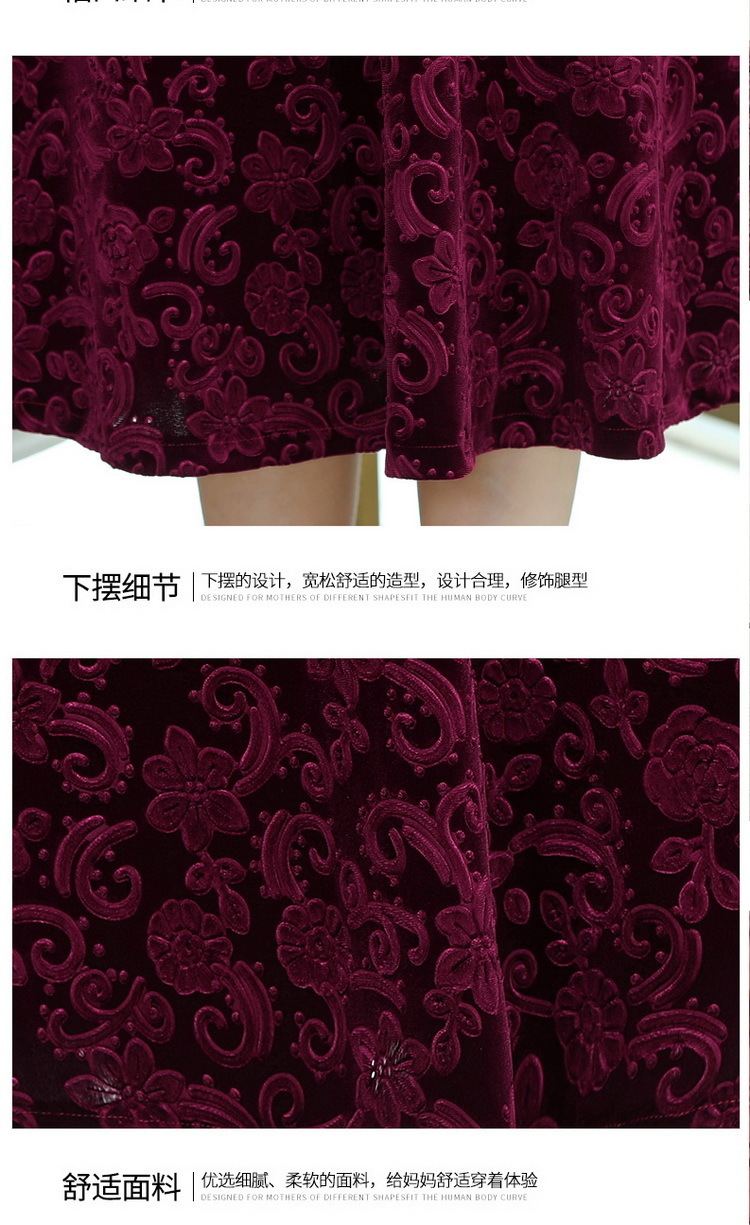 大码宽松遮肉显瘦裙中年妈妈春秋冬季金丝绒连衣裙长款过膝 ZQ9918