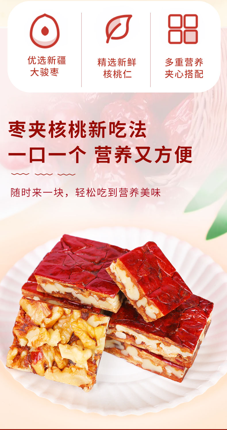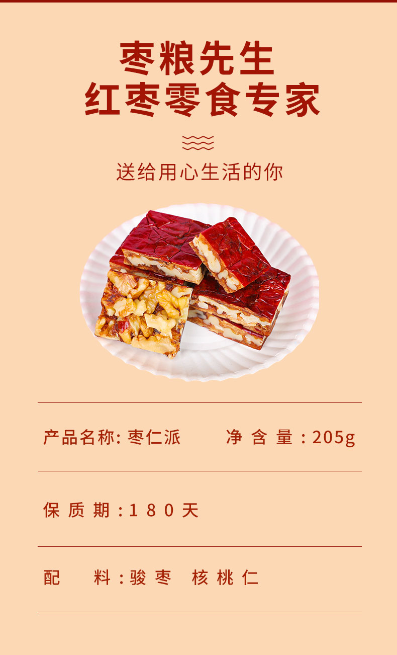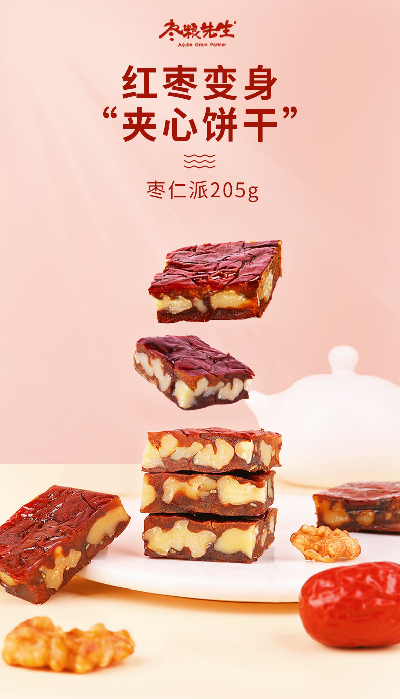 【红枣养生小零食】枣粮先生核桃枣仁派 红枣夹核桃新吃法 入口香醇有层次 香甜枣肉酥脆核桃 配料简单无添加 独立真空锁鲜小包装 开袋即食 205g/包