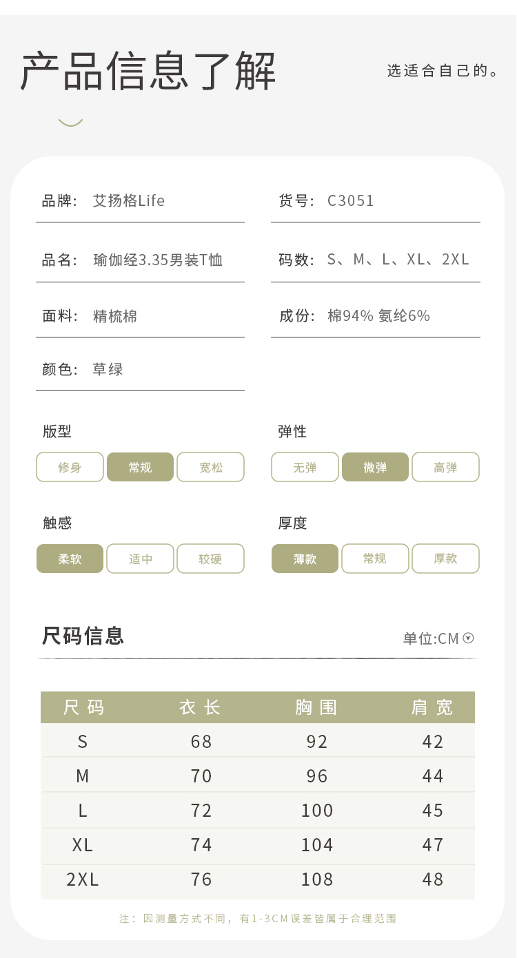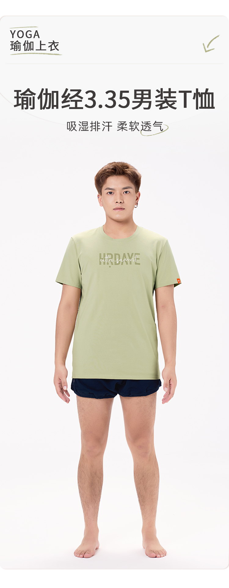 艾扬格 life C3051瑜伽经3.35 男装T恤 短袖 吸湿排汗 大自然草绿色