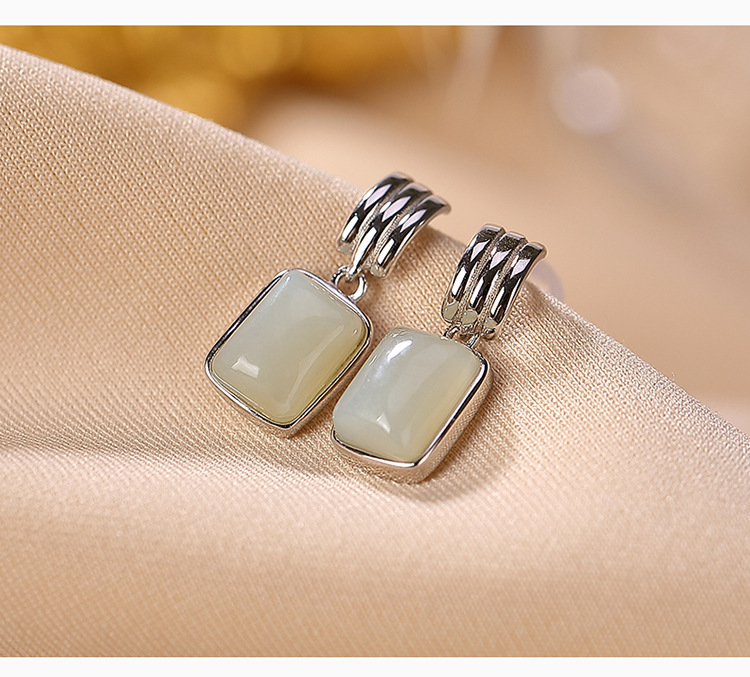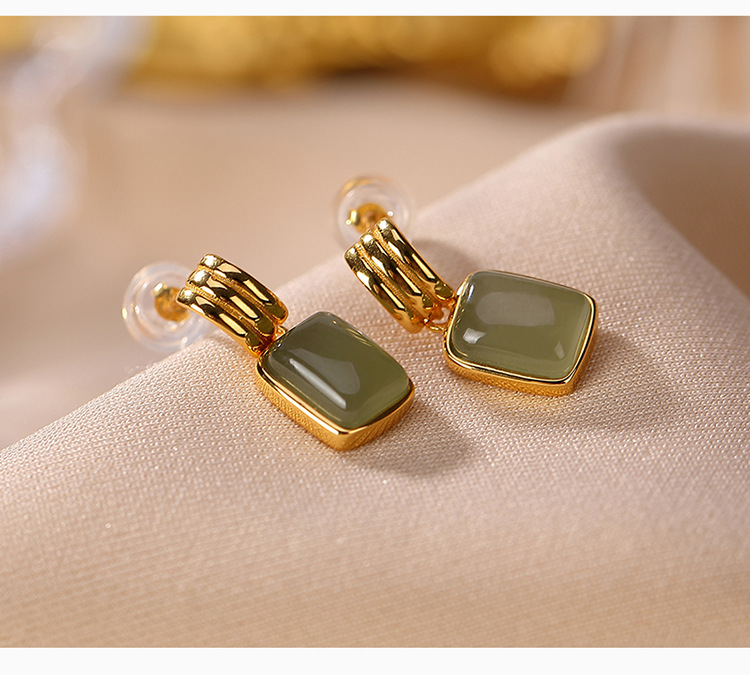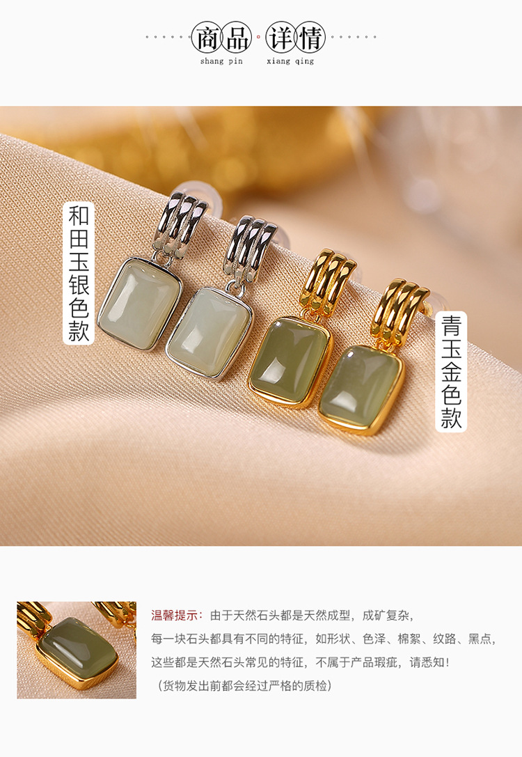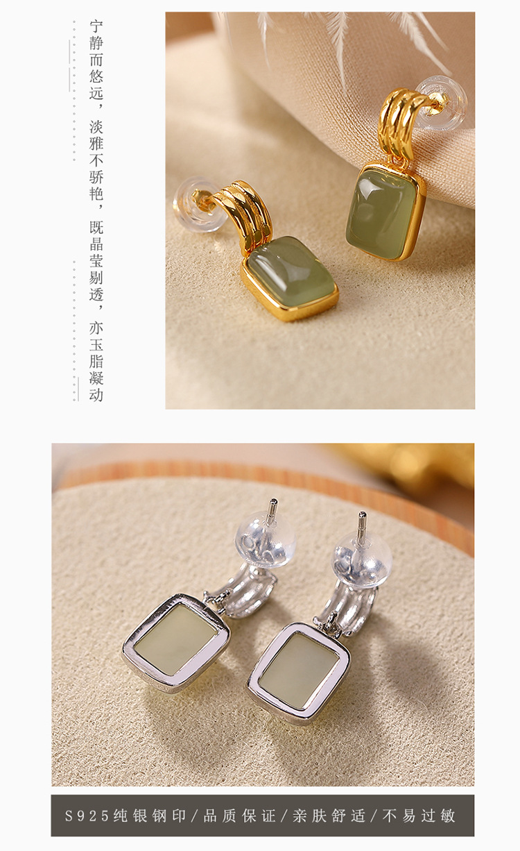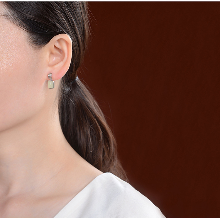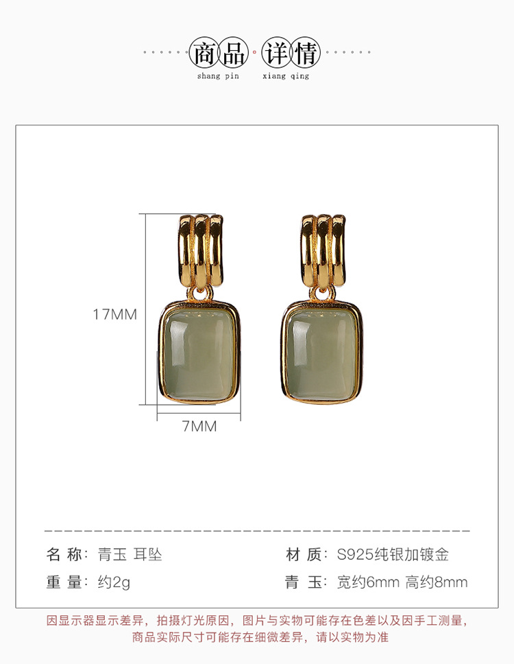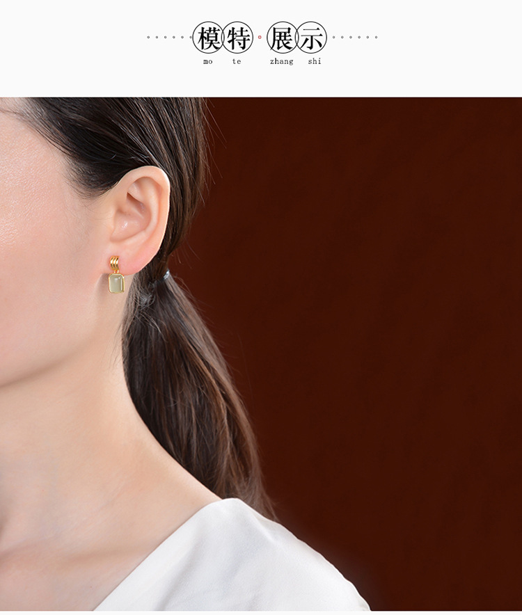 S925纯银镀金和田玉青玉耳钉个性气质几何弯管耳坠耳饰