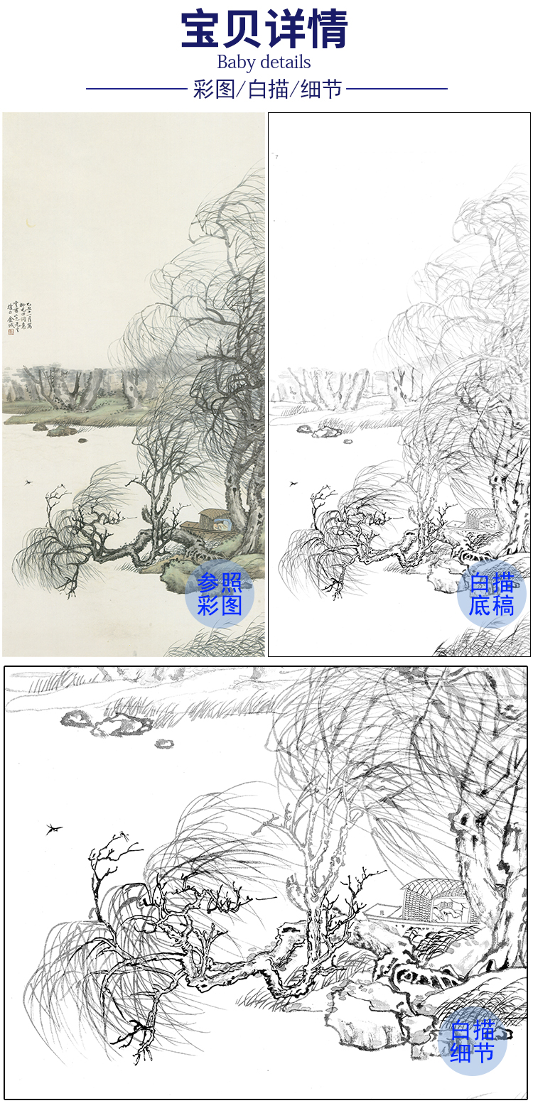 竖幅工笔画山水白描底稿-金城-《柳屯田词意图》-多种白描尺寸可选-JS08