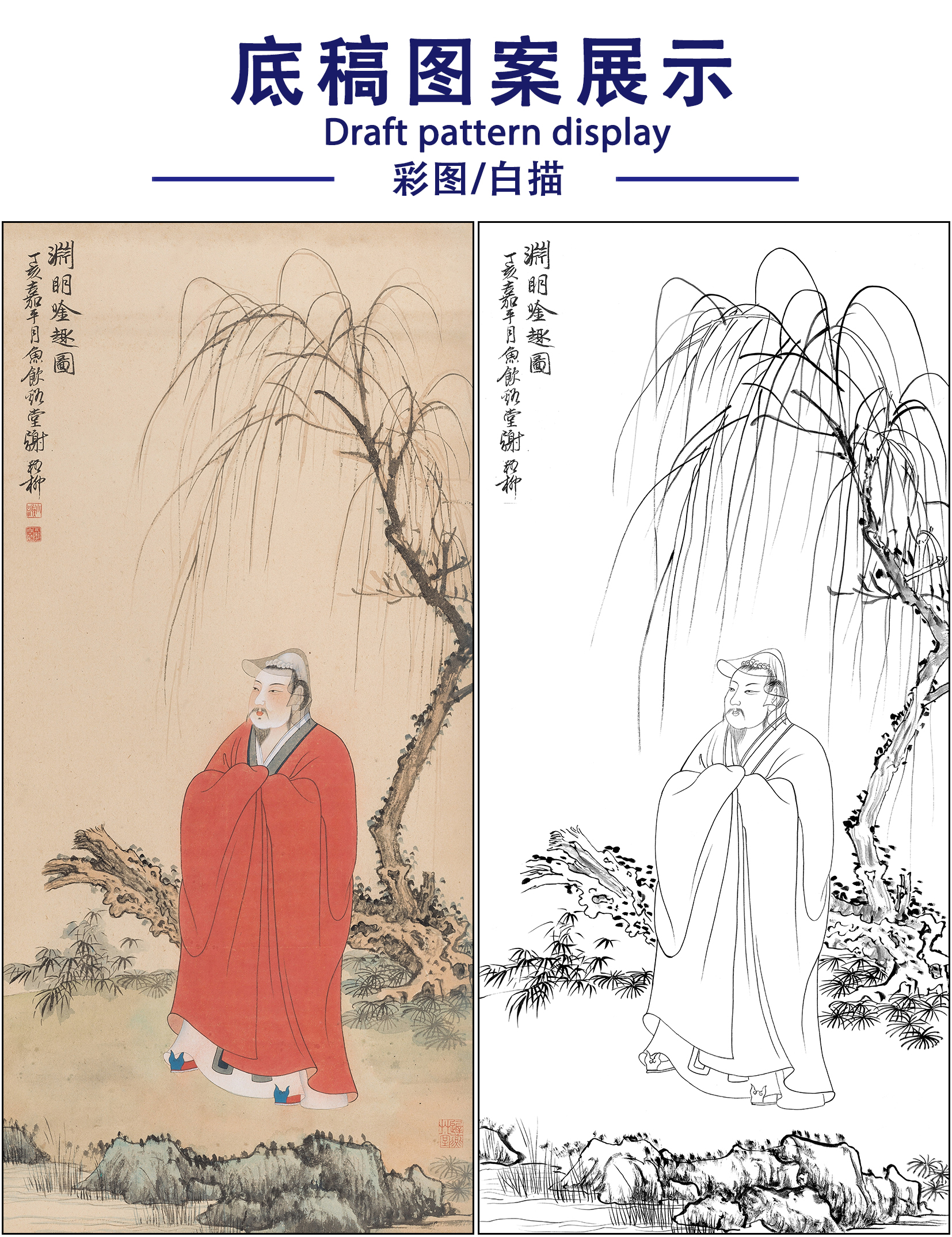 谢稚柳人物工笔画白描底稿《渊明吟趣图》临摹勾线高清打印稿XZ26