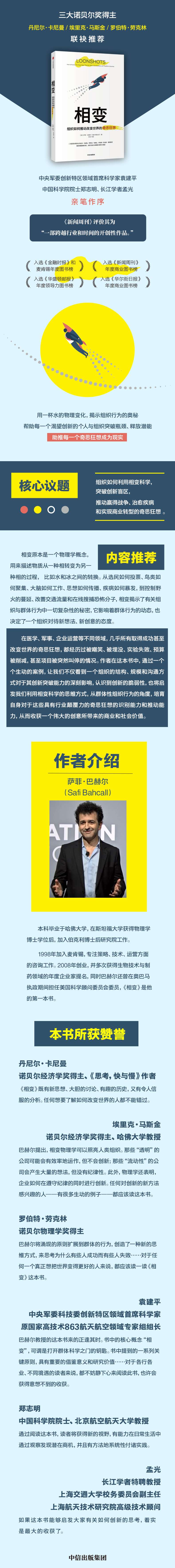 作者既有物理学教育背景,又有生物医药的创业背景,书中涉及的每一个物理学、航天学、天文学、生物医药学知识点都经过反复论证。从治疗癌症的靶向药到二战时期青霉素、破伤风针的应用,从泛美航空的第一架喷气式飞机到亚马逊、IMB、苹果公司的各类商业创新,从第一部“007系列”电影《诺博士》到国际象棋世界冠军卡斯帕罗夫,再到《傲慢与偏见》和金融市场中的尾部幂律,无论是热爱文学的一般读者,还是渴望在当下不确定环境中求生求变的企业领导者、创业者,从学生的作文素材、家庭主妇的情感婚姻到改变人类命运的药物研制、军事储备、语言进化,每一个读者都会在这本书里各种熟悉与不熟悉的场景中,感受到相变科学的魅力及其对个人工作、生活的巨大启发和改变。而更重要的一点是,与这些改变相关的一切物理概念都可以用一杯水的相态变化来解释。