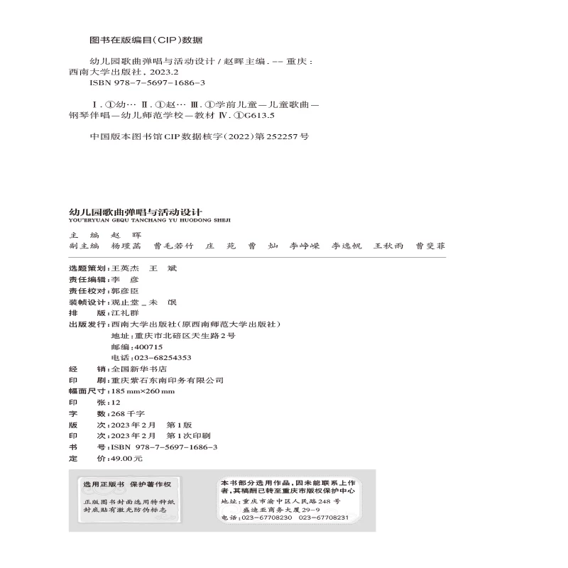 *书名:幼儿园歌曲弹唱与活动设计 | *ISBN:978-7-5697-1686-3 |