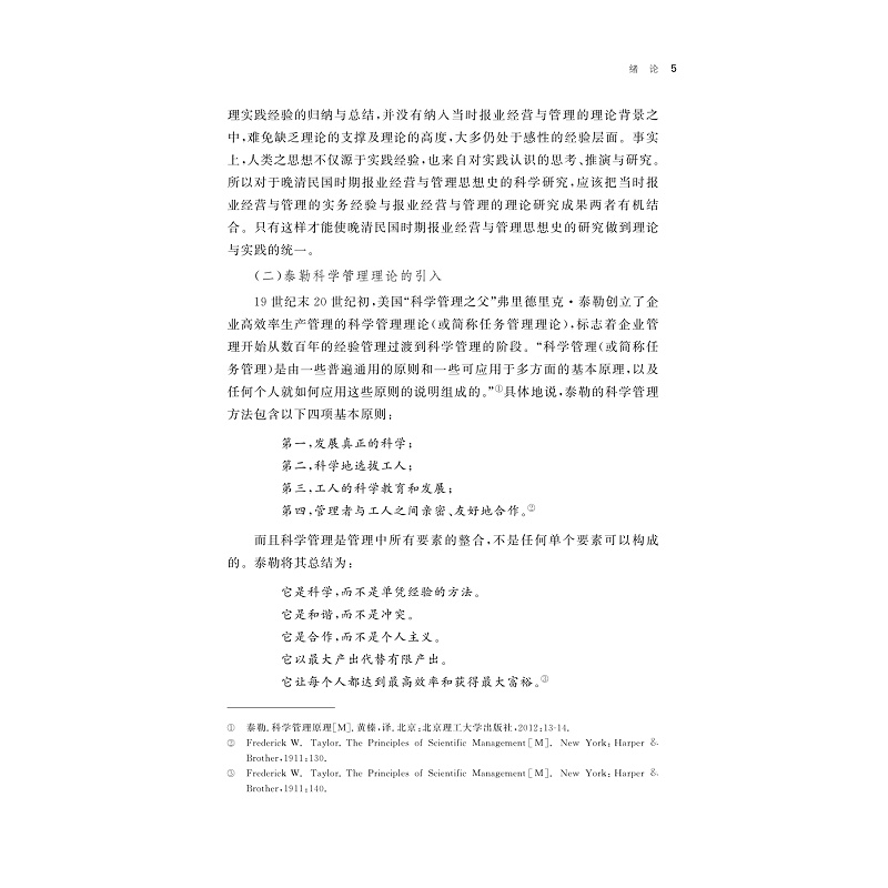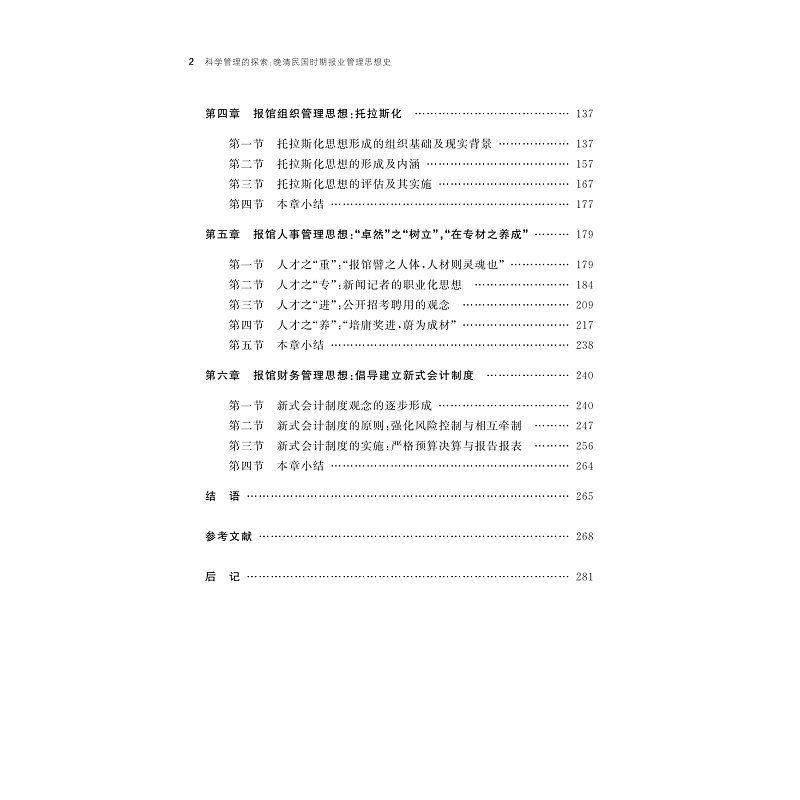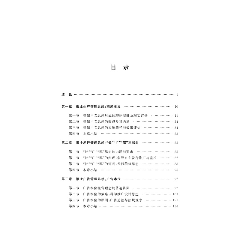 本书为教yu部人文社会科学研究规划基金项目“晚清民国时期报业管理思想专题研究”(编号:15YJA860017)。晚清民国时期引入泰勒的科学管理理论之后,国内主要报业企业在生产、发行、广告、组织、人事、财务等内部管理方面掀起一次大规模且较为长时间的改革,从根本上废除了陈旧的经验式、家长式、能人式的管理模式,并逐步建立了符合当时国情的报业科学管理思想体系。具体而言,为了节约成本实现最大产出与最大利润,新闻界在报业生产管理方面奉行“精编主义”思想,在报业发行管理方面倡导“长”、“广”、“厚”思想,在报业广告管理方面盛行“广告本位”思想,在报业组织管理方面普遍推行“托拉斯”化思想,在报业人事管理方面普遍提倡“卓然”之“树立”“在专材之养成”的思想,在报业财务管理方面倡导“新式会计”制度思想。