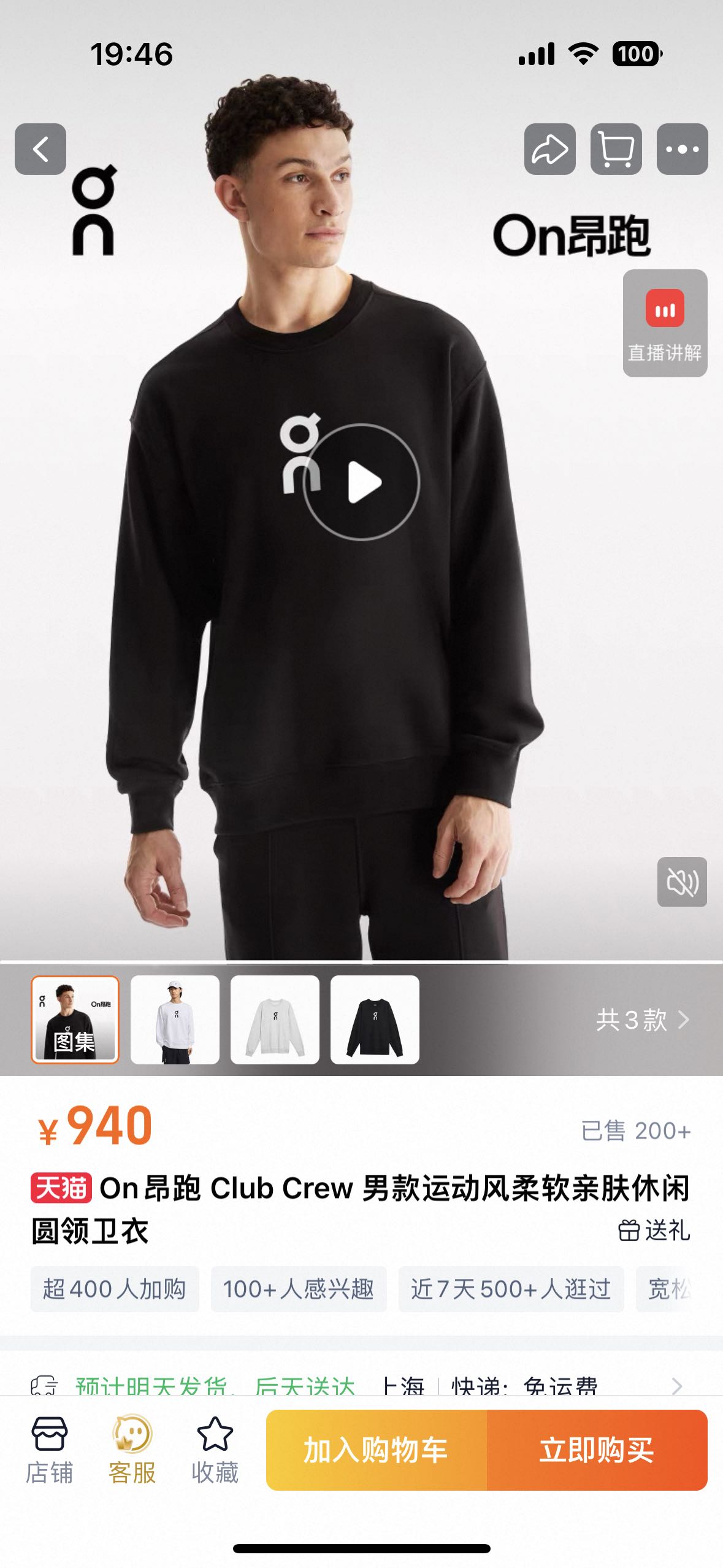On昂跑 Club Crew 男款运动风柔软亲肤休闲圆领卫衣