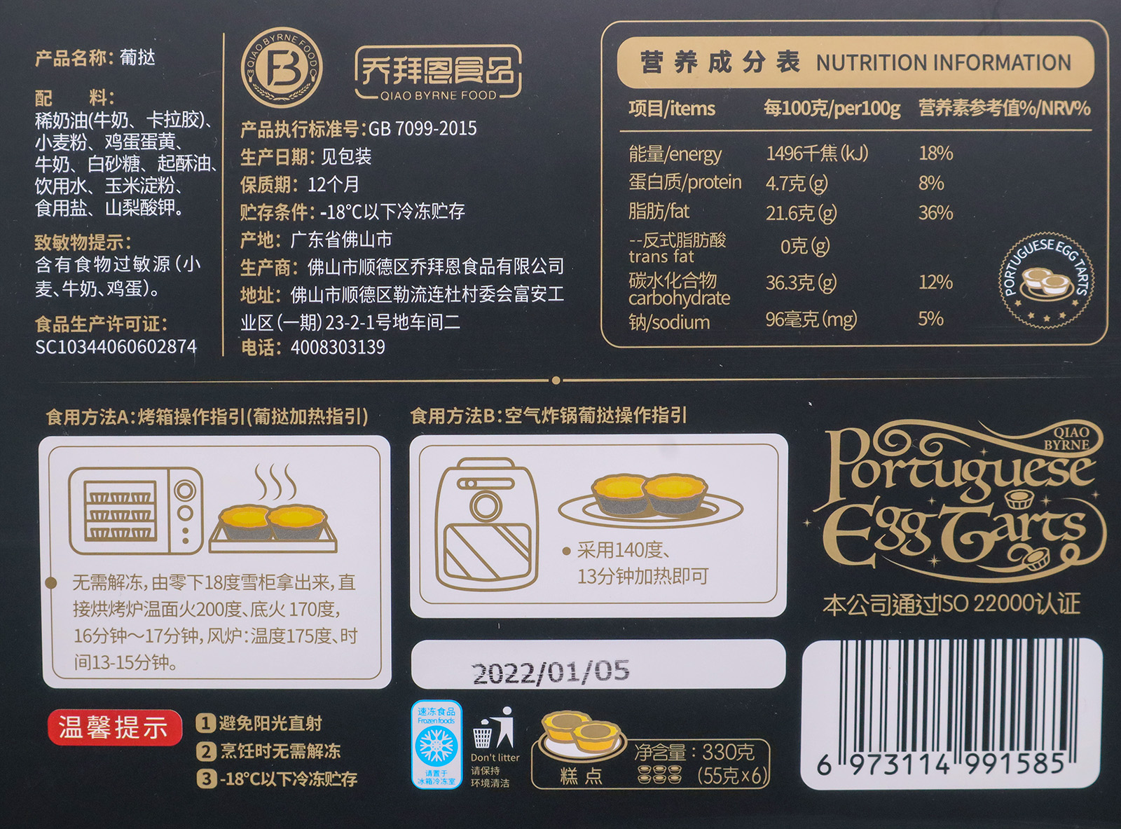 【动物奶油】:选用成本更高、口感更好的淡奶油,市面葡挞常用的人造奶油不但口感不佳,而且含反式脂肪酸,容易导致心血管疾病。