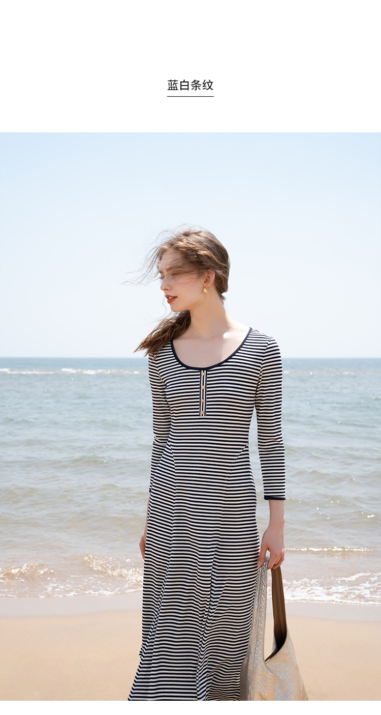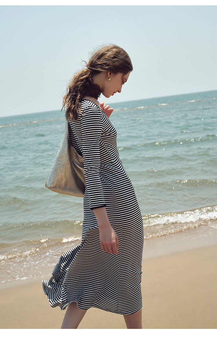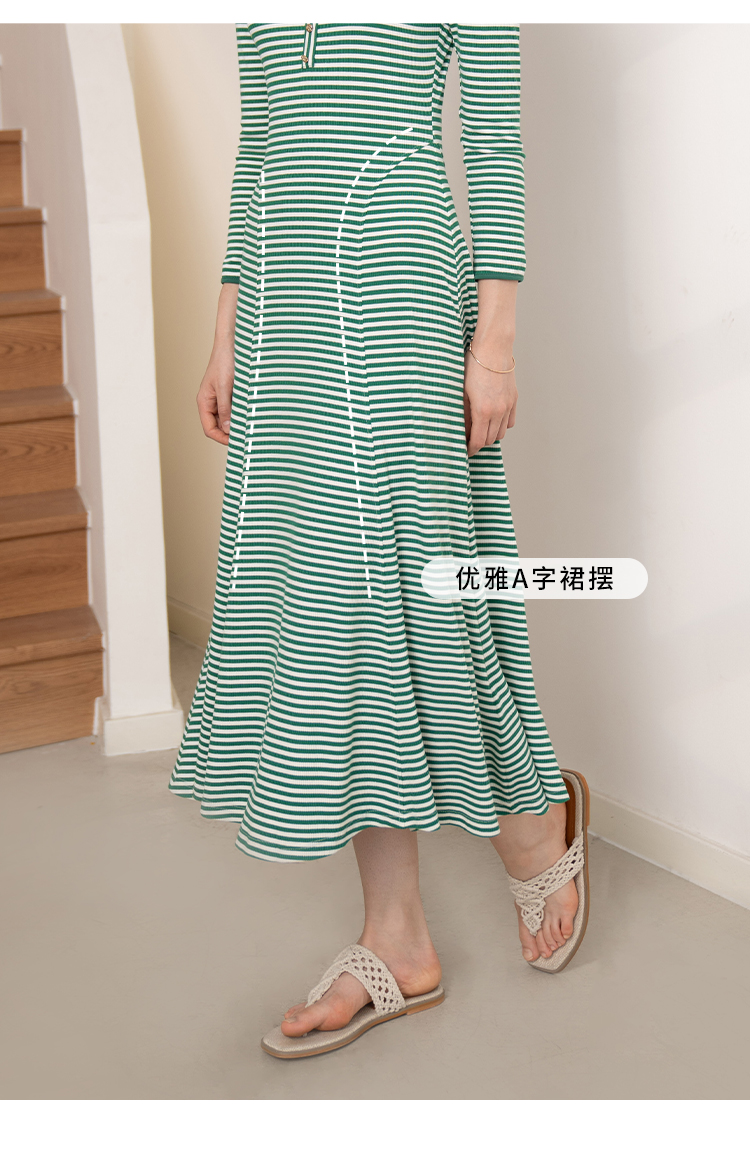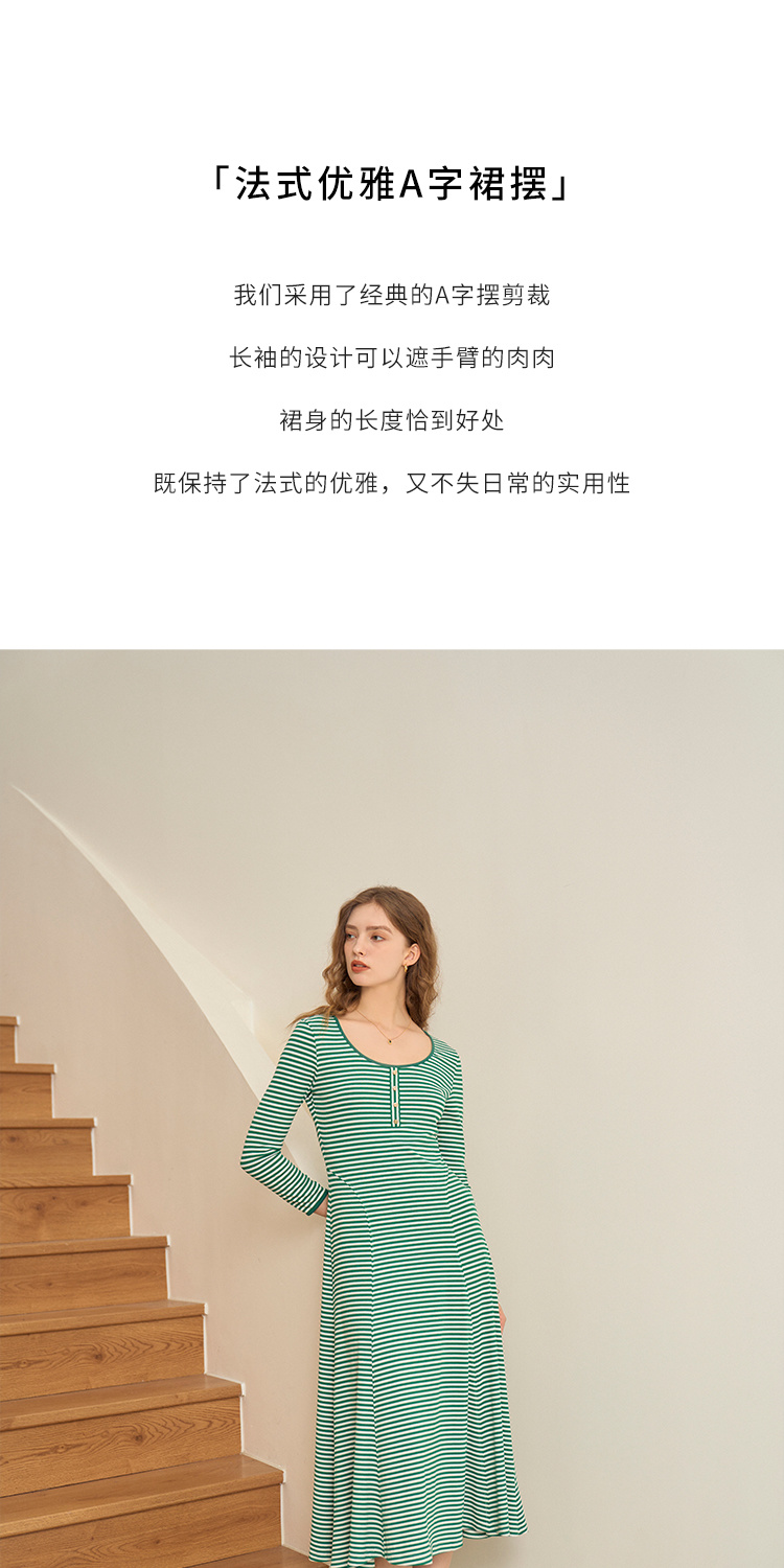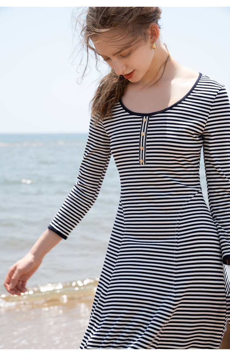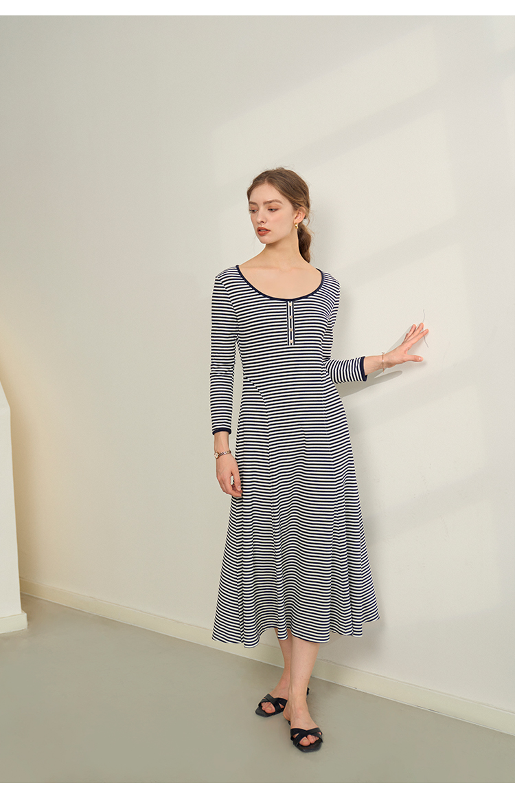 HeyDress大U领连衣裙女春秋法式撞色条纹收腰设计感修身针织裙子