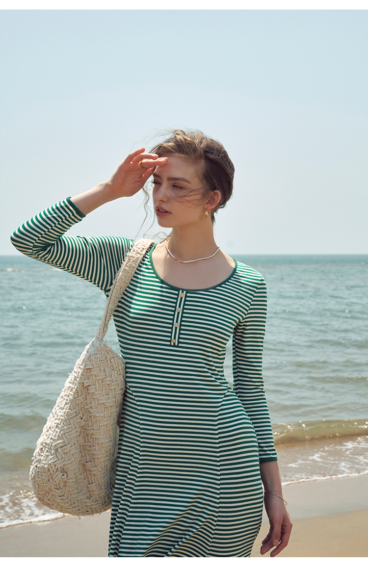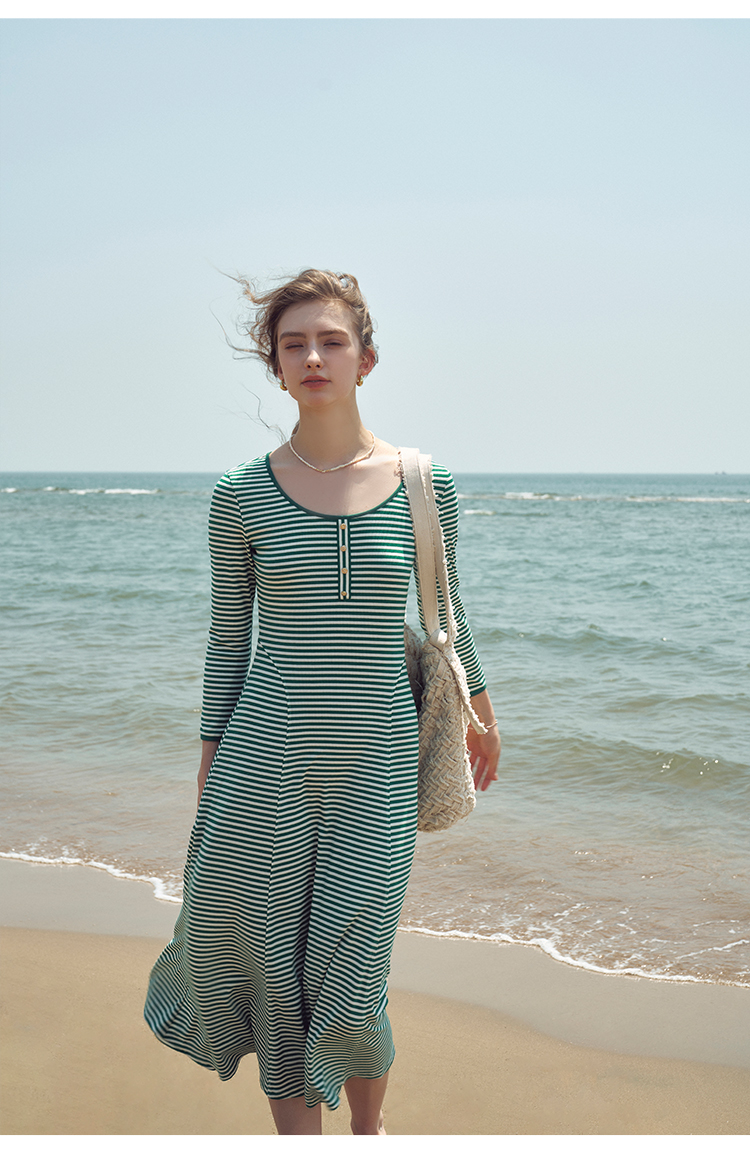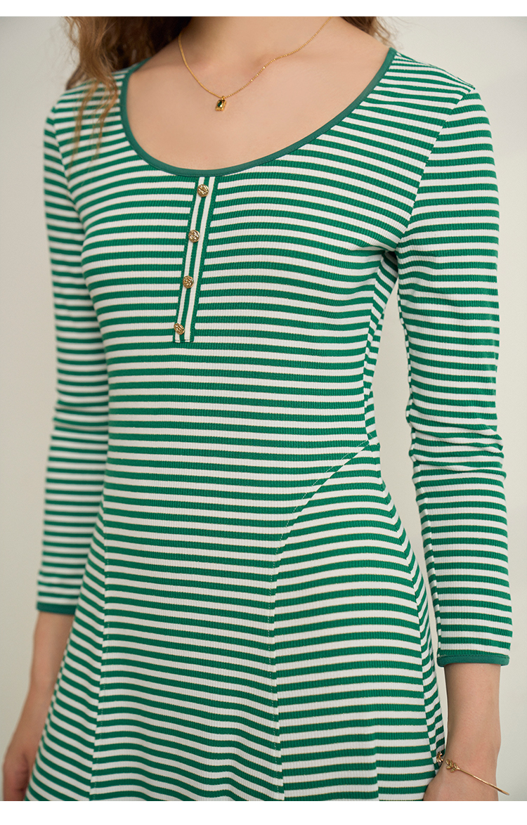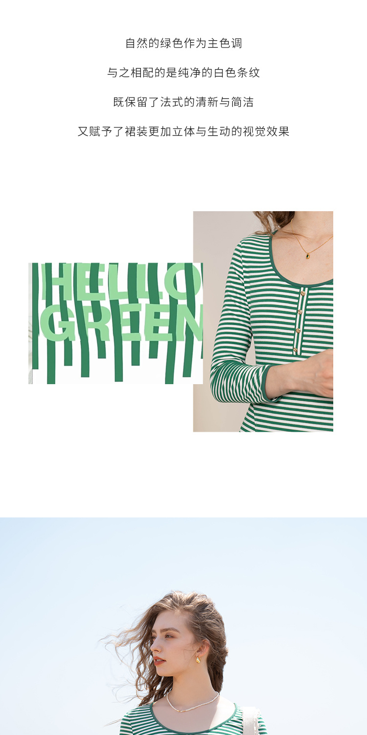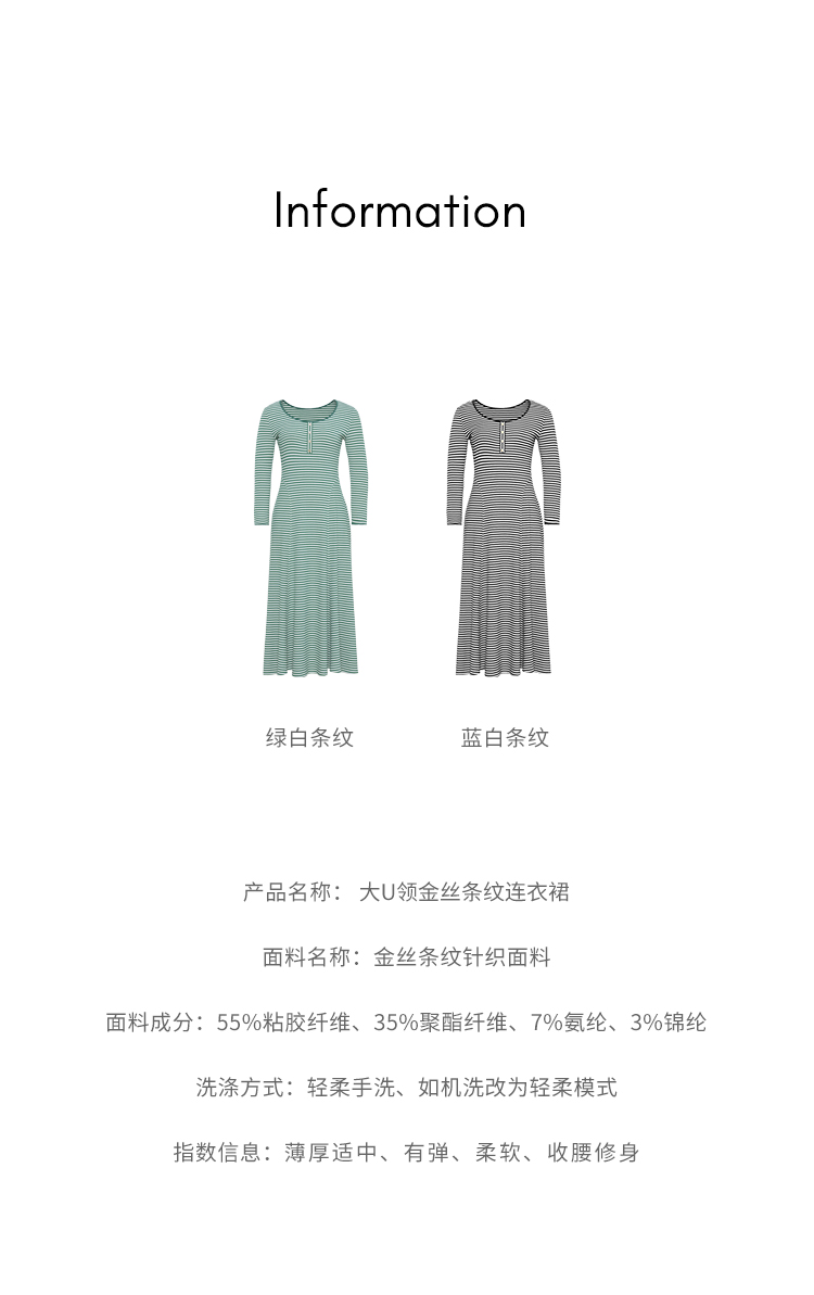 HeyDress大U领连衣裙女春秋法式撞色条纹收腰设计感修身针织裙子