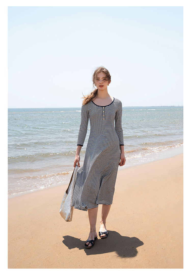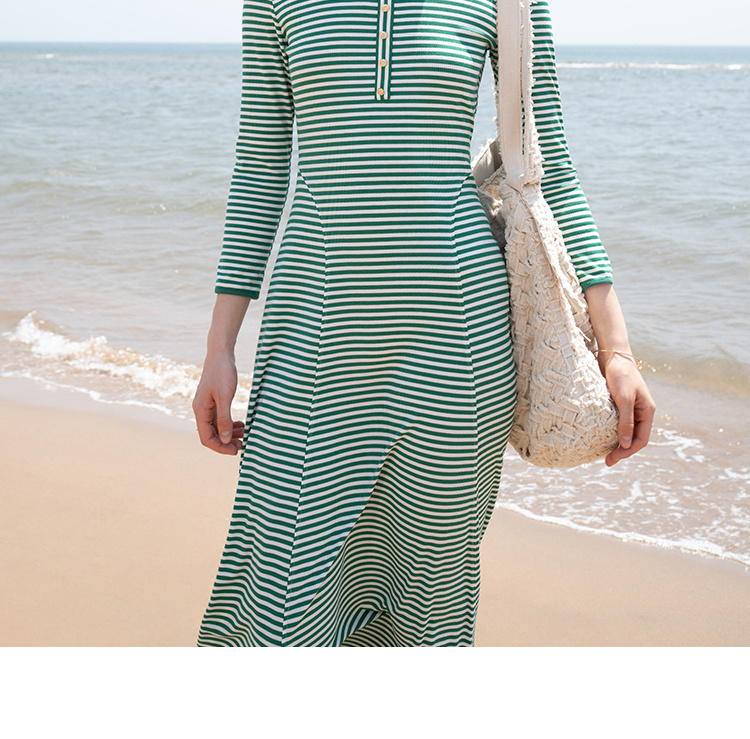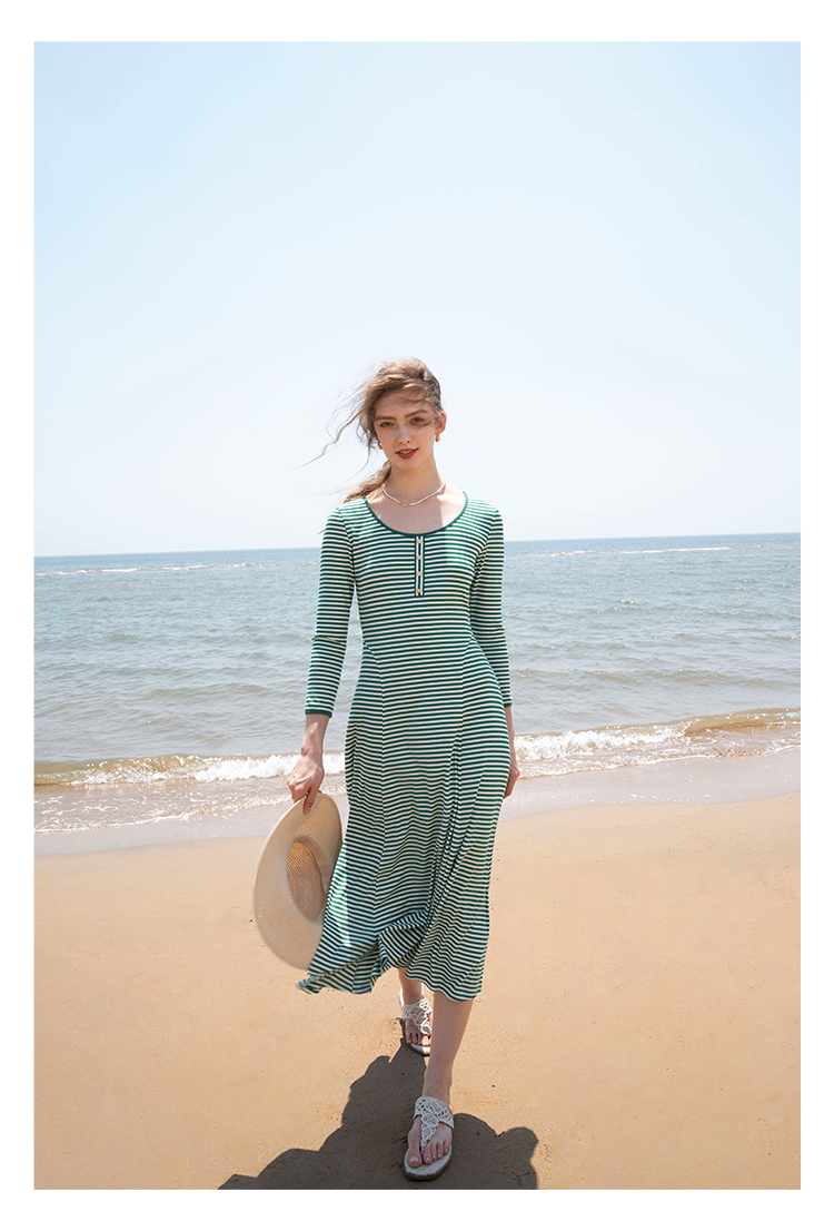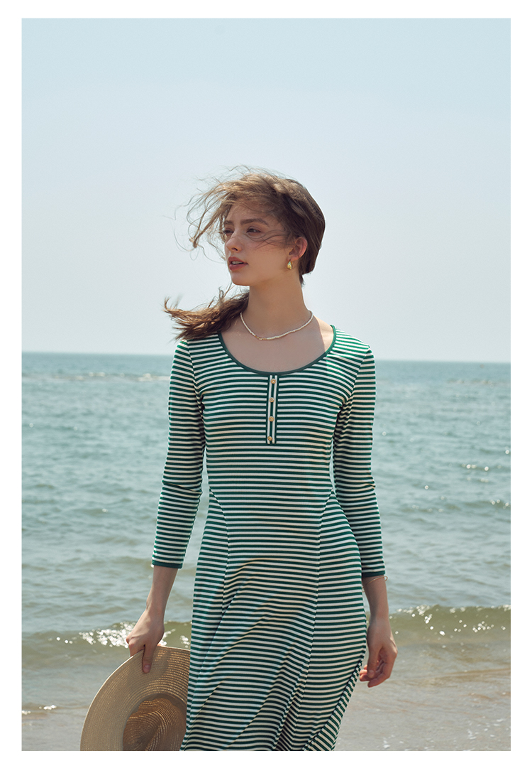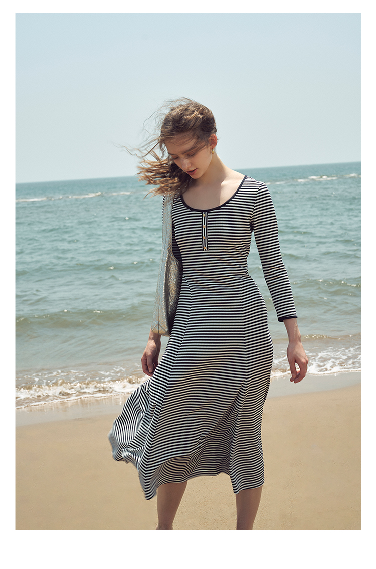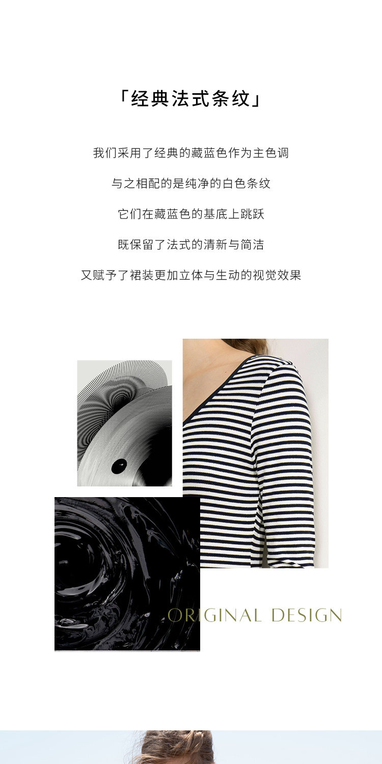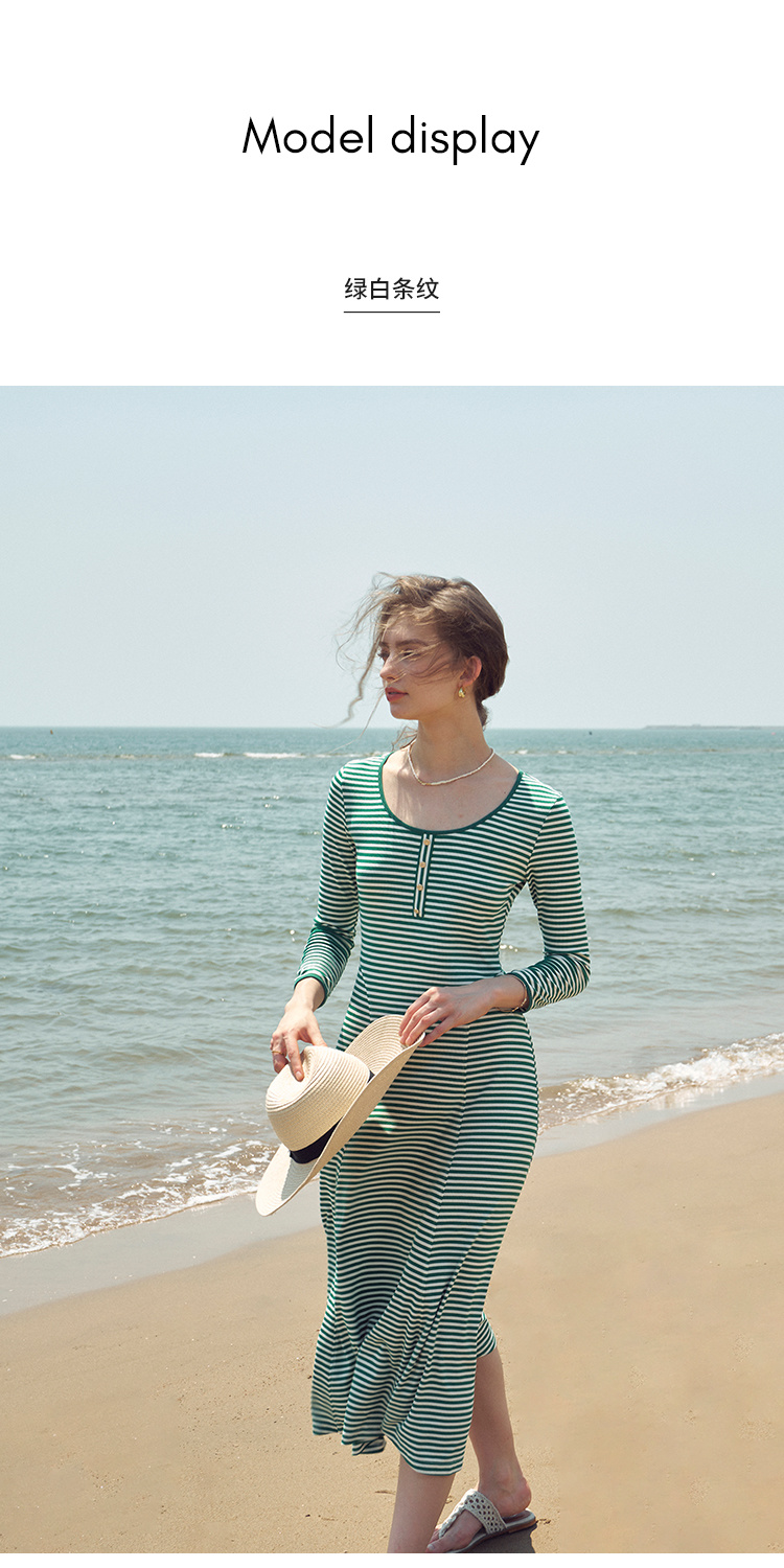 HeyDress大U领连衣裙女春秋法式撞色条纹收腰设计感修身针织裙子