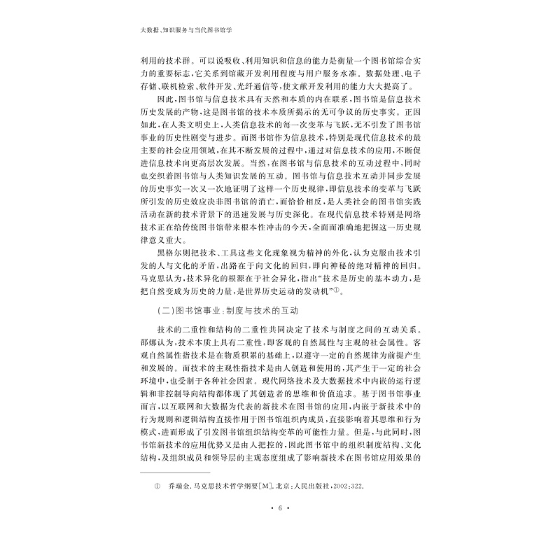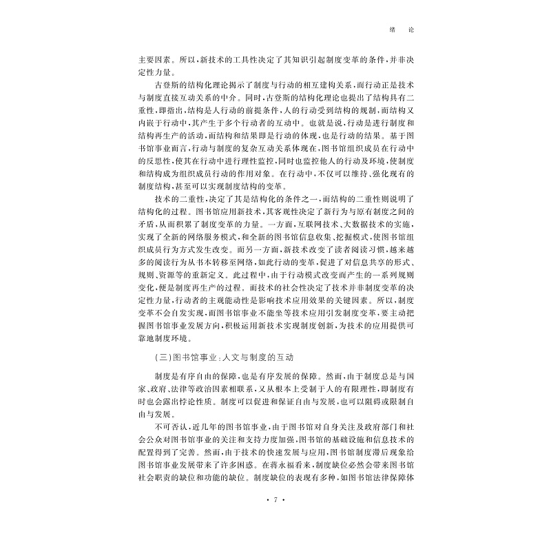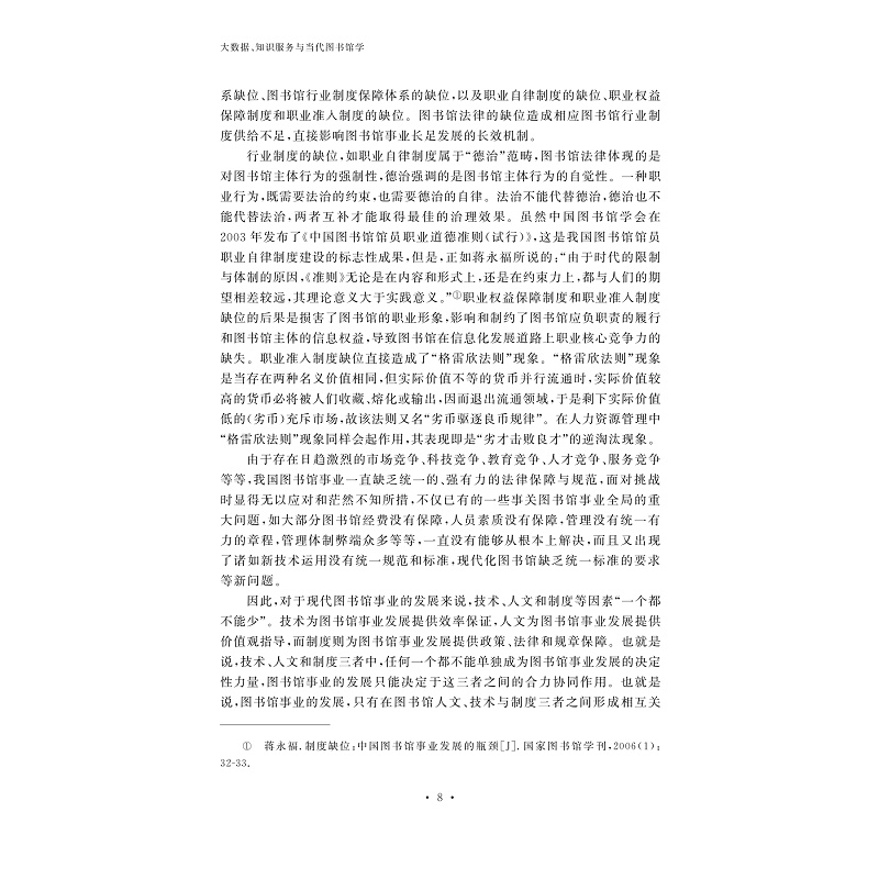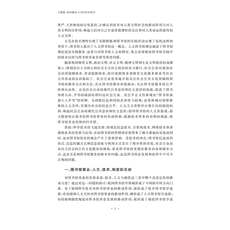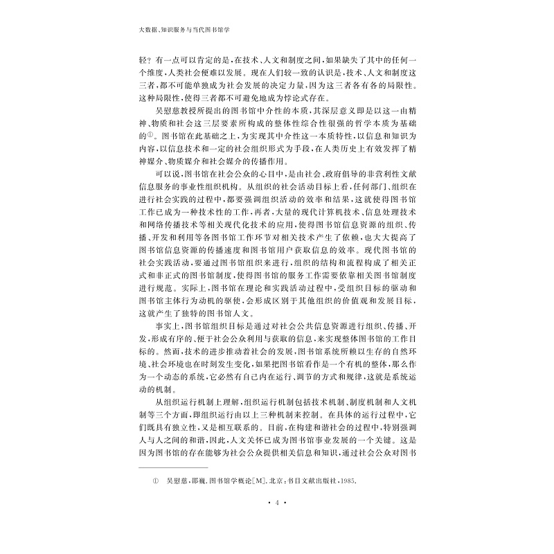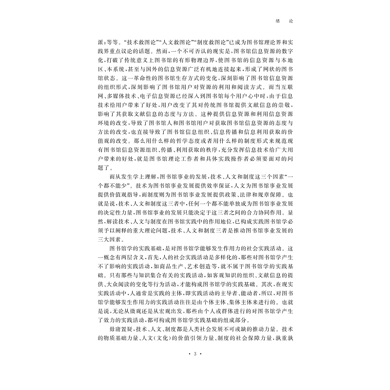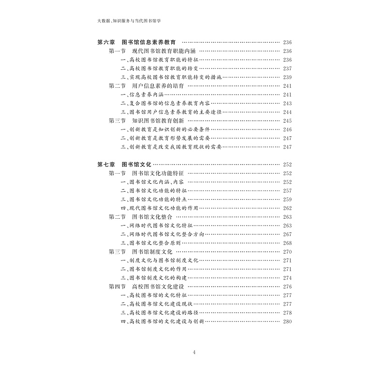 本书主要简述我国图书馆精神研究历程及其含义、内容,通过分析其结构与当代精神缺失,提出通过加强图书馆制度建设,强化图书馆精神培育,实现图书馆权利;通过对图书馆知识、数据的有效组织、管理与建设,发挥图书馆对社会经济建设中的作用;通过强化图书馆信息咨询工作,加强对信息的挖掘与利用;通过对信息共享空间的概念与特征的分析,构建实现信息共享空间的保障体系;通过强化全民阅读工作,提升图书馆图书利用率;通过信息教育,提升全民信息素养;通过图书馆文化建设,提升图书馆在当代社会中的生存力与服务力。