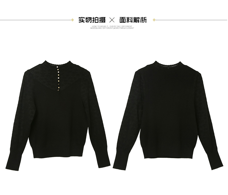 黑色半高领后背纽扣针织衫 镂空纹理修身显瘦长袖打底衫 秋冬通勤温柔气质内搭上衣