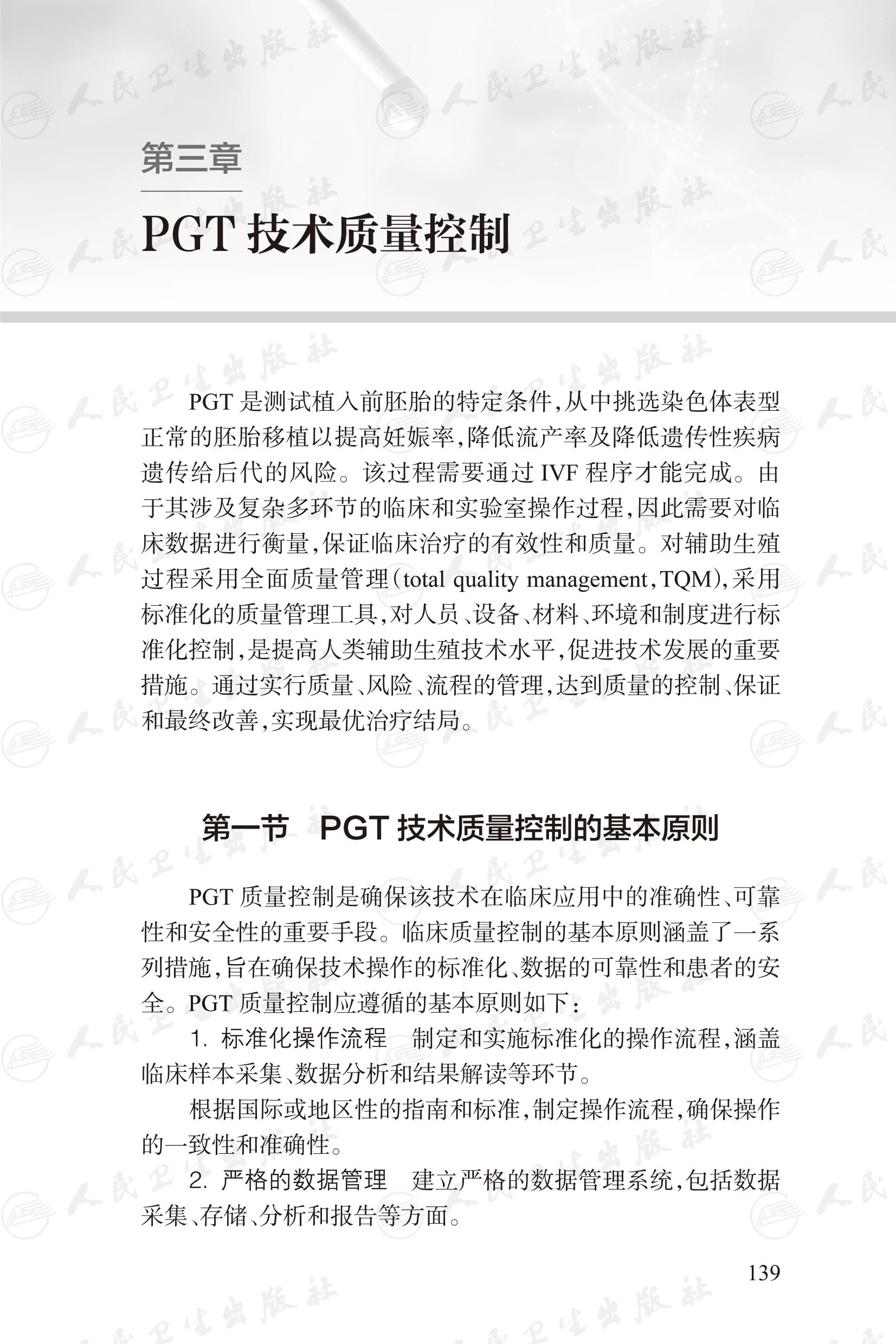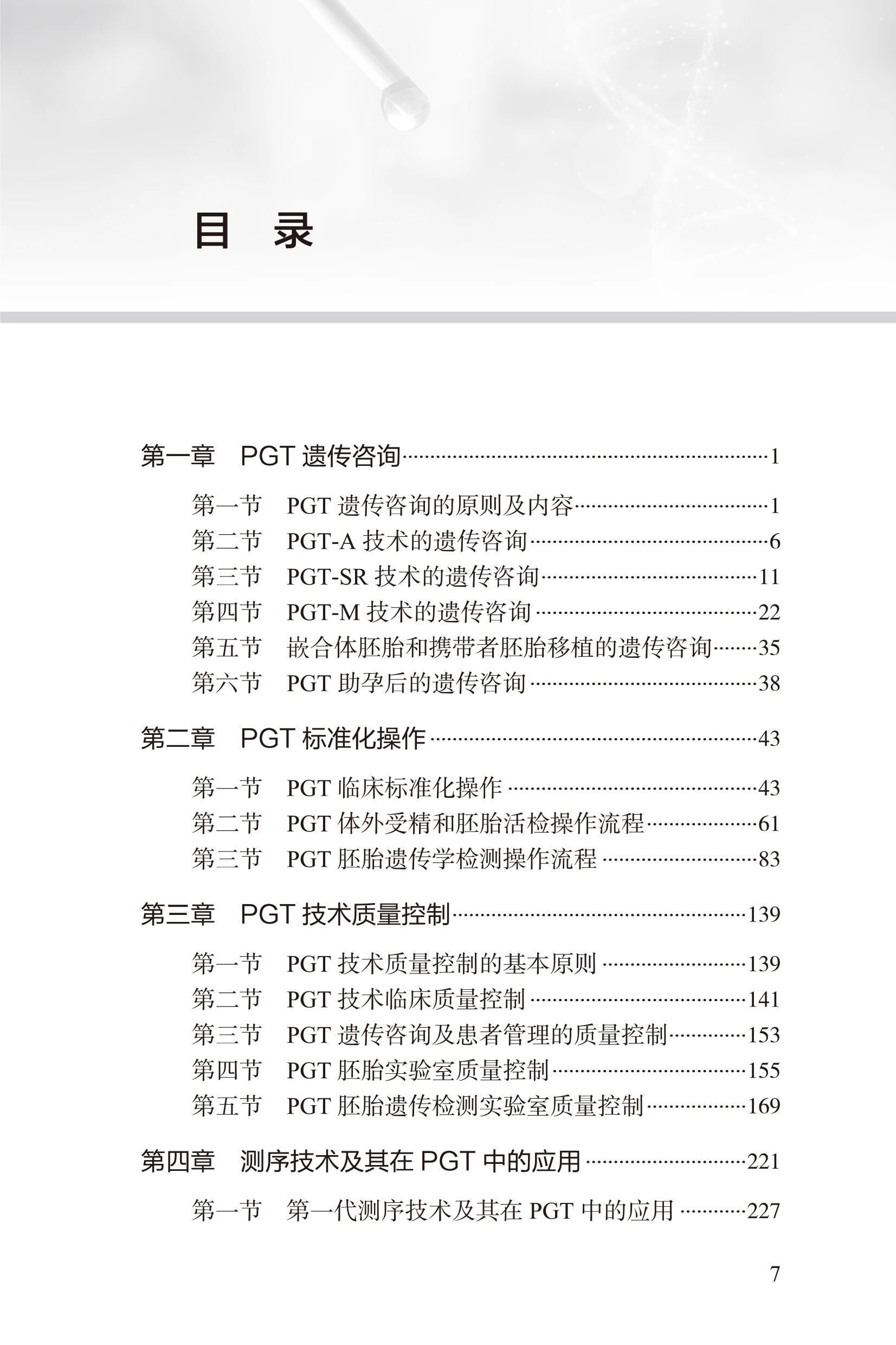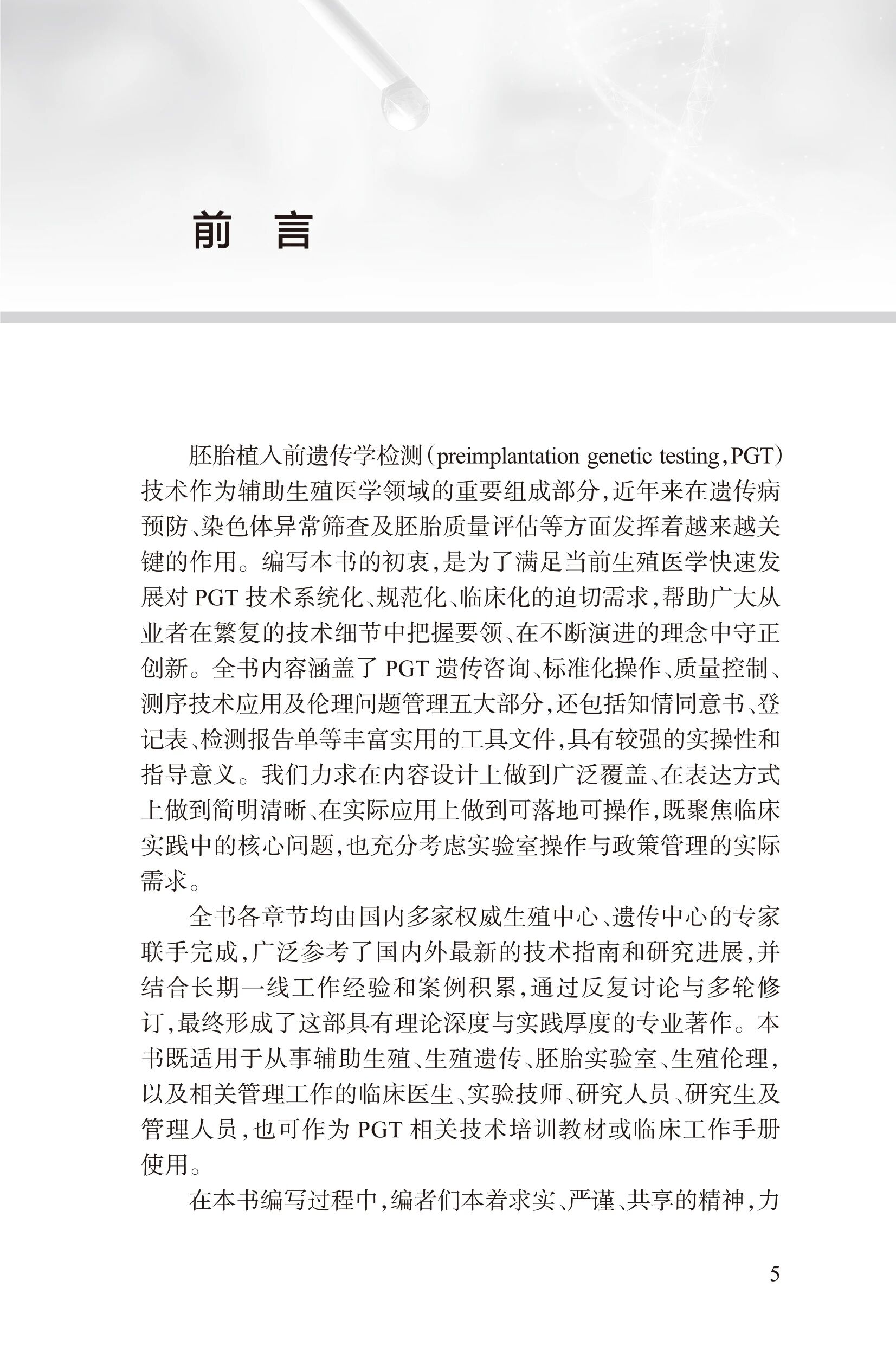共5章,内容包括:PGT遗传咨询、PGT标准化操作、PGT技术质量控制、测序技术及其在PGT中的应用、PGT技术的伦理问题及管理,还包括PGT相关知情同意书、 PGT病例和相关表格、PGT技术管理制度等内容。全书内容凝练,紧密围绕临床操作展开,图文并茂,简洁实用。