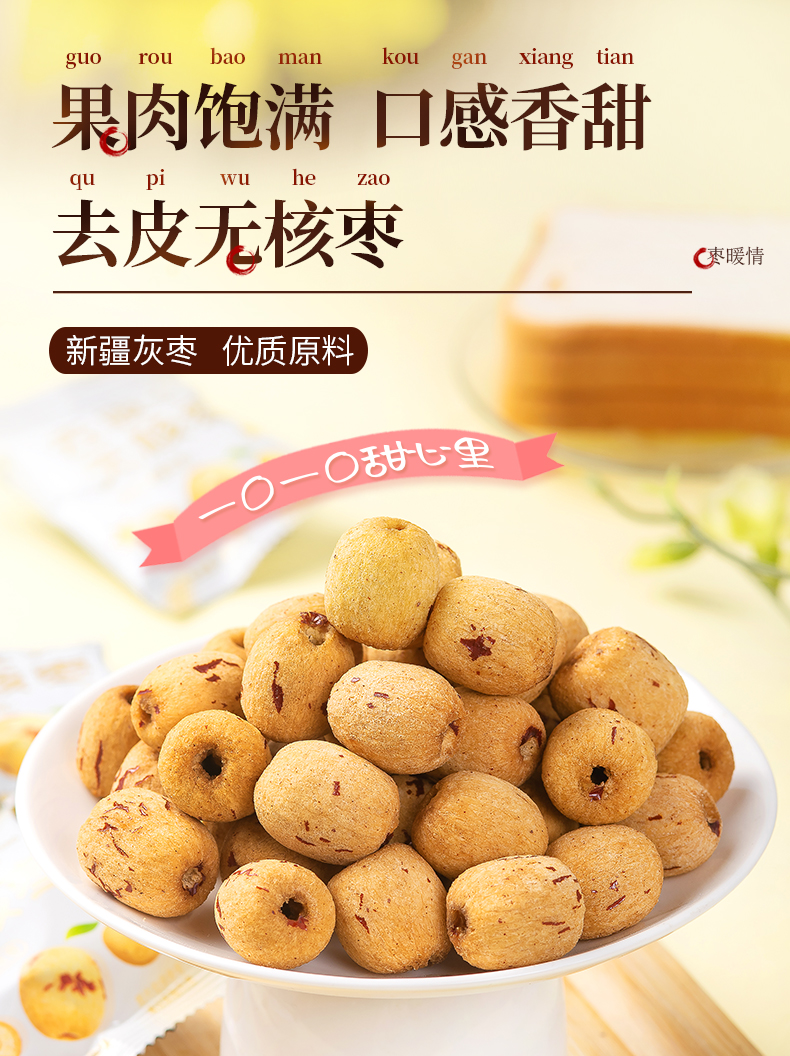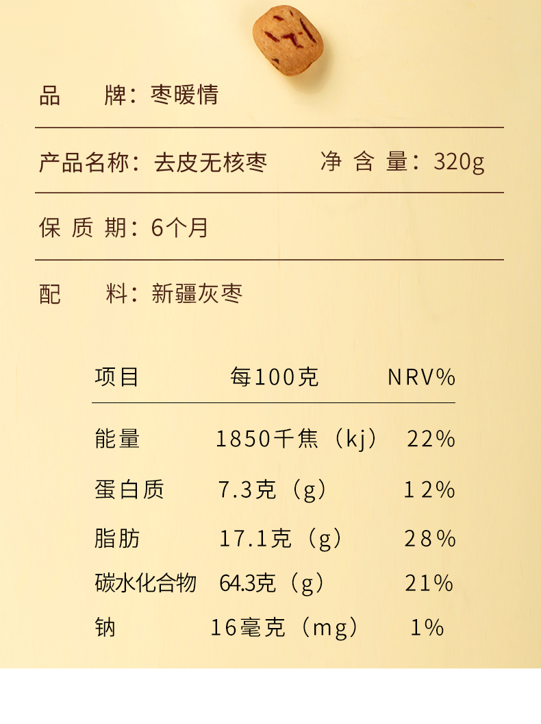 【品名】枣暖情去皮无核枣 【规格】320g/箱 【保质期】6个月 【储存方法】请置于阴凉干燥处,避免阳光直射 【产地】郑州 【发货地】郑州 【发货快递】中通/申通 【不发货区域】新疆,西藏,港澳台地区不发 【发货时效】48小时,节假日顺延 |