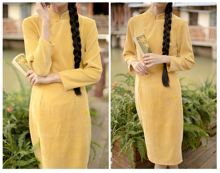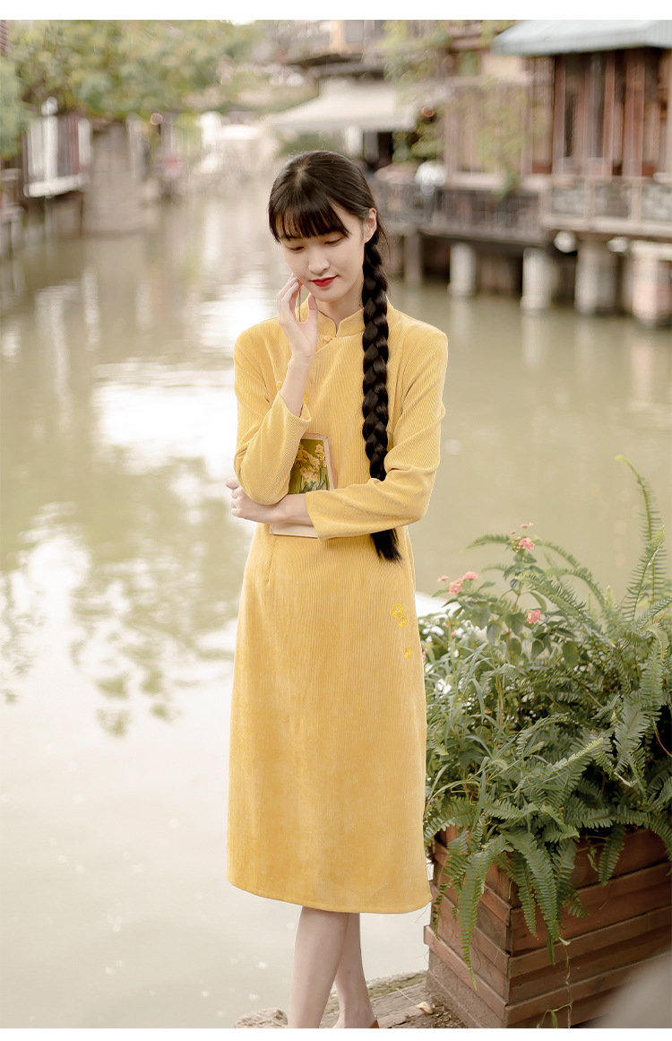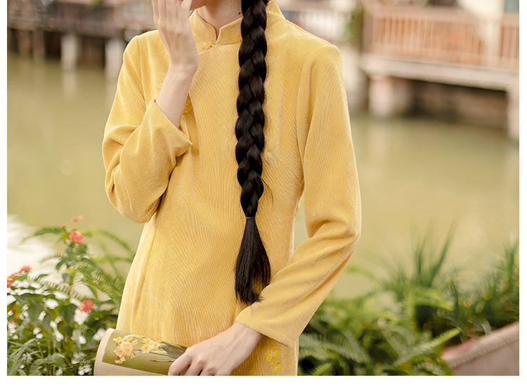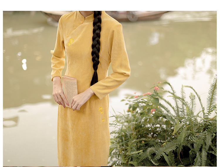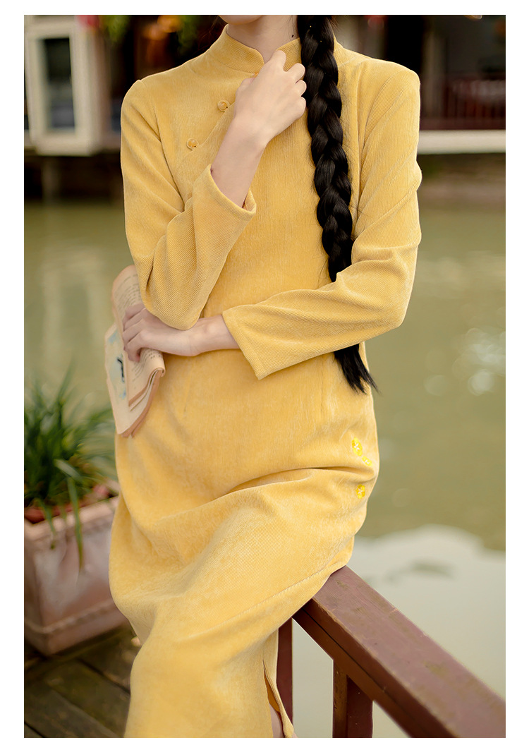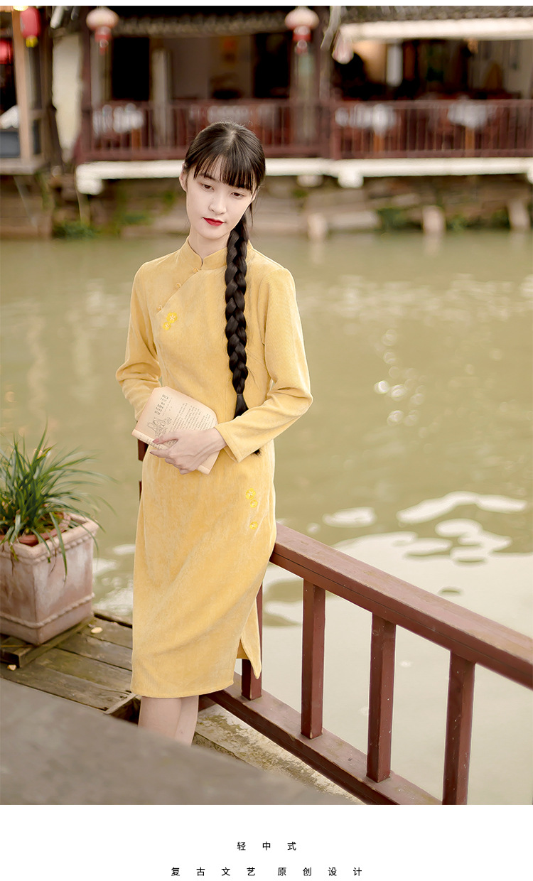 YM-13336灯芯绒旗袍改良版保暖秋冬新款女民国风复古文艺显瘦连衣裙