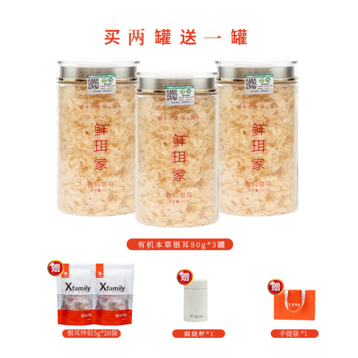 规格一:有机本草银耳80g*2罐(买2罐送1罐,实发3罐+红枣伴侣20包+焖烧杯+礼品袋
