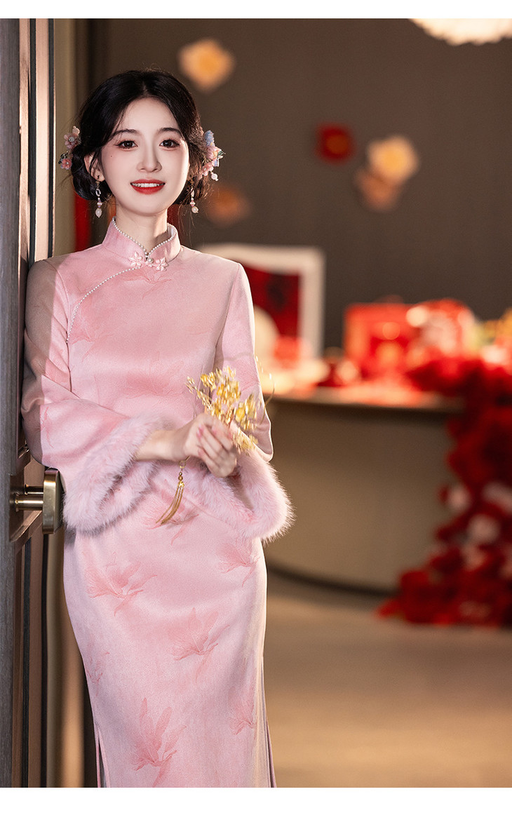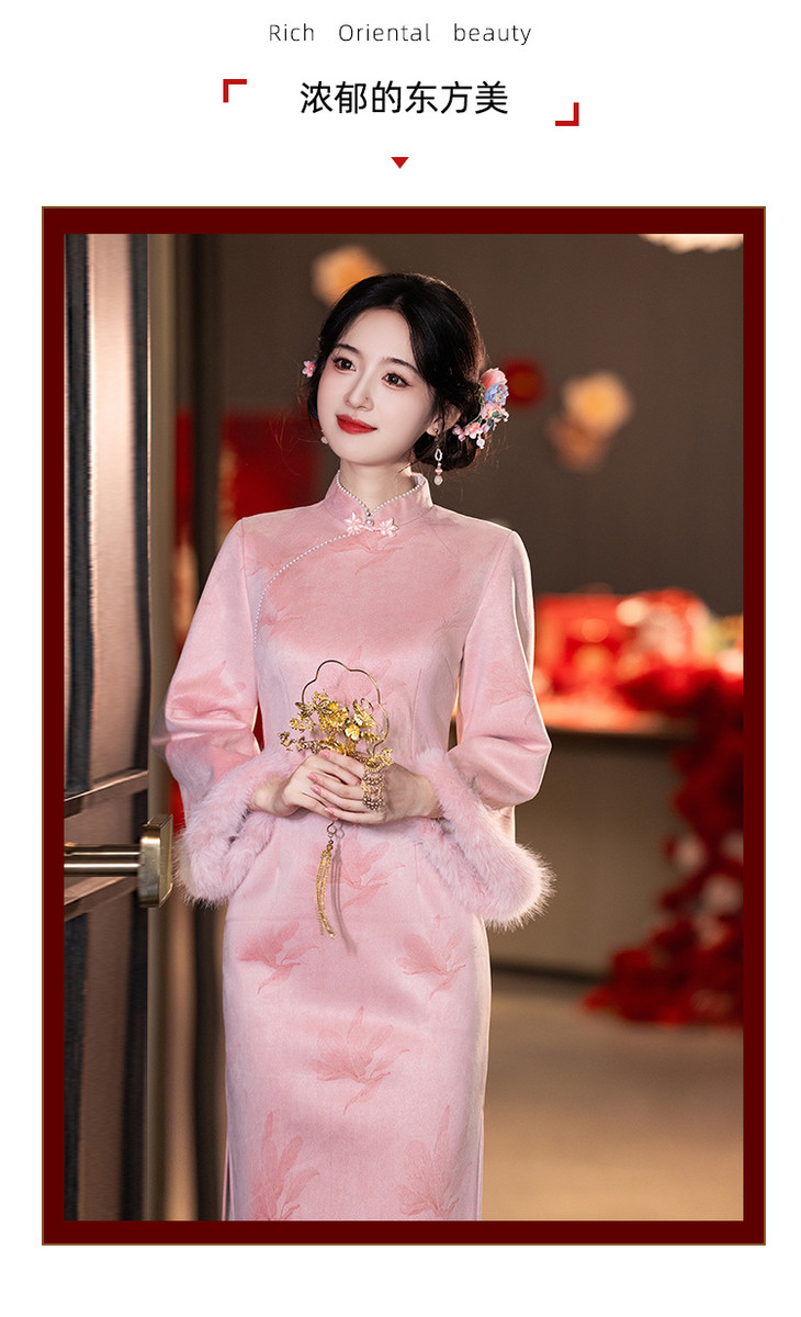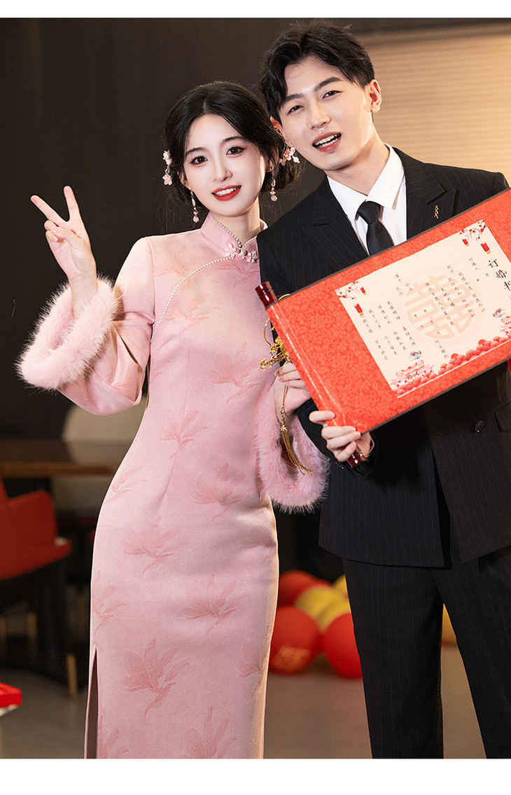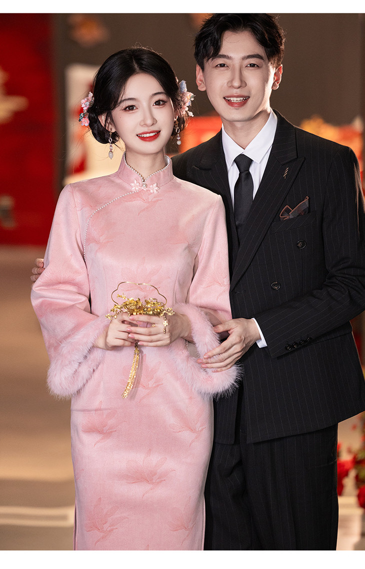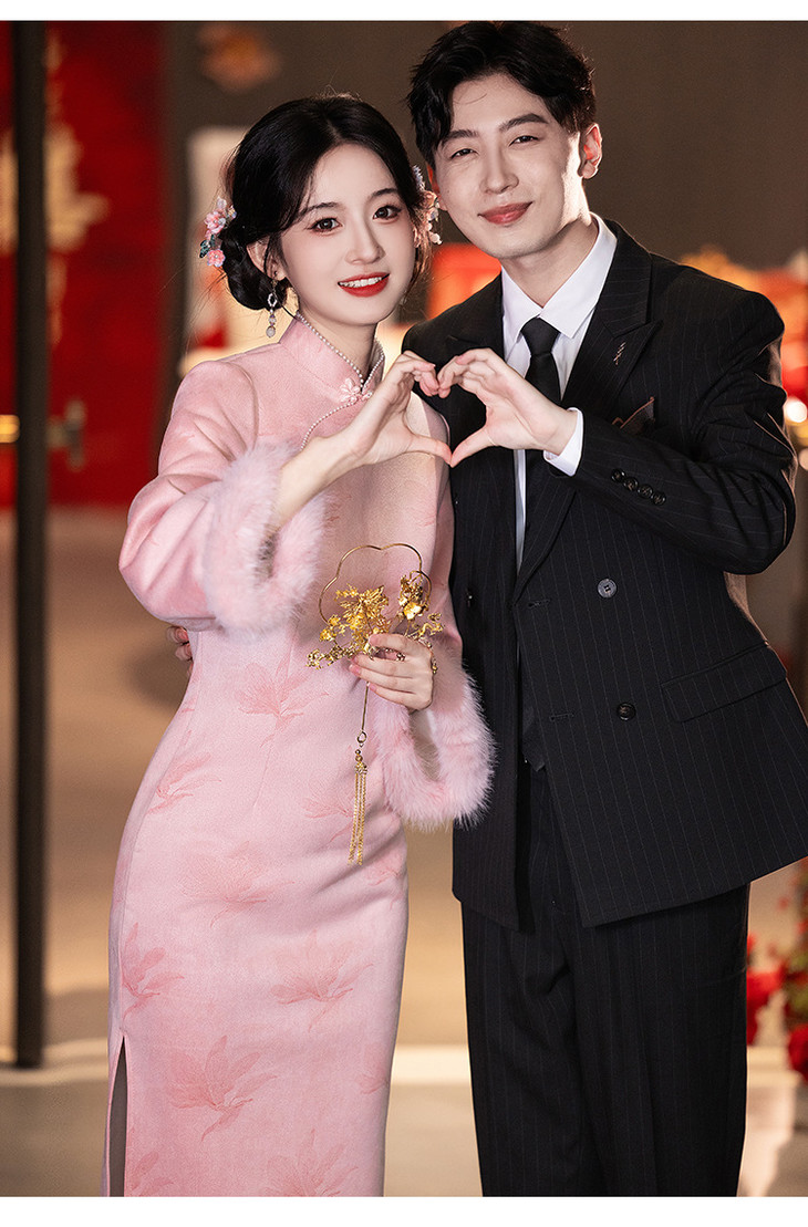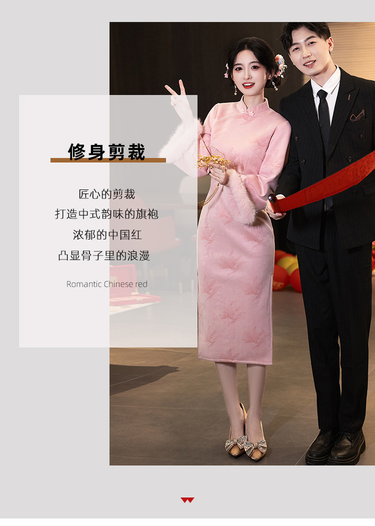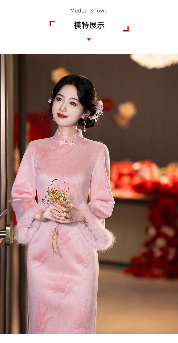 【婉婉】粉色新中式旗袍,倒大袖加厚麂皮绒敬酒服新娘订婚礼服裙LSB3246