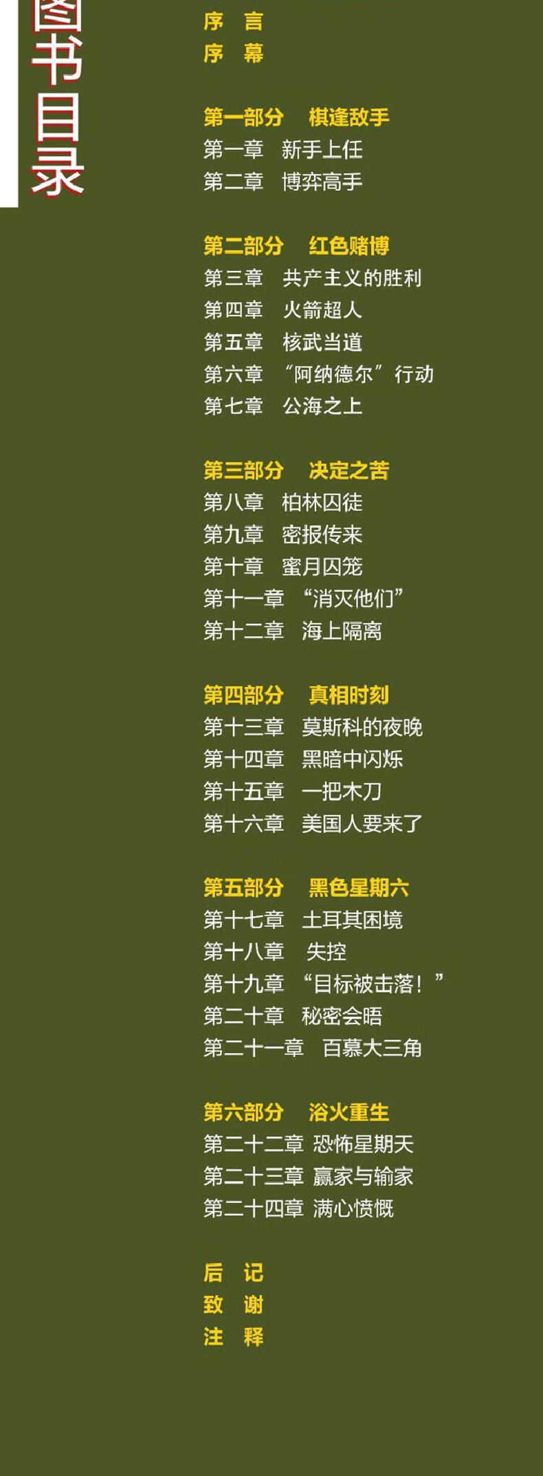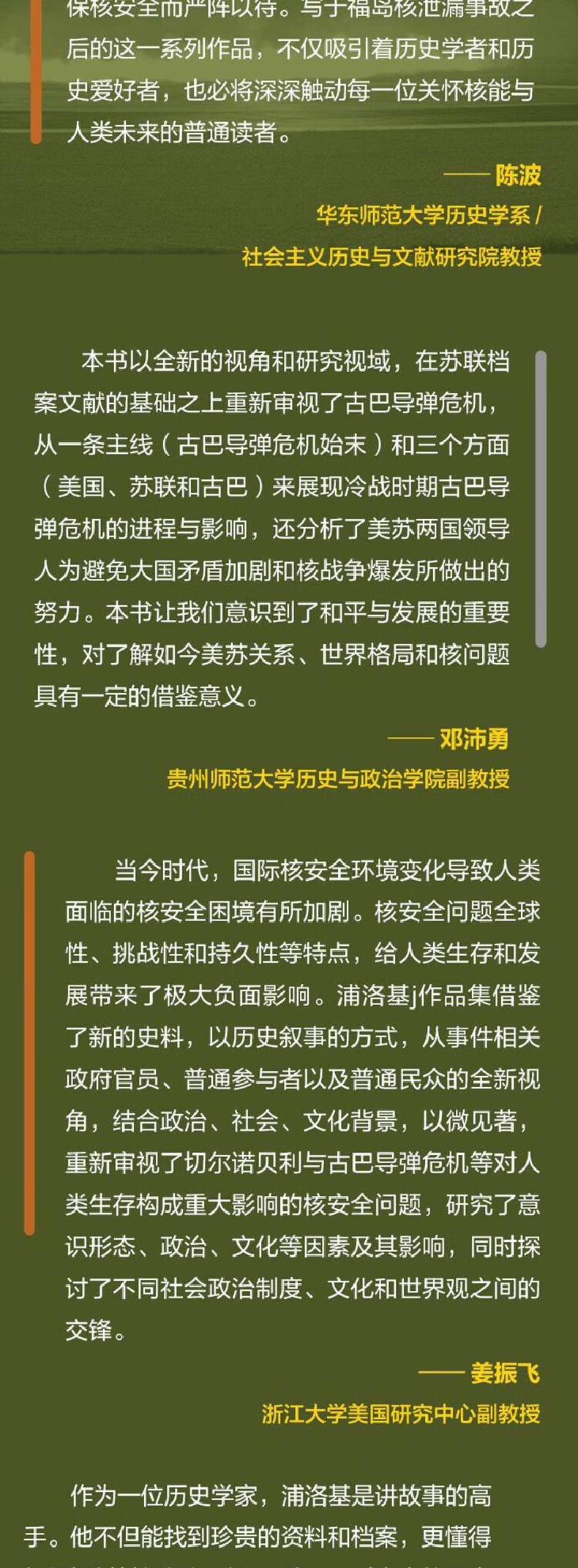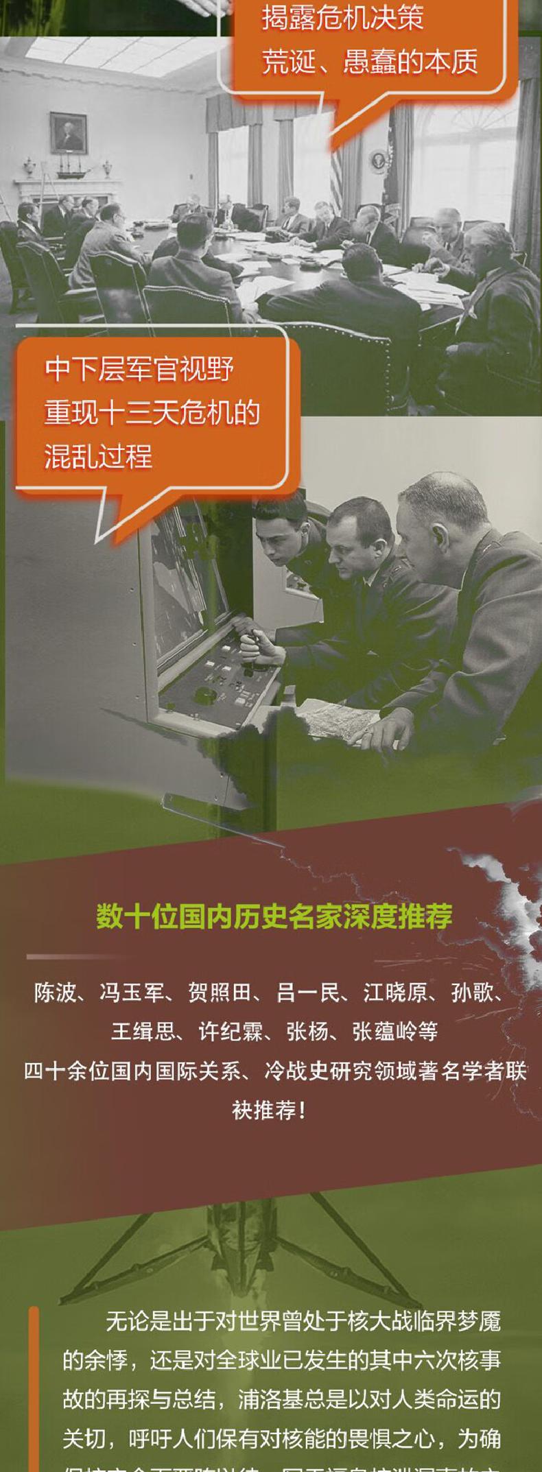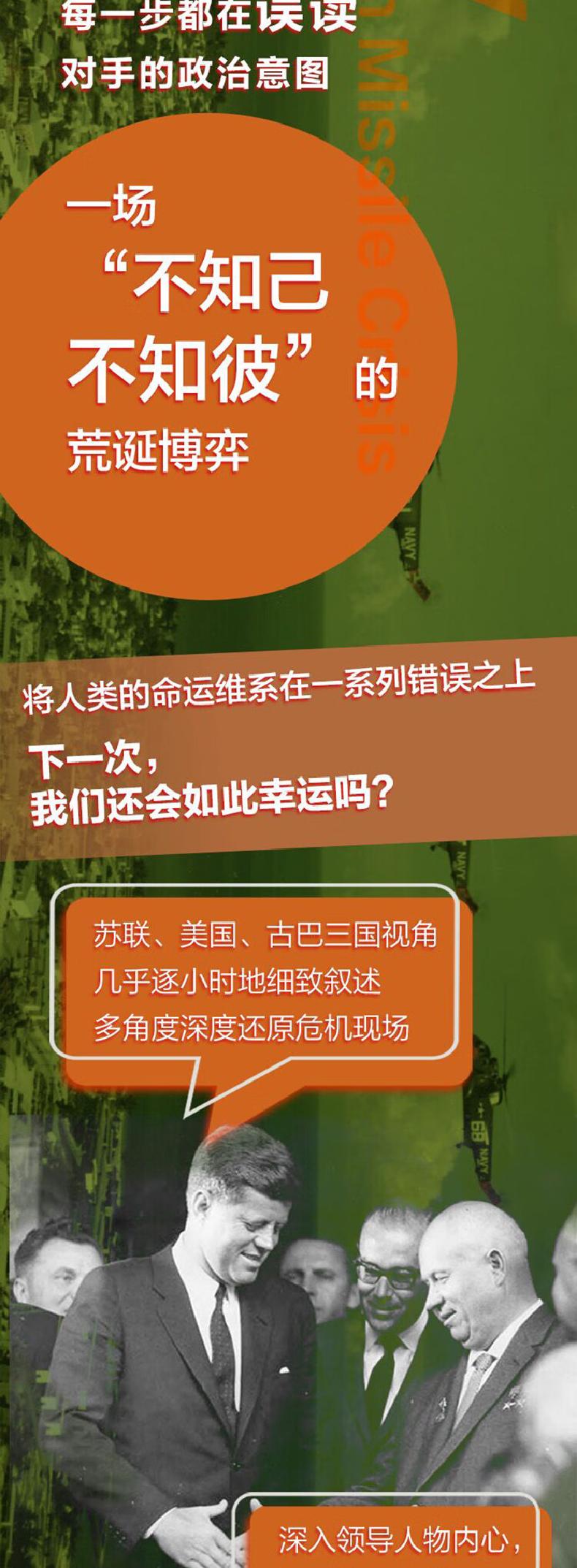本书挑战了古巴导弹危机的传统叙事,凭借白宫新解密录音、苏联克格勃档案,以及军方报告和大量当事人的回忆,沙希利·浦洛基教授扩展了旧有的叙事框架,纳入赫鲁晓夫、卡斯特罗等关键参与者的视角,勾画出这场危机的完整画面;深入关键人物的内心世界,展现决策反复变化背后的惊心与焦灼;更透过普通官兵的眼睛,从下层视角观察危机的历史,在无数个不起眼的细节中,追问危机得以解除的真正原因。相比于为避免战争所做的正确决定,出于误解和恐惧而犯下的无数荒诞、愚蠢的错误,才是值得今天借鉴的教训。
