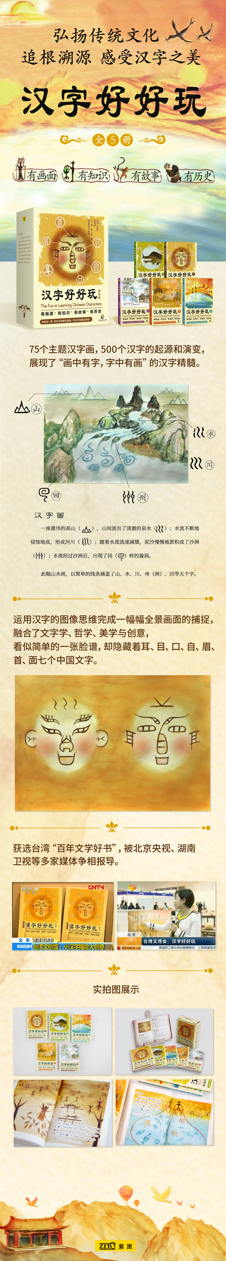 《汉字好好玩》是一系列汉字学习图书,作者原创七十五幅汉字画作品,打破传统一笔一画的汉字学习方式,倡导图像学习汉字的新思维!本书特色★画中有字,字中有画本书优SHOU*选的特色就是作者原创七十五幅汉字画,每幅图画中都包含着好几个汉字,而每个字的形象就是其事物本身的形象,每一幅图所要表达的意境也是由这一组相关的文字集结而成的。作者从不同的视野与角度认识汉字,并结合图形、书法、艺术、美学、文字学、哲学等概念,特别提出了一套汉字画的学习方法。★快速学习汉字的新方法本系列图书将文字图像化,通过图像来记忆学习。通过书中的画作,可以对画的含义、字的意义一目了然;每幅图画中至少包括三个字以上,有效地学习基本文字后,接下来只是组合字的问题,借由不同部首或字源之间的组合,又可以创造出不同的文字与意义。想认识汉字,了解汉字,就从这套图书开始吧,它会以一种“寓教于乐”的方式激发你汉字学习的兴趣,让你打心底觉得汉字好好玩!