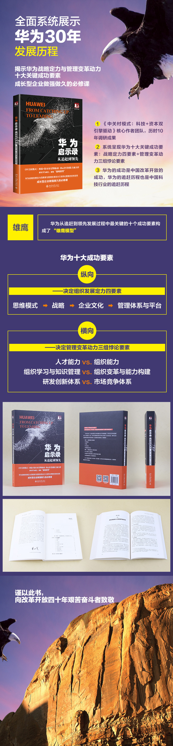 《从追赶到领先:华为启示录》的作者团队经过10年观察调研,对华为过去30年的发展进行了系统梳理、总结,并与华为的国际竞争对手思科公司进行了全方位比较,将华为从追赶到领先发展过程中最关键的十个成功要素总结提炼为 “雄鹰模型”。