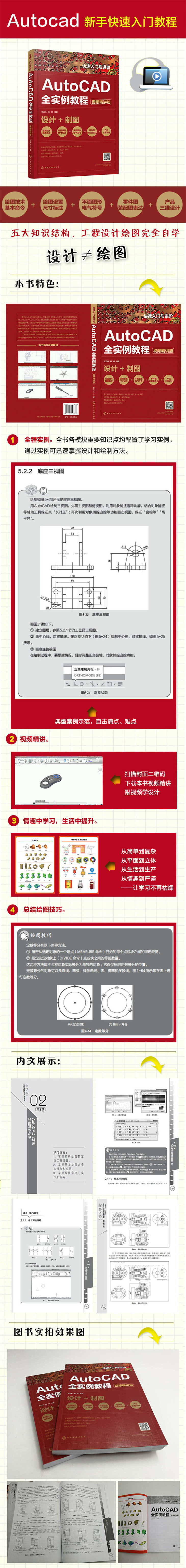 ● 内容从简单到复杂,从平面到立体,从生活到生产,从情趣到严谨;从电气符号到电路图,从生活用品到生产零件,从机构图到机械结构图,从情趣设计到机器装配图设计等,让学习不再枯燥。