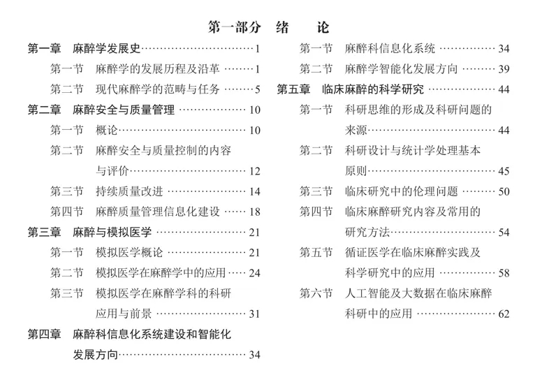 创新章节设置:在绪论部分独具匠心地设置 “麻醉安全与质量管理”“麻醉与模拟医学”“麻醉科信息化系统建设和智能化发展方向”“临床麻醉的科学研究” 等课程内容,从多方位设计研究型教材,将系统掌握理论与技能、深入研究重点领域、参与临床实践、阅读科研文献、参加学术交流、培养批判性思维等方面融为一体,紧密贴合当下麻醉学发展趋势,为读者打开了解麻醉学前沿领域的大门。