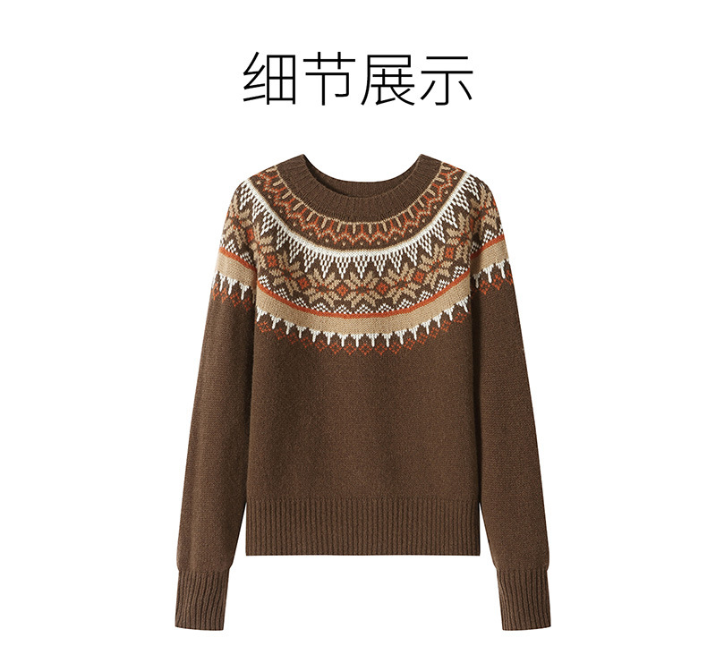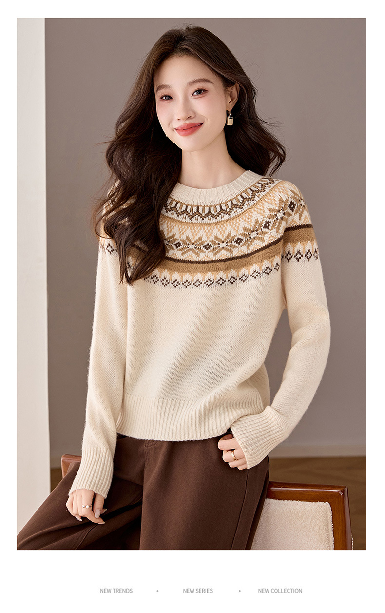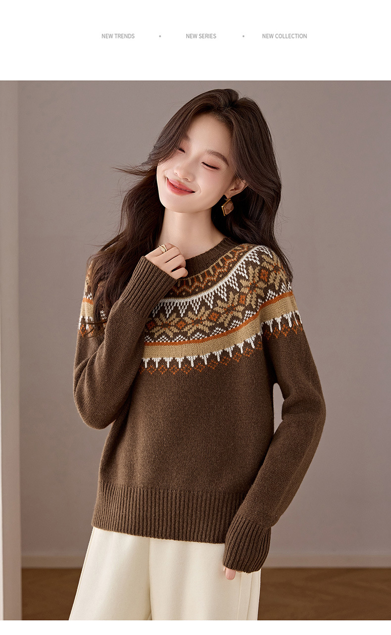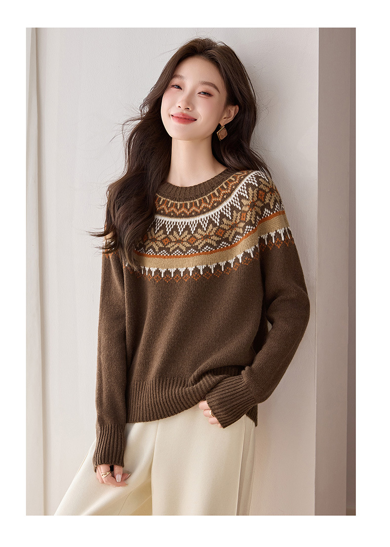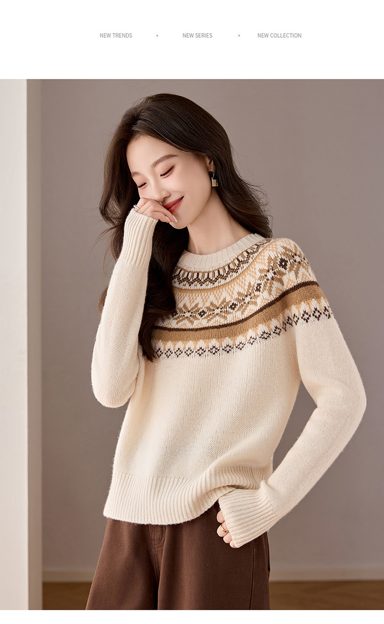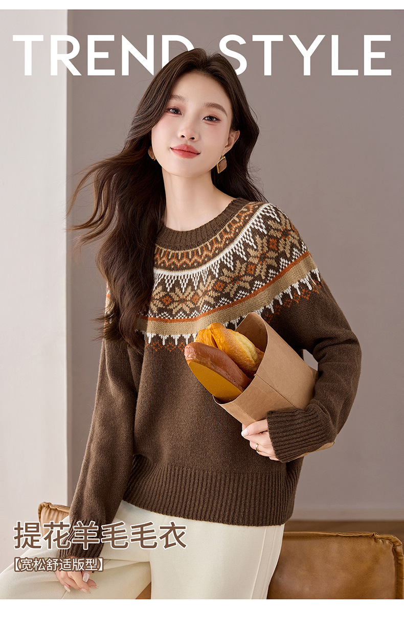 CC100纯羊毛费尔岛圆领毛衣女秋冬厚款慵懒风提花针织打底衫内搭