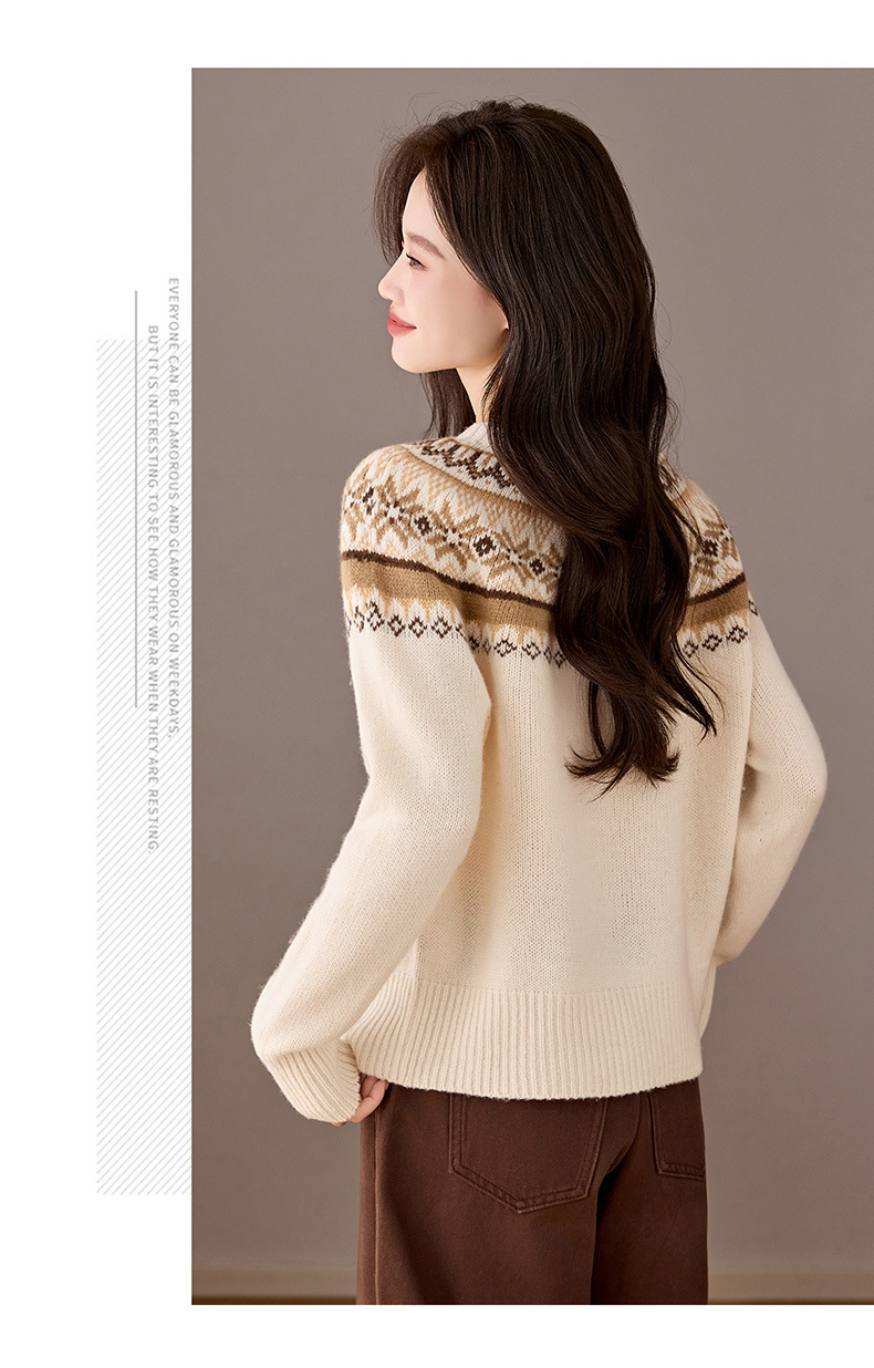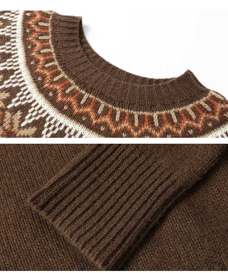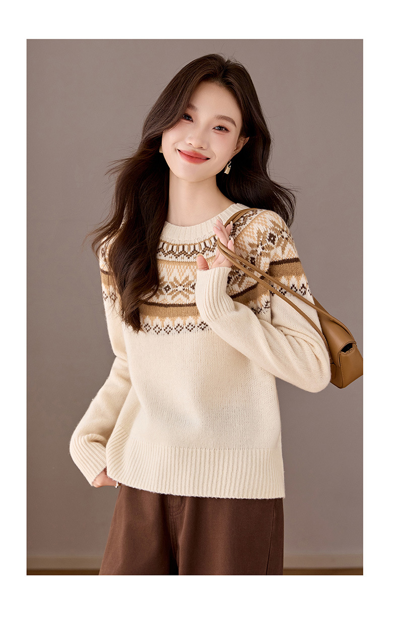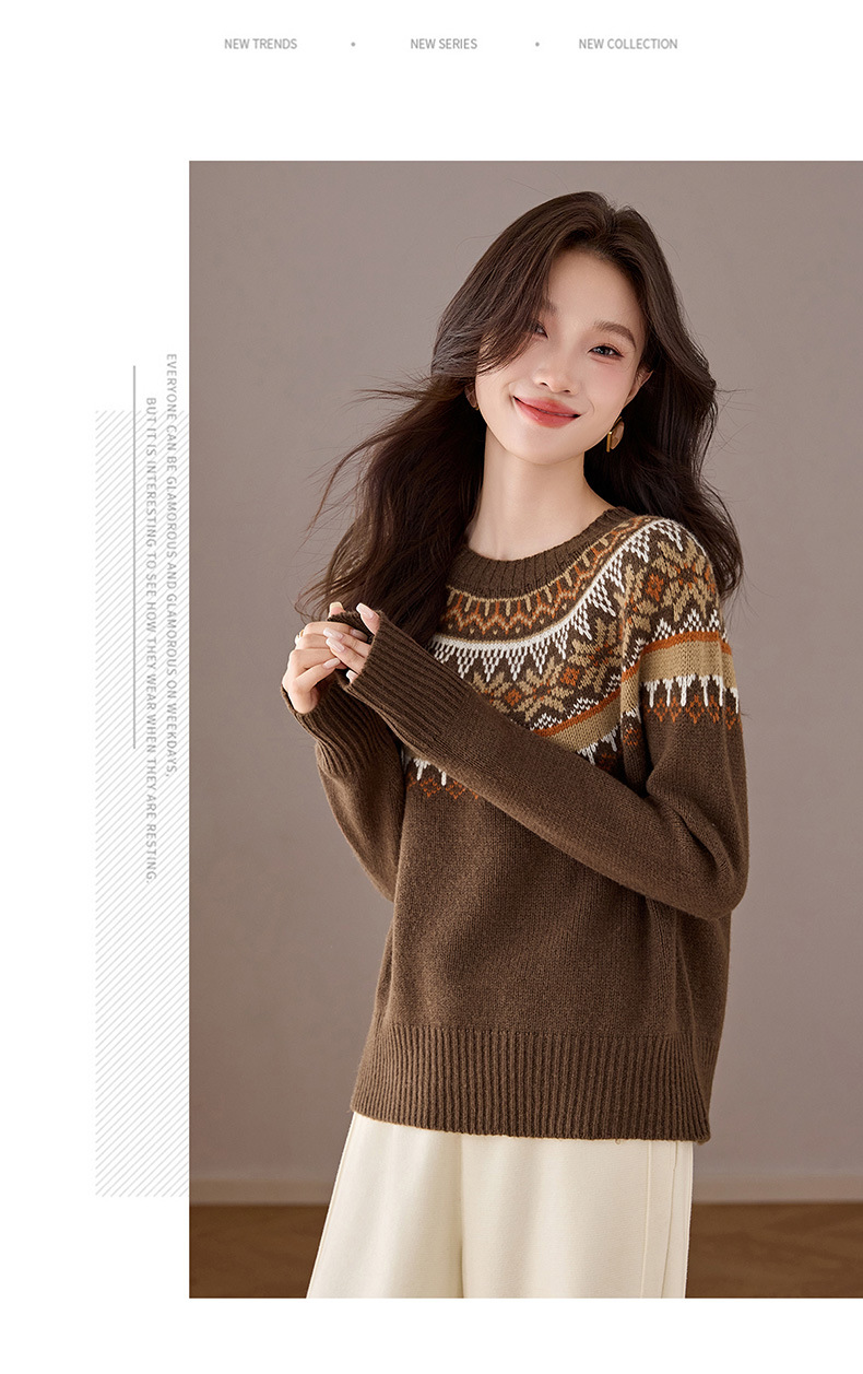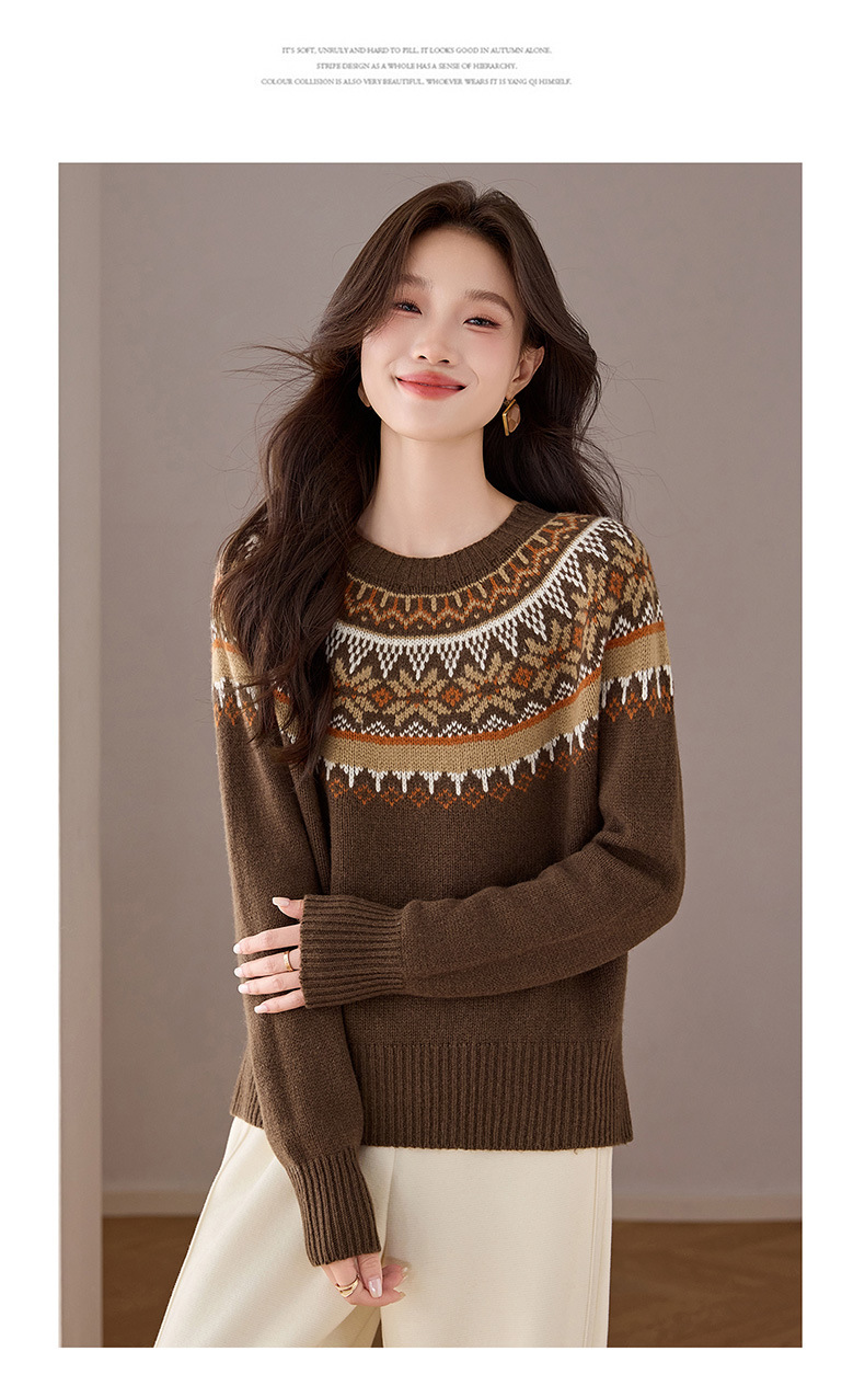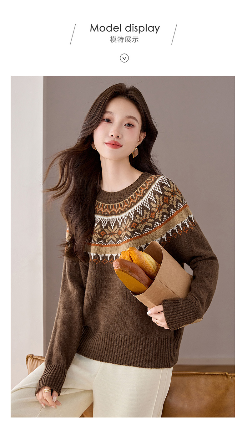 CC100纯羊毛费尔岛圆领毛衣女秋冬厚款慵懒风提花针织打底衫内搭