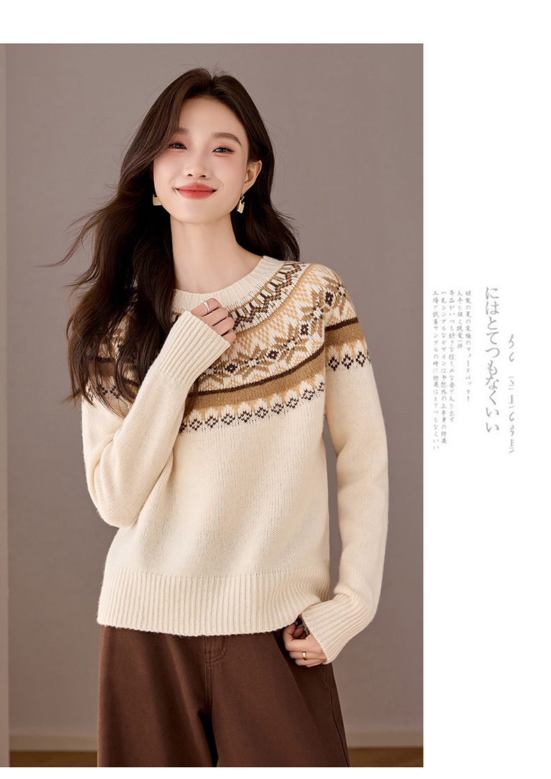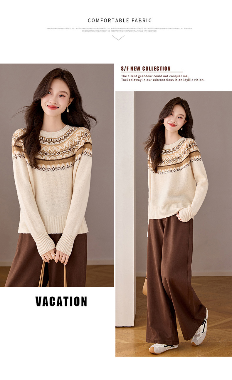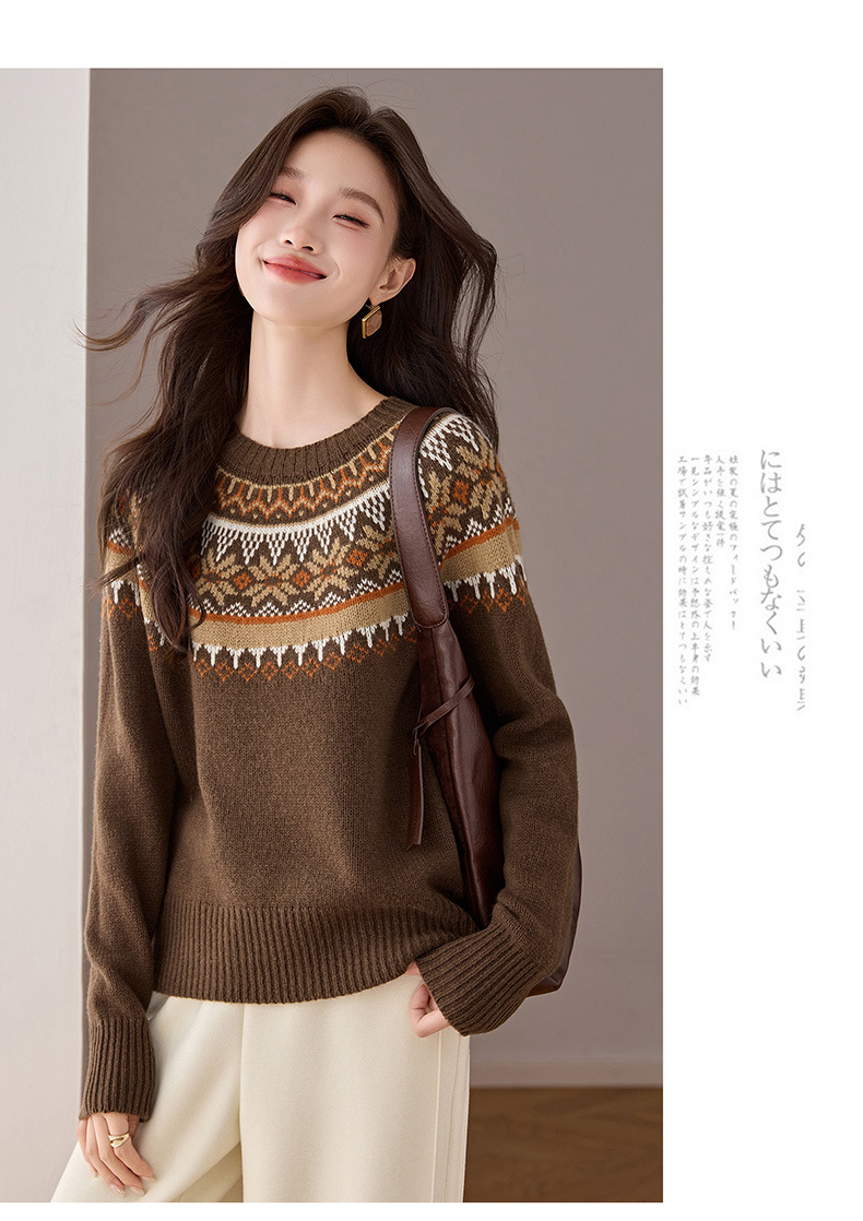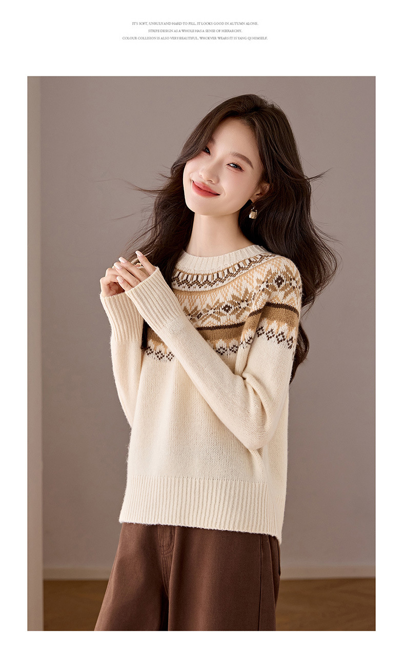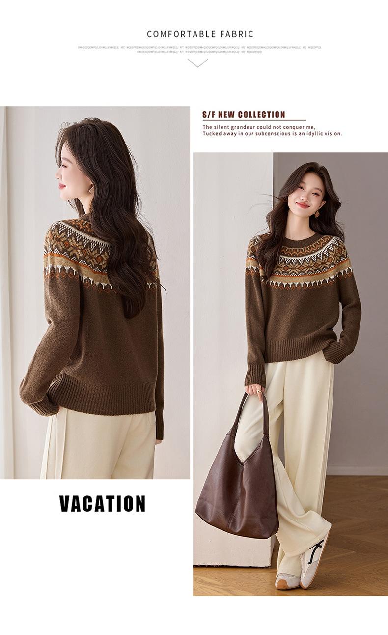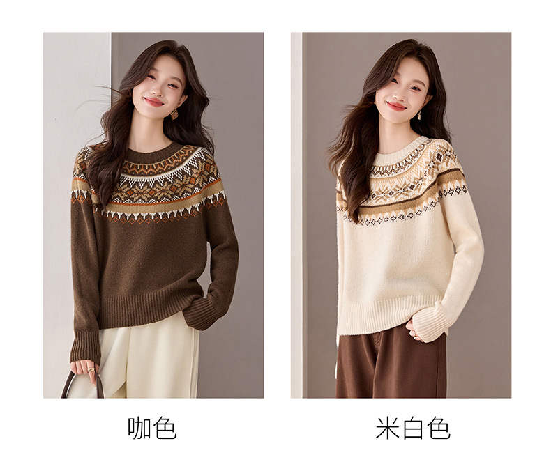 CC100纯羊毛费尔岛圆领毛衣女秋冬厚款慵懒风提花针织打底衫内搭