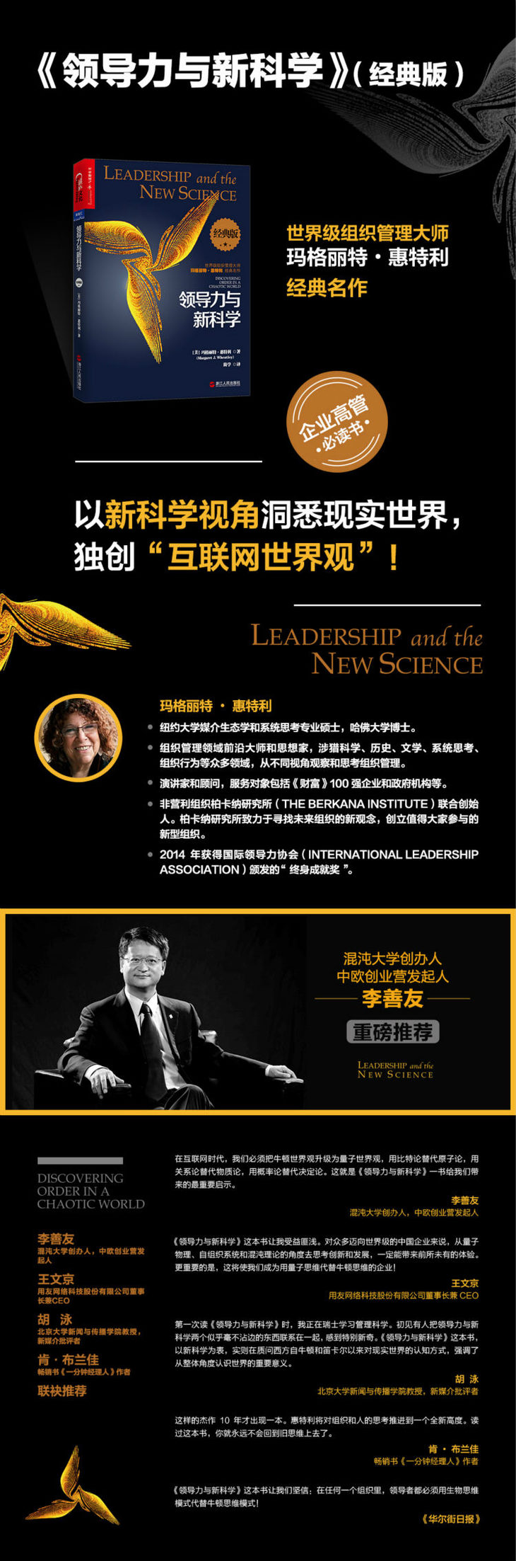 l 本书从科学理论中提炼了一些原则,它们一起构成了领导力的“新科学”。这一新的世界观能够告诉我们该如何感知世界。将来我们还会有很多的发现,我希望有更多的读者参与到这一“发现之旅”中来。
