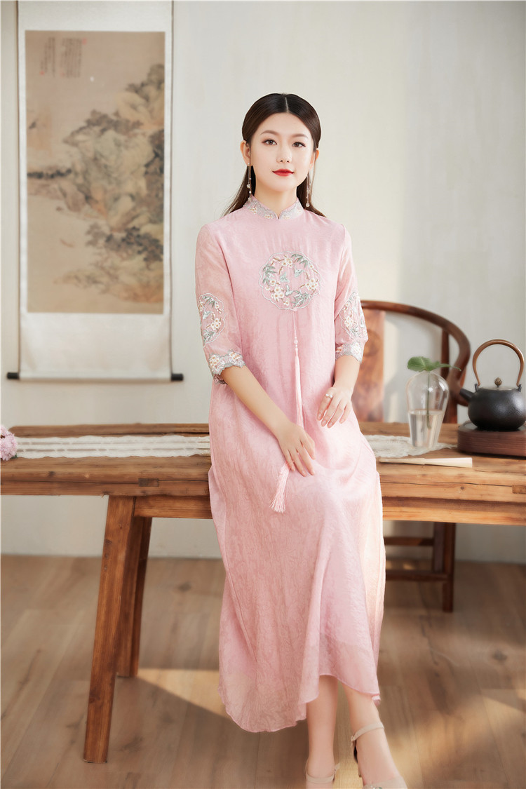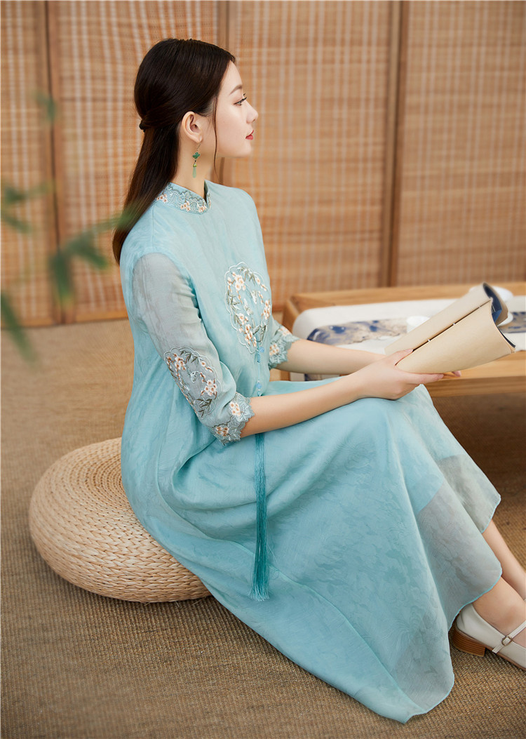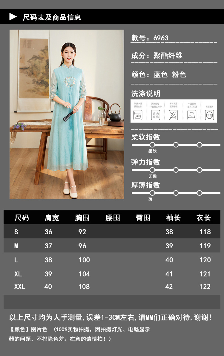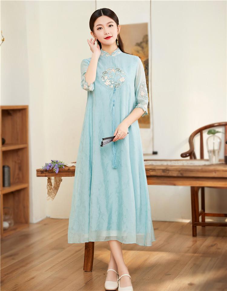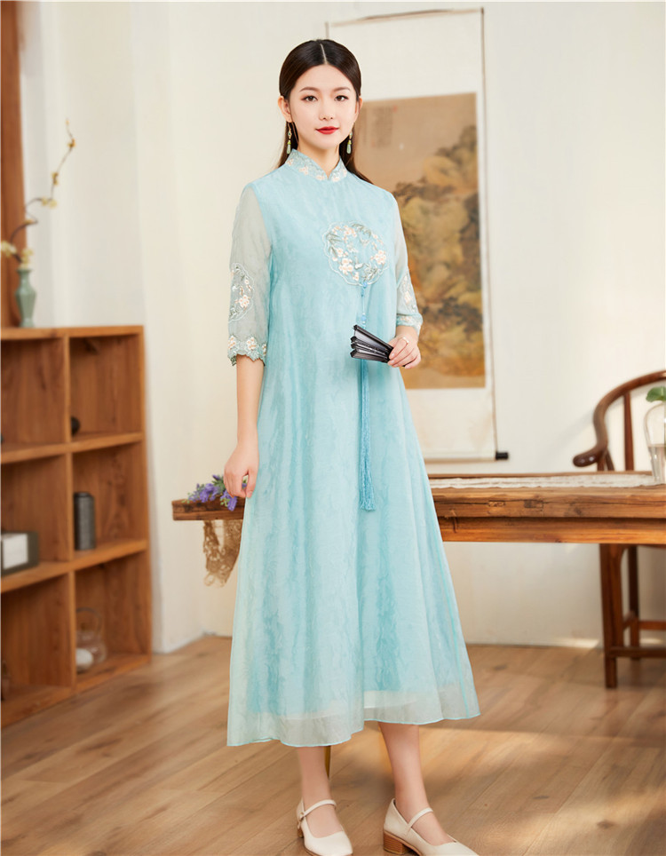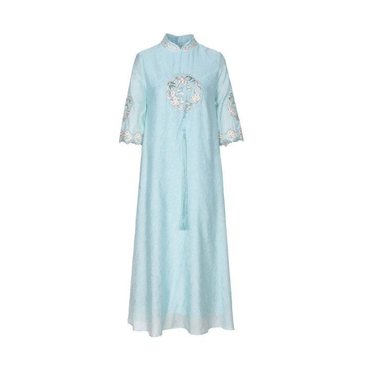 YFN-6963春夏女装新款中国风复古天丝刺绣宽松禅意茶服中长款连衣裙