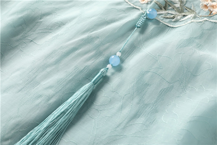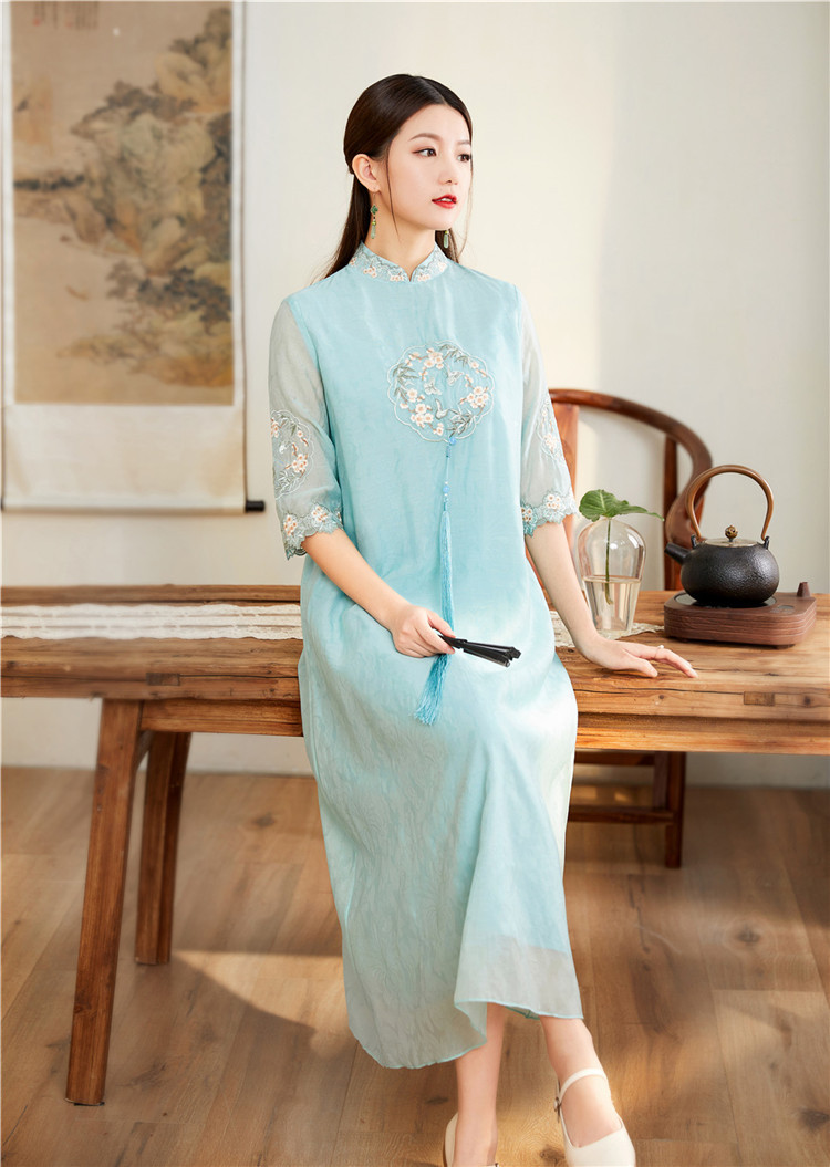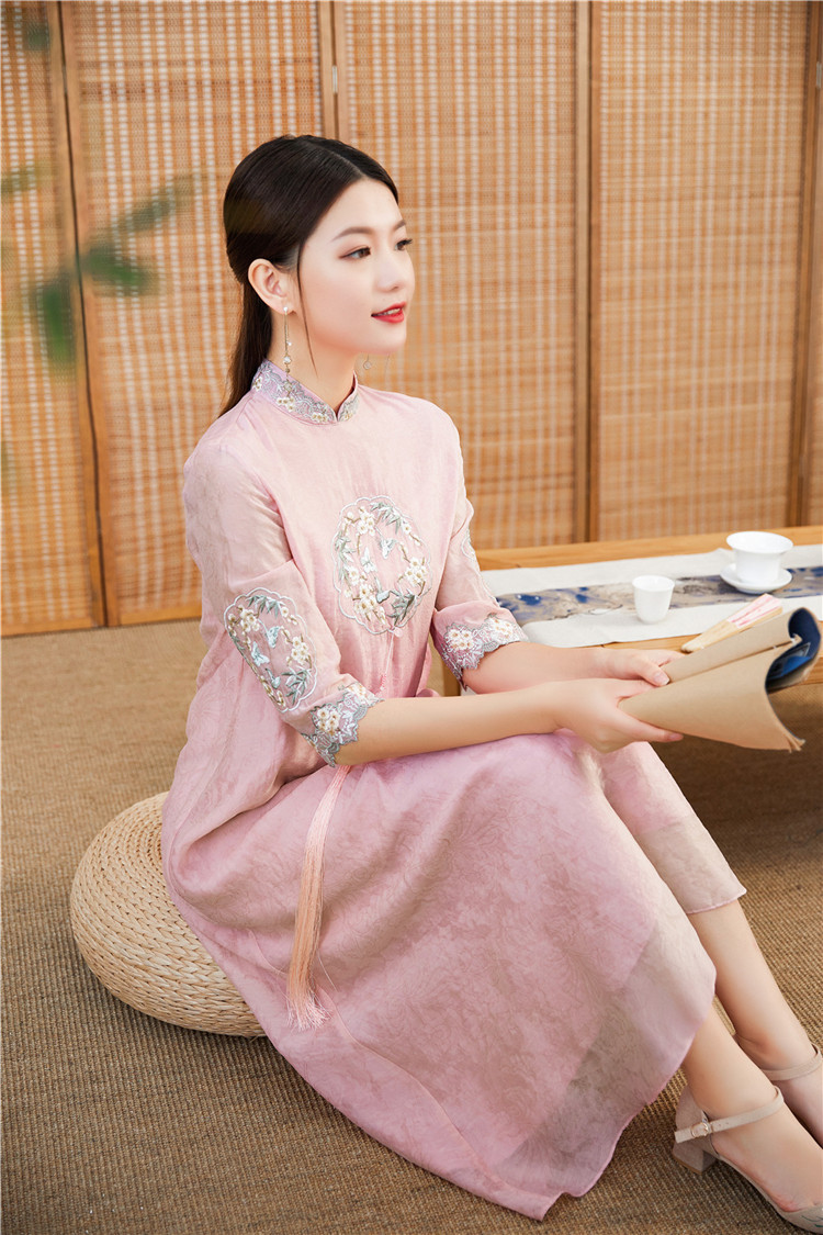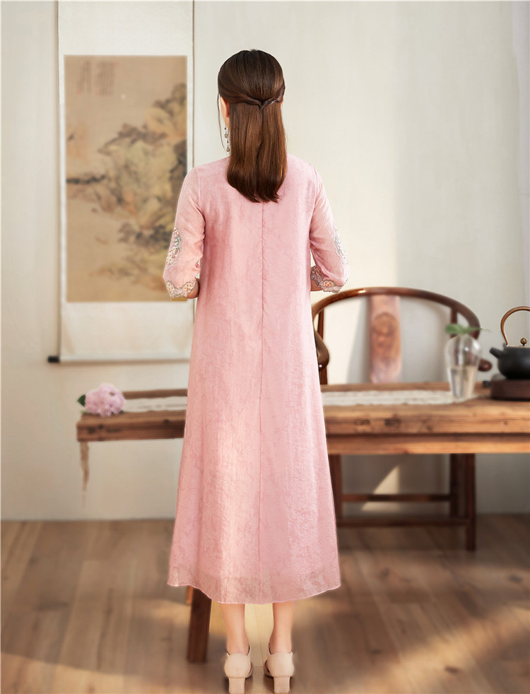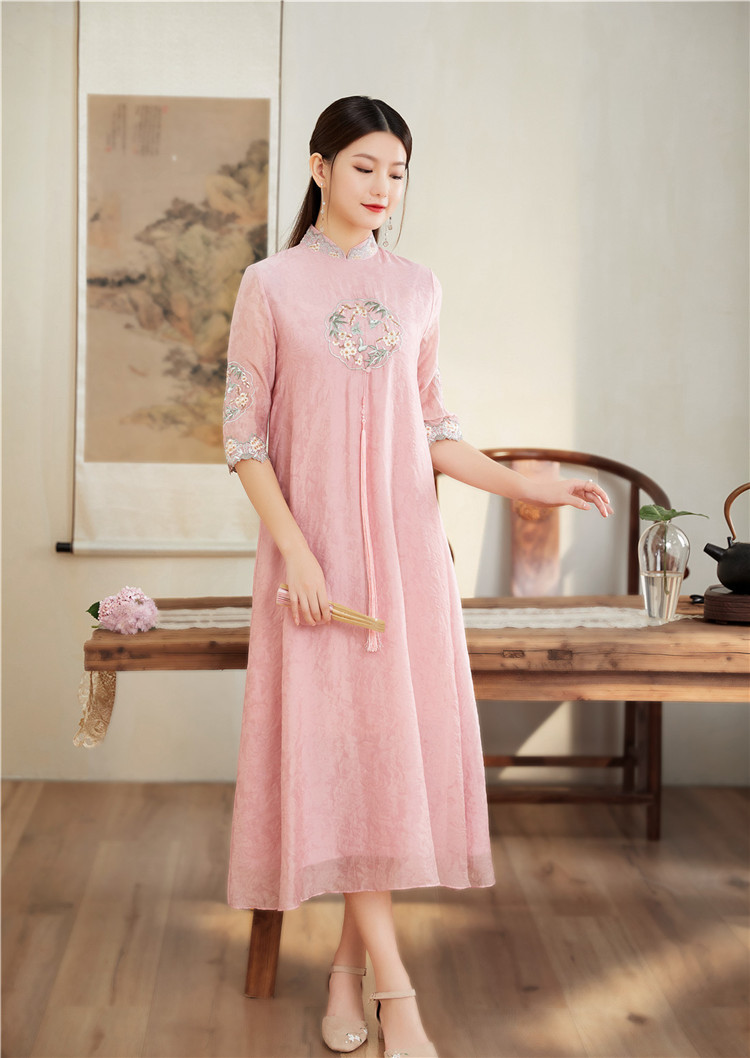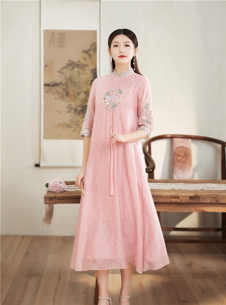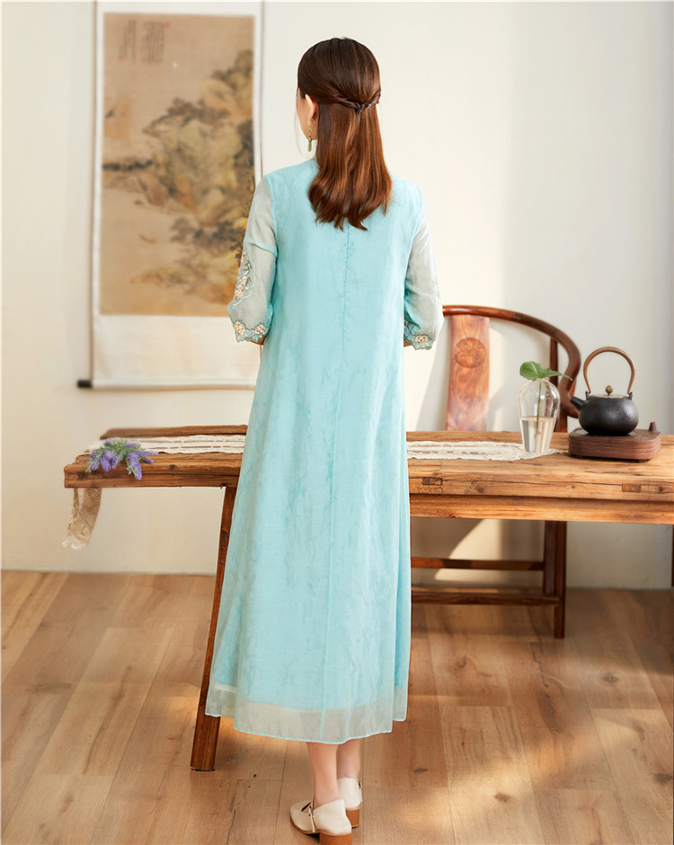 YFN-6963春夏女装新款中国风复古天丝刺绣宽松禅意茶服中长款连衣裙