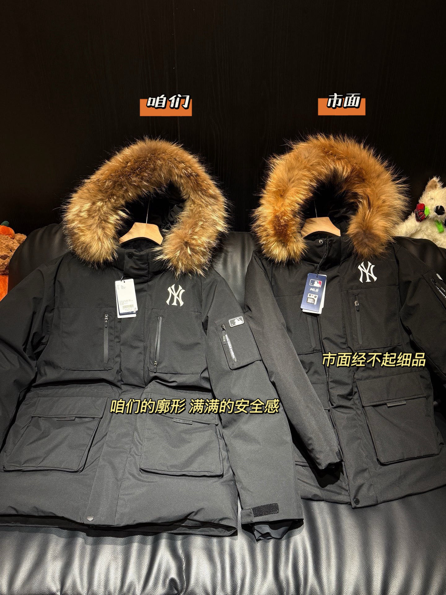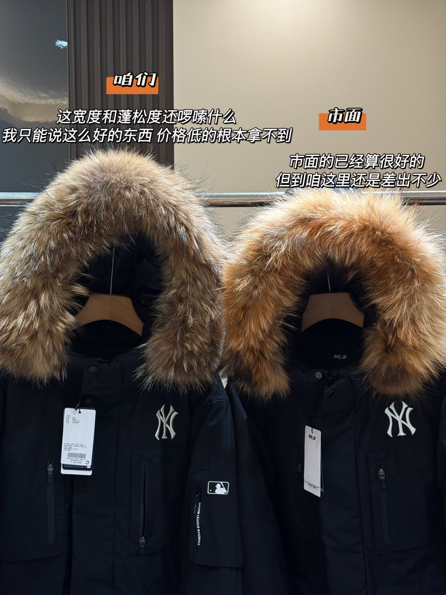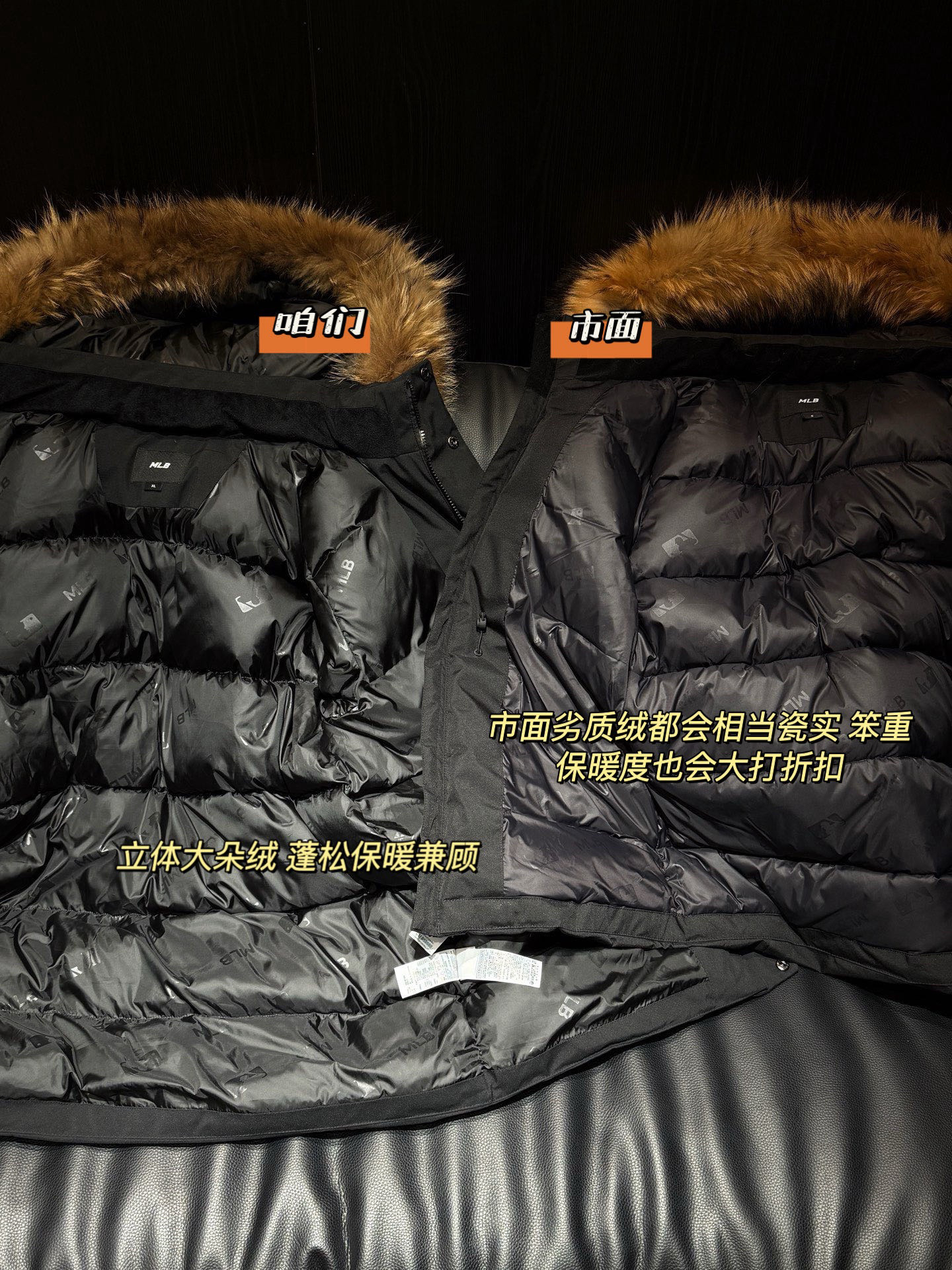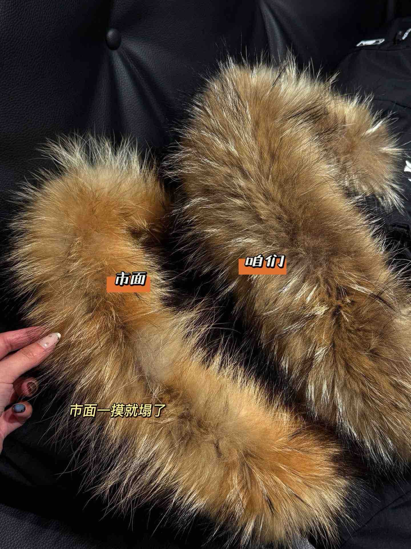 还有充绒 先不论市面是什么填充 就说这版型小一圈 充绒量自然就少了 相信我 市面是不会给你朵绒的毛领🆚对比