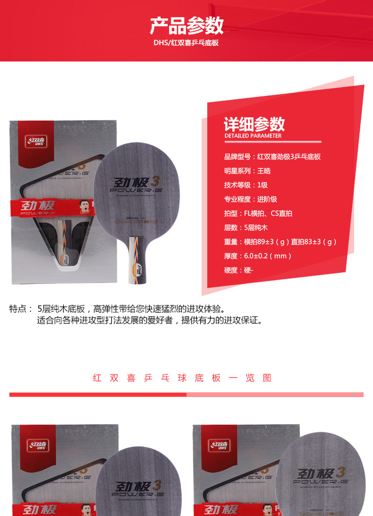 DHS红双喜劲极3乒乓球拍底板专业5层纯木进攻型弧圈打法初学进阶用乒乓球底板