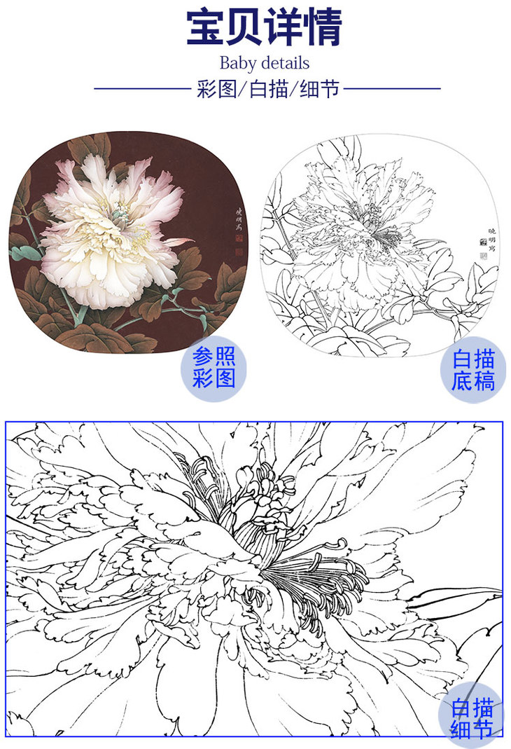 横幅工笔花鸟白描底稿-王庆升牡丹孔雀-《春晖》-多种白描尺寸可选-QA02