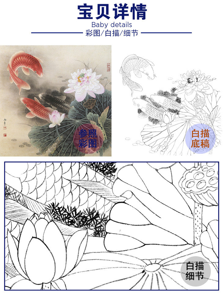 工笔花鸟白描底稿-路雨年-荷花鲤鱼-斗方小品册页-A273