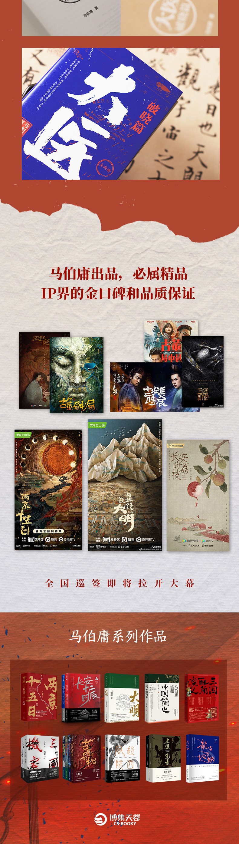 代表作:《两京十五日》《显微镜下的大明》《长安十二时辰》《古董局中局》《三国机密》《风起陇西》《草原动物园》《七侯笔录》《龙与地下铁》《马伯庸笑翻中国简史》《三国配角演义》。