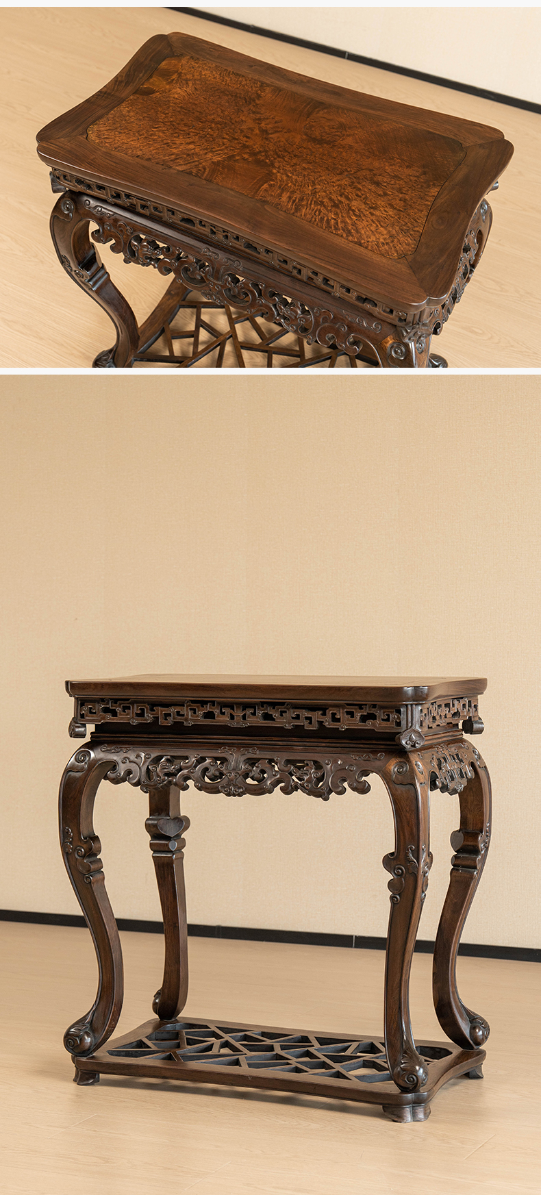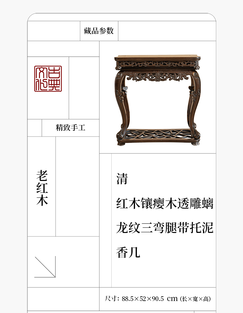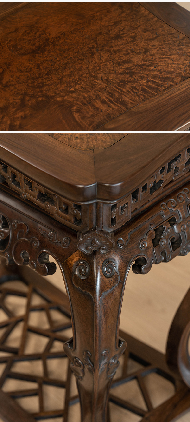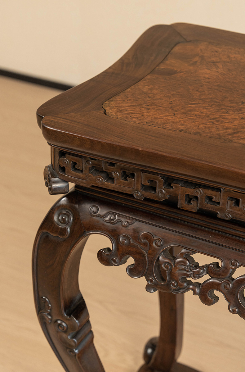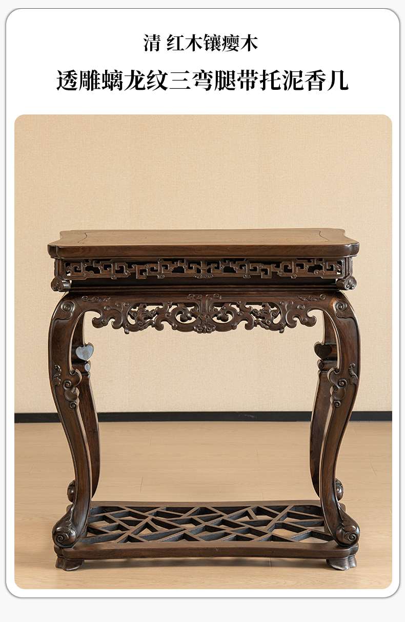 清 红木镶瘿木透雕螭龙纹三弯腿带托泥香几