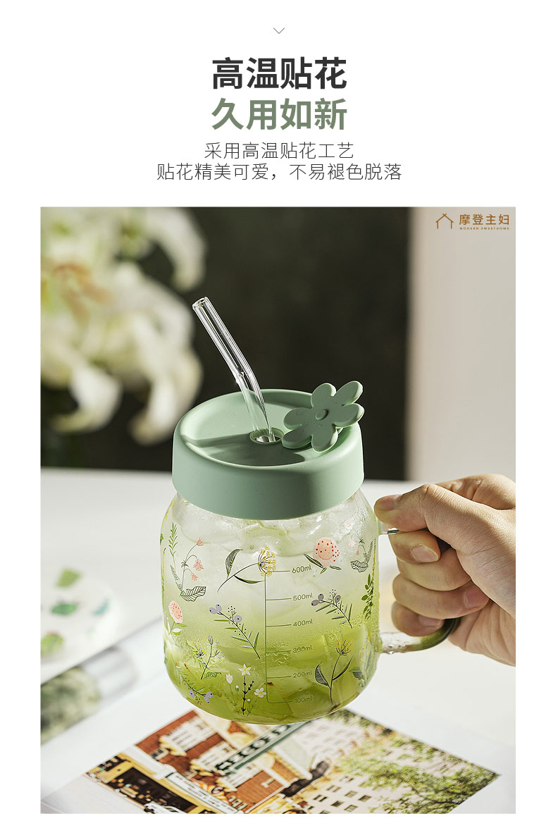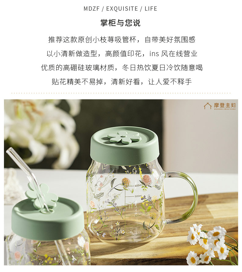 摩登主妇小草苓玻璃杯子女2023新款水杯办公室吸管水杯咖啡牛奶杯