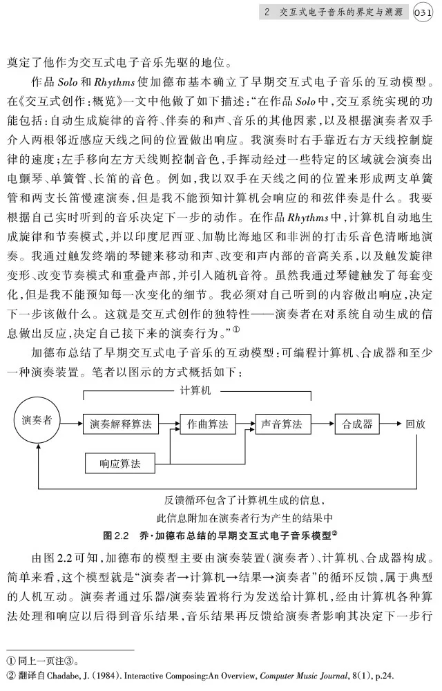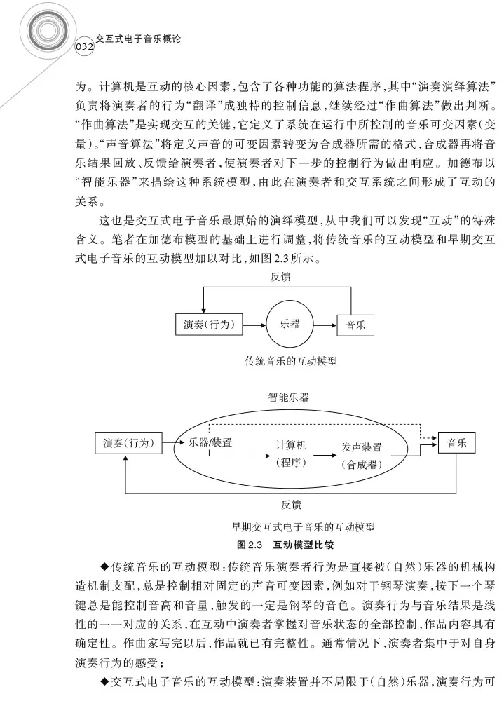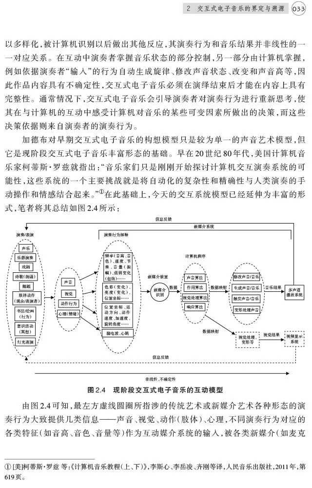 交互式电子音乐是一种新媒介艺术重要形态,即以计算机和数字技术为核心的新媒介系统,在现场表演/作品呈现的过程中实时生成或配置新的声音材料,使新媒介系统的输入行为与输出音乐(声音)内容之间表现出“交互”特征的新媒介艺术形态。本书共五章:交互式电子音乐的界定与历史溯源、多媒融合创作特征、丰富样态,新媒介技术对交互式电子音乐的深入影响、交互式电子音乐的未来之路,主要面向对电子音乐、新媒介艺术感兴趣的读者或相关专业师生了解、学习交互式电子音乐。