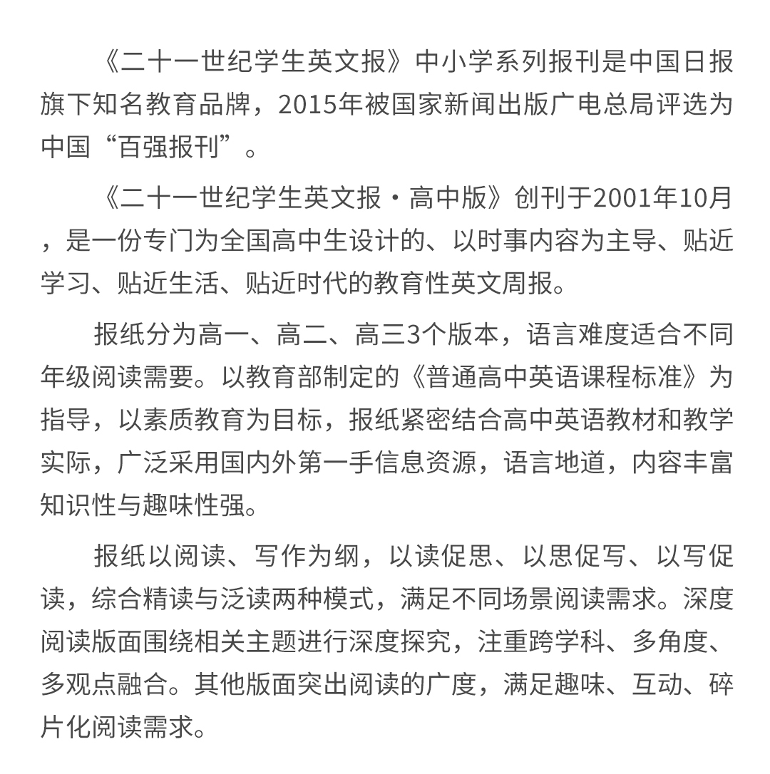 【全年月投】 | 《二十一世纪学生英文报》初中版 / 高中版(2025年12月至2026年11月 )全年预订 寒暑假休刊