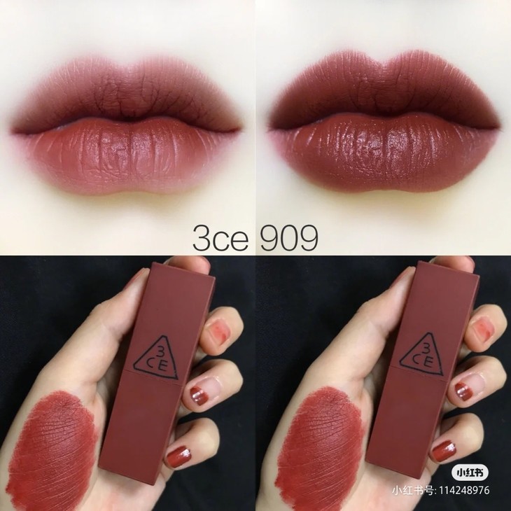 3CE 方管口红#909👍是我永远永远都不会丢弃的红棕口红,复古砖红色,🍁饱和度超好,无敌显白,对黄黑皮相当友好,哑光雾面妆感,💭非常持久的一支口红,不用怕掉色。建议涂前做好唇部打底哟~😉