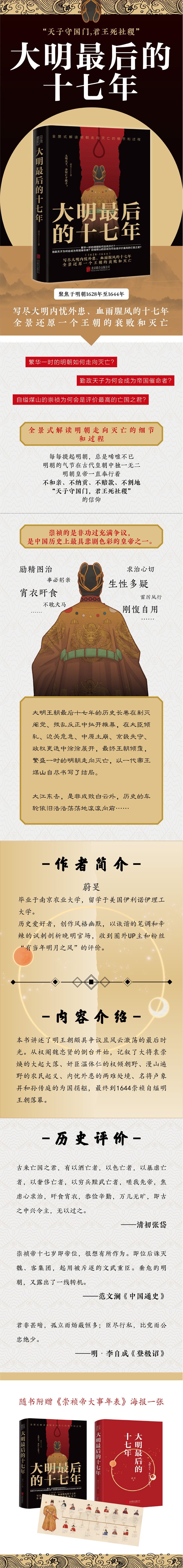 这十七年的历史长卷在剿灭阉党、拨乱反正中拉开帷幕,在大臣倾轧、边关危急、中原土崩、京畿失守、政权更迭中徐徐展开,终王朝倾覆,繁盛一时的明朝走向灭亡,以一代帝王煤山自尽书写了结局。