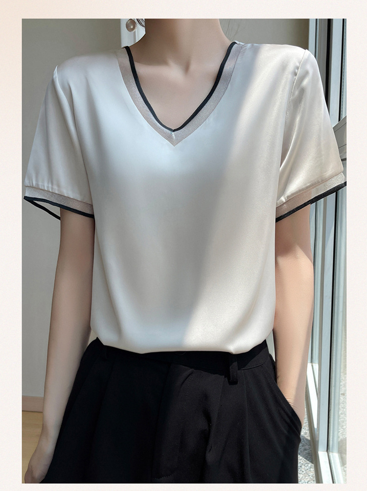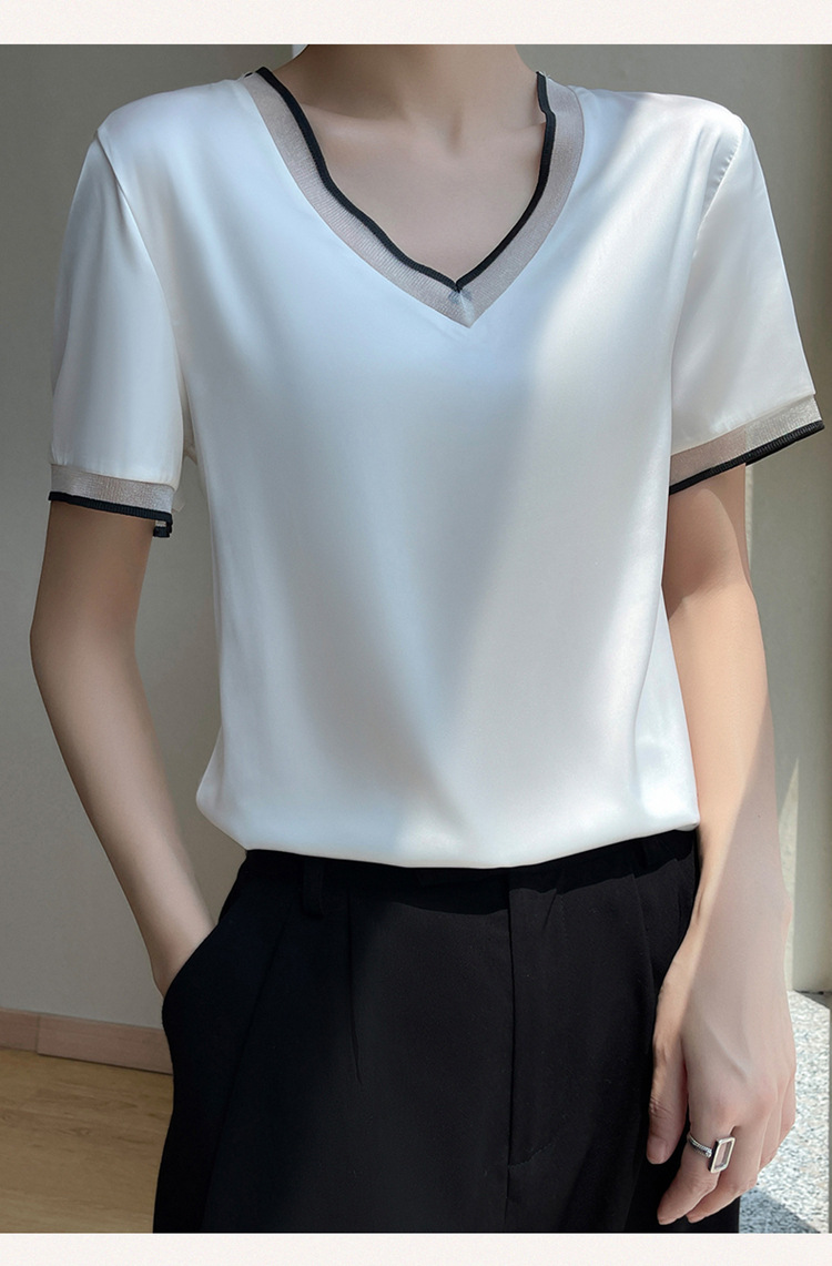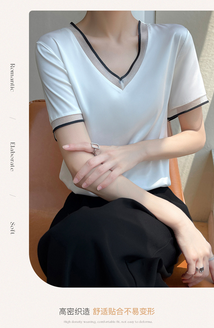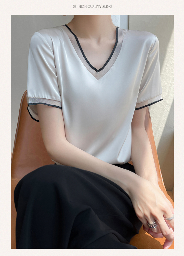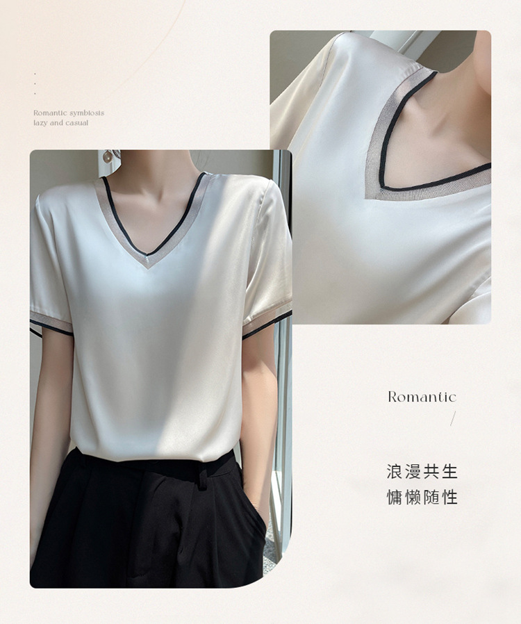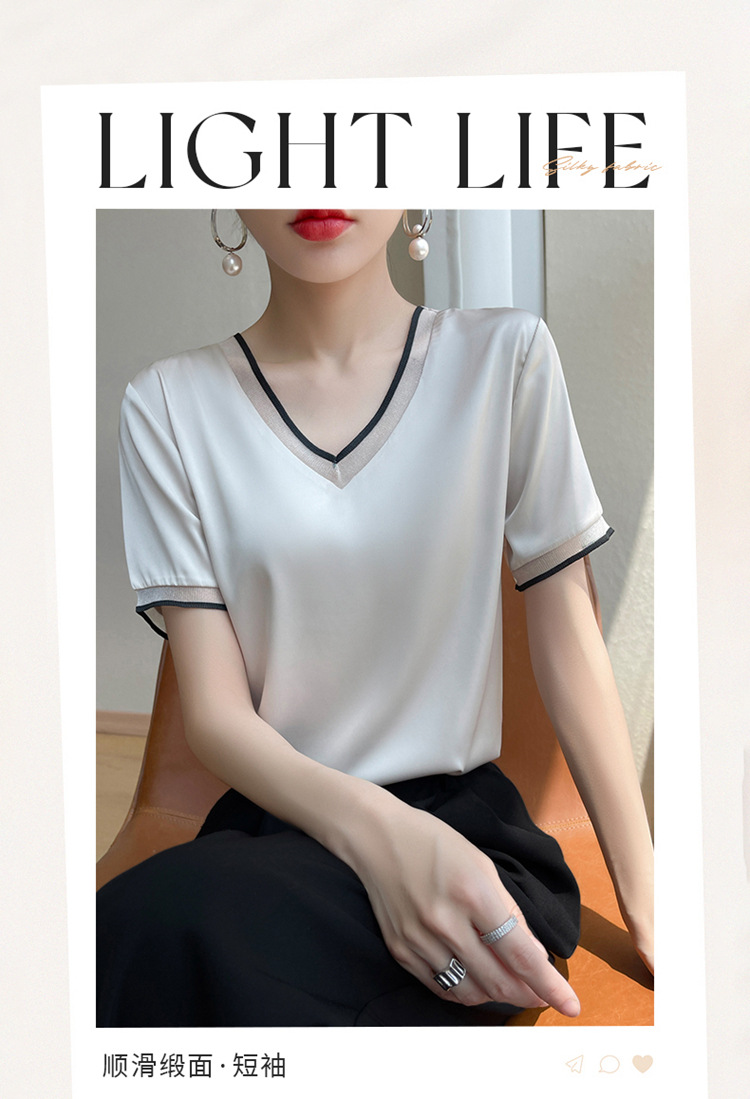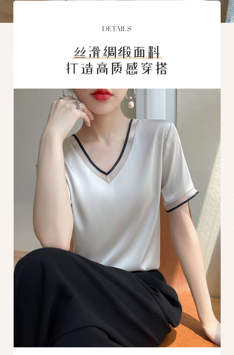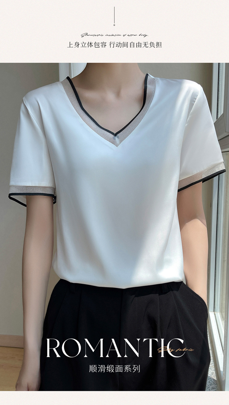 雀说 醋酸缎面短袖t恤女V领显瘦外穿小衫新款夏季宽松撞色大码半袖5ZF-4214