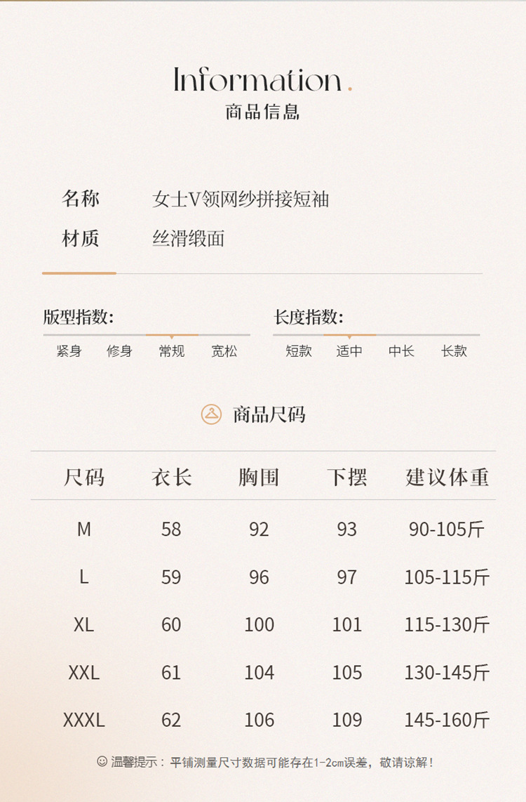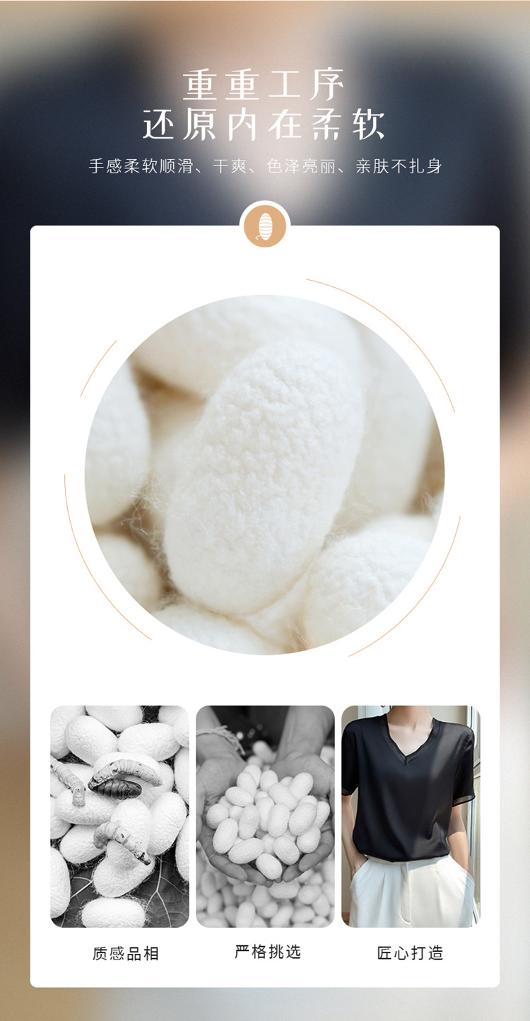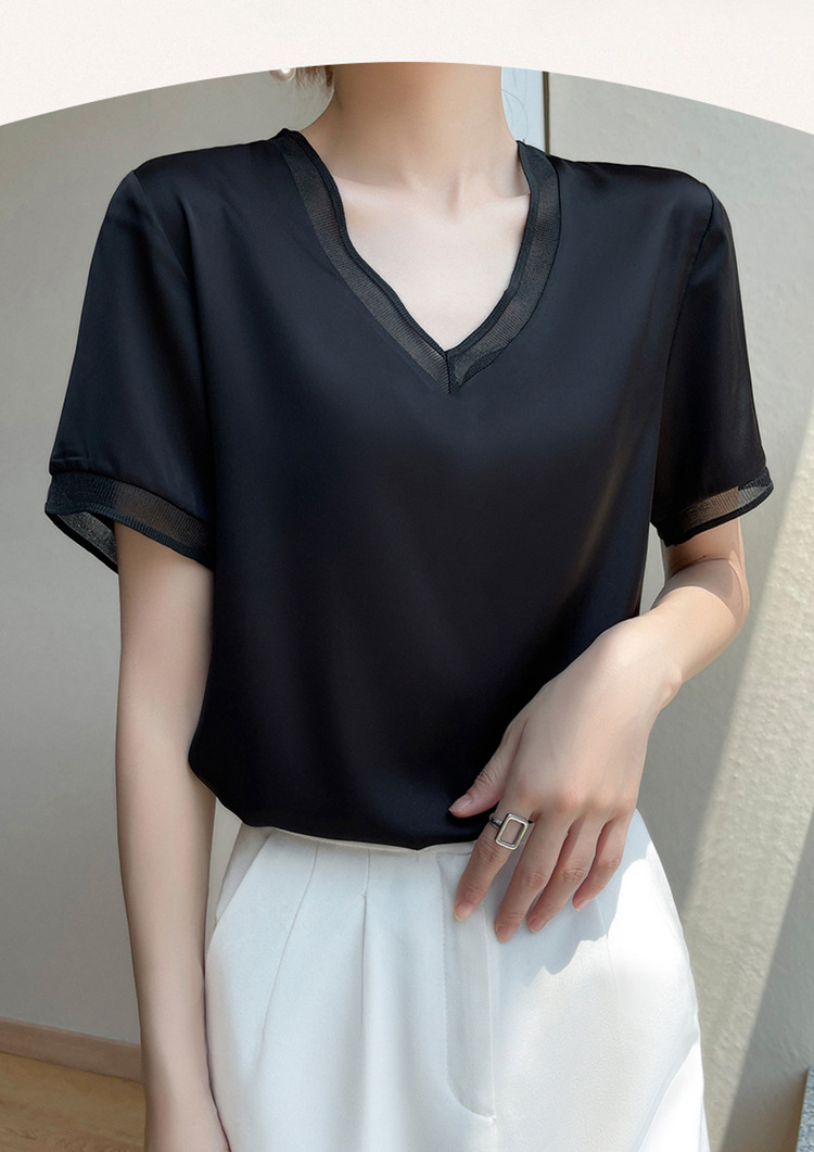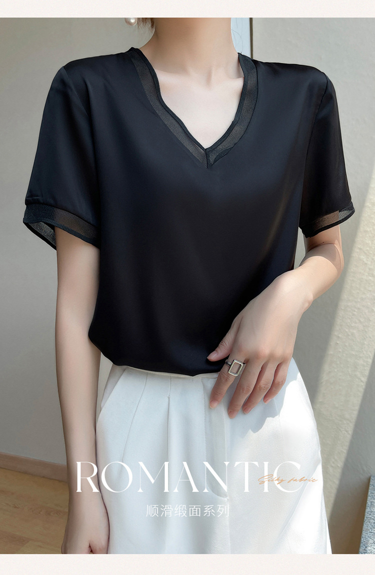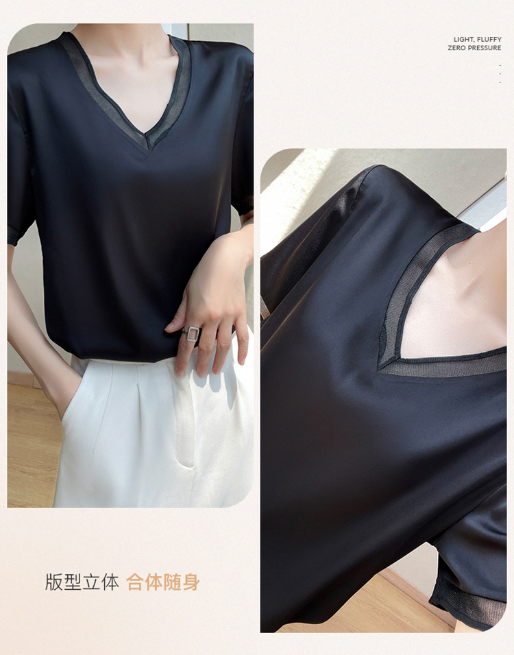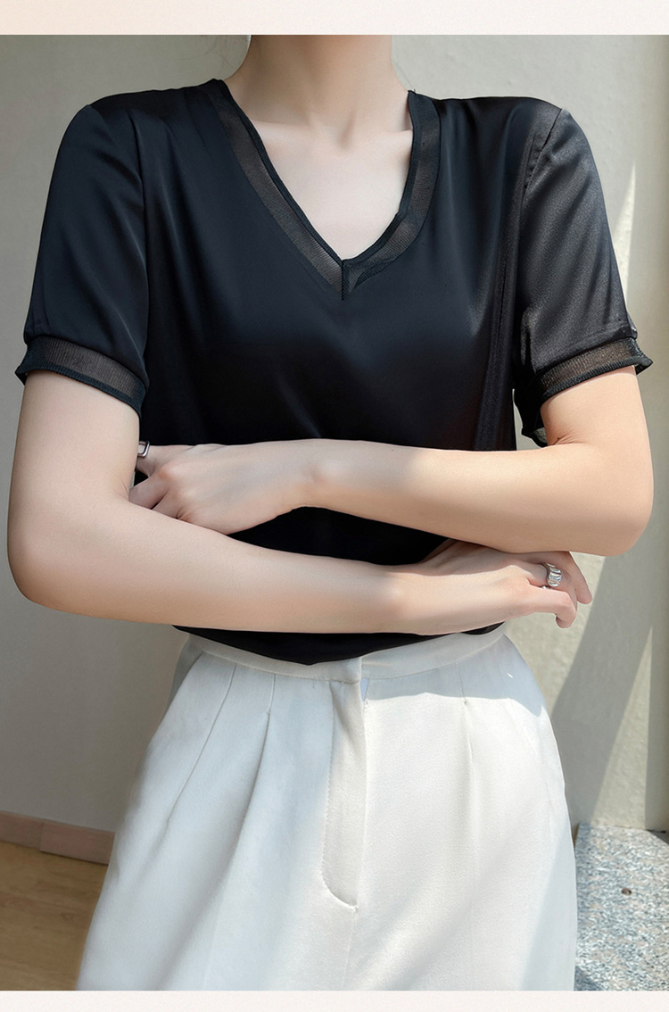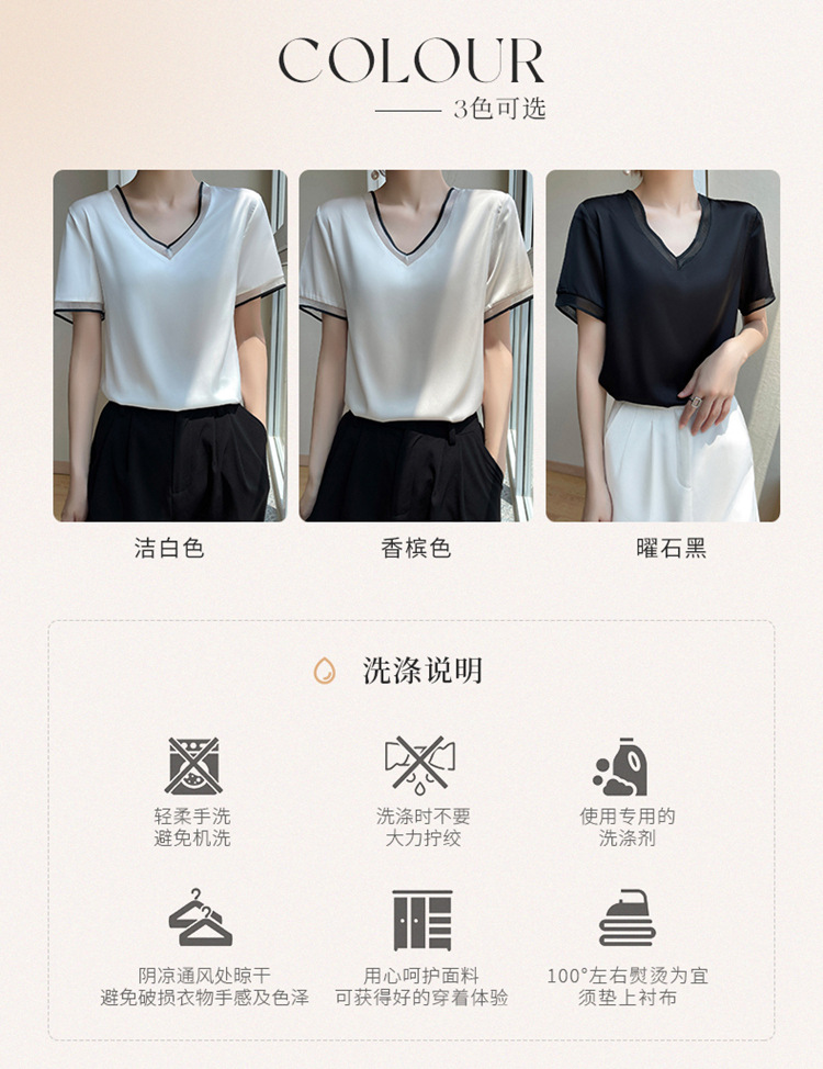 雀说 醋酸缎面短袖t恤女V领显瘦外穿小衫新款夏季宽松撞色大码半袖5ZF-4214