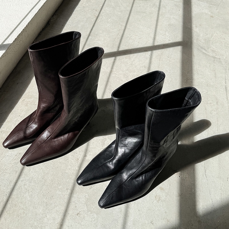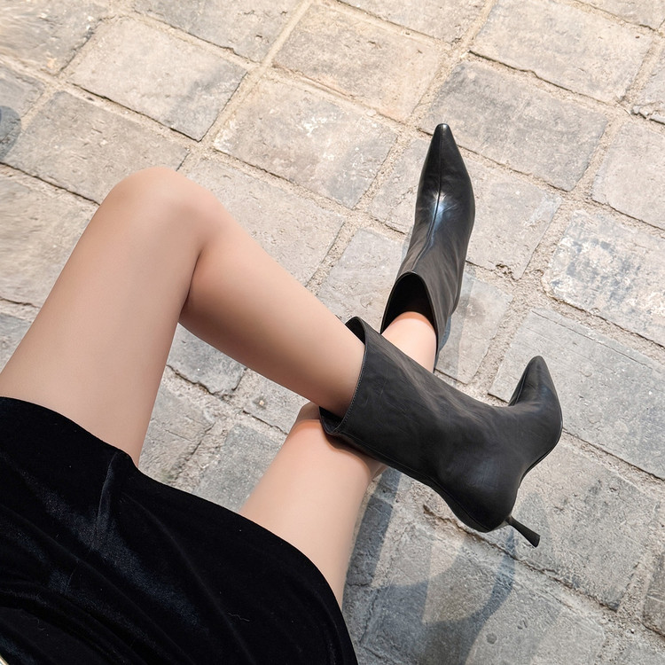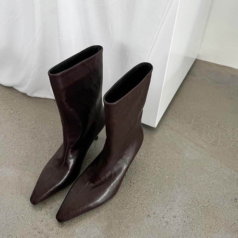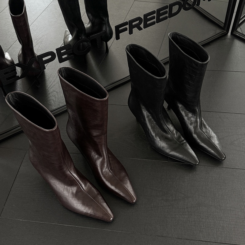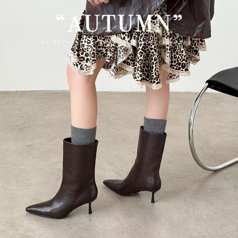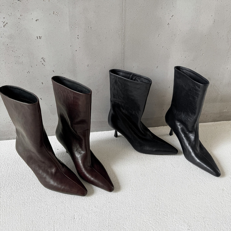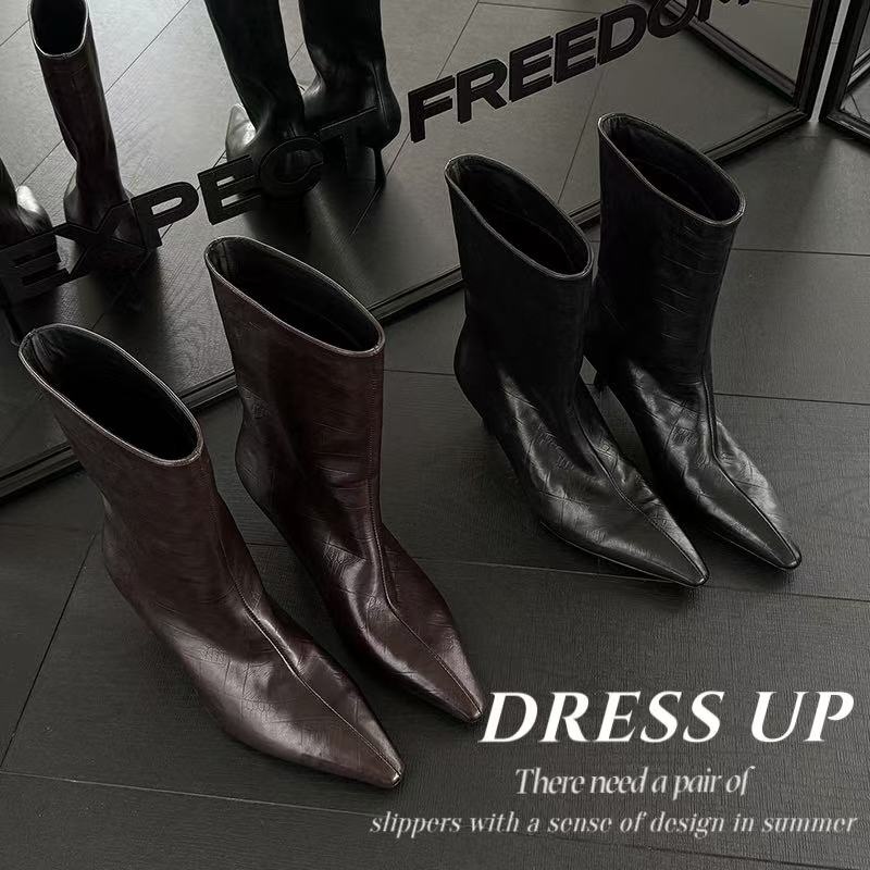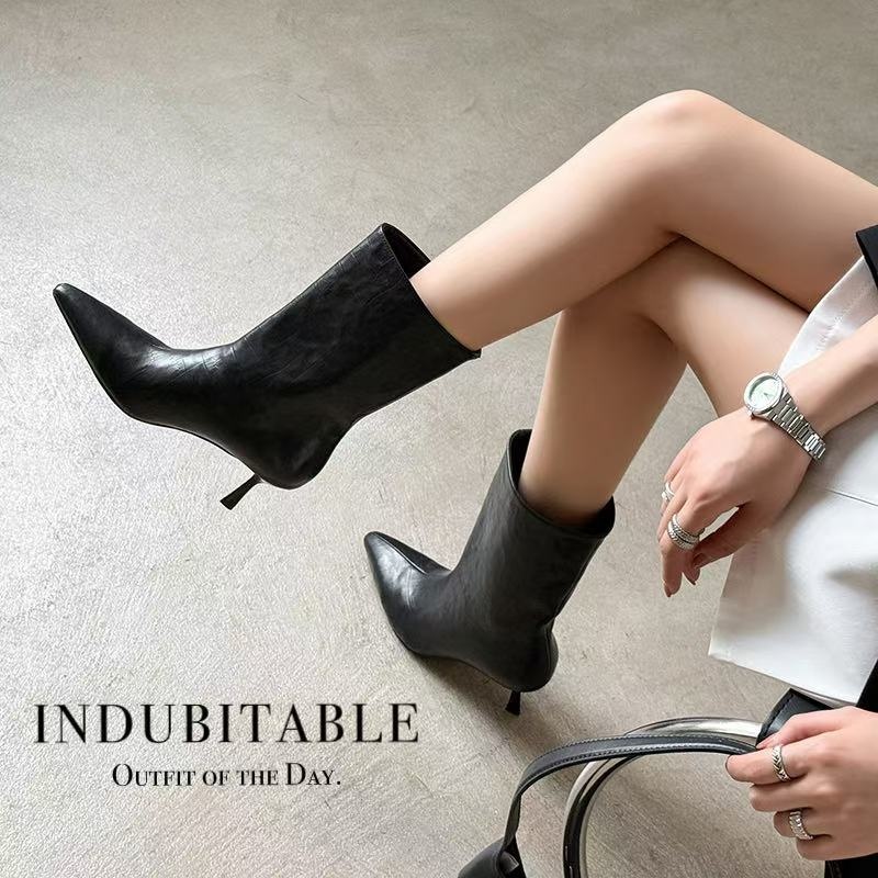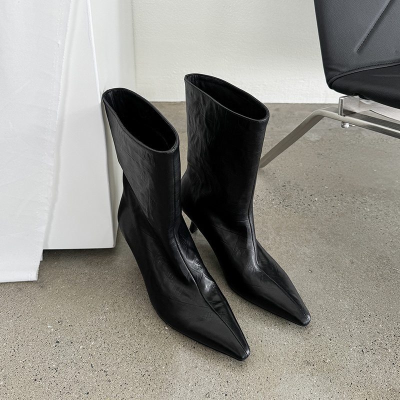 【预售5天】秋冬季牛皮尖头显瘦时装靴高跟鞋一脚蹬加绒大筒围中筒靴子女DY&DY12740